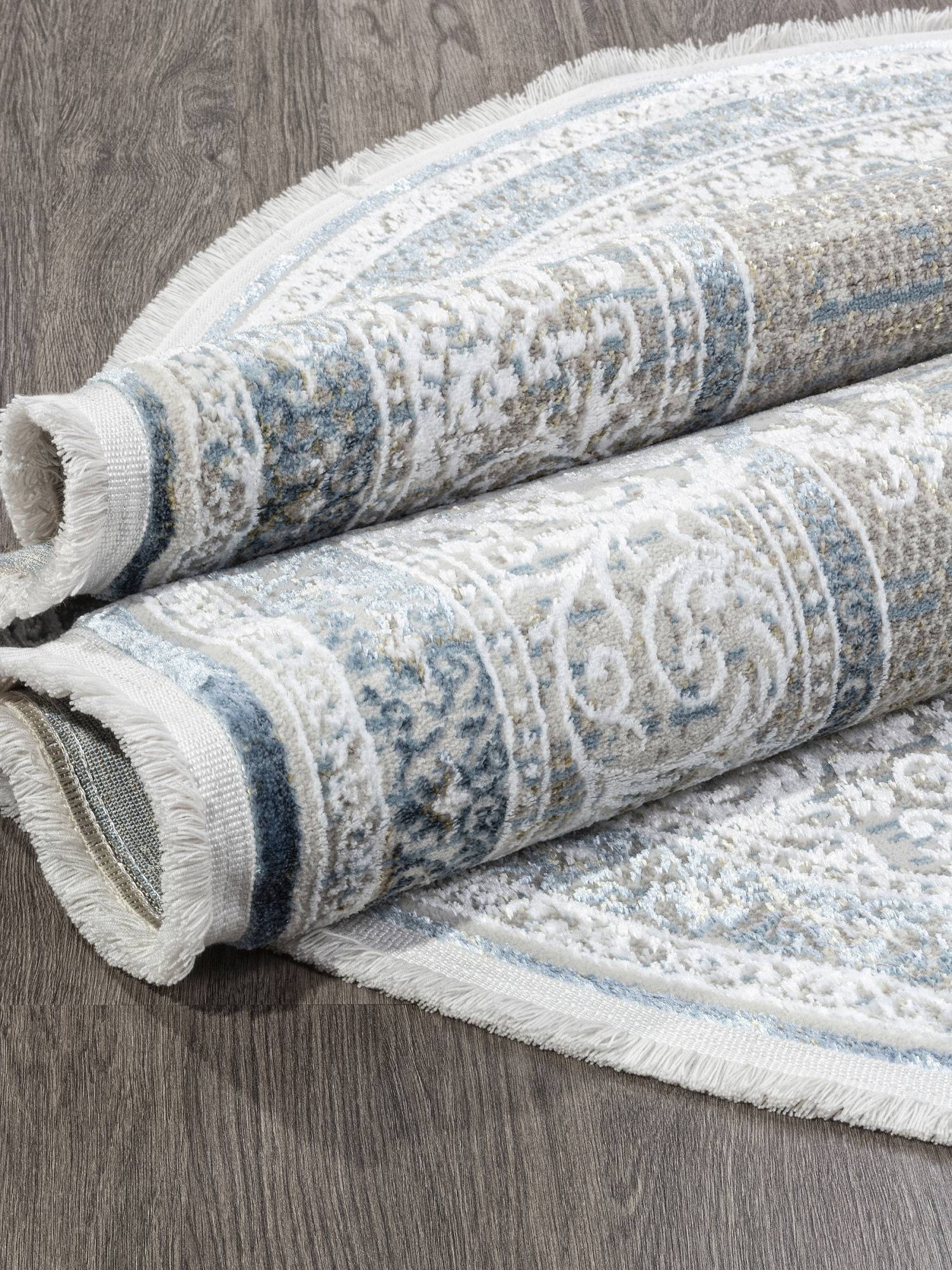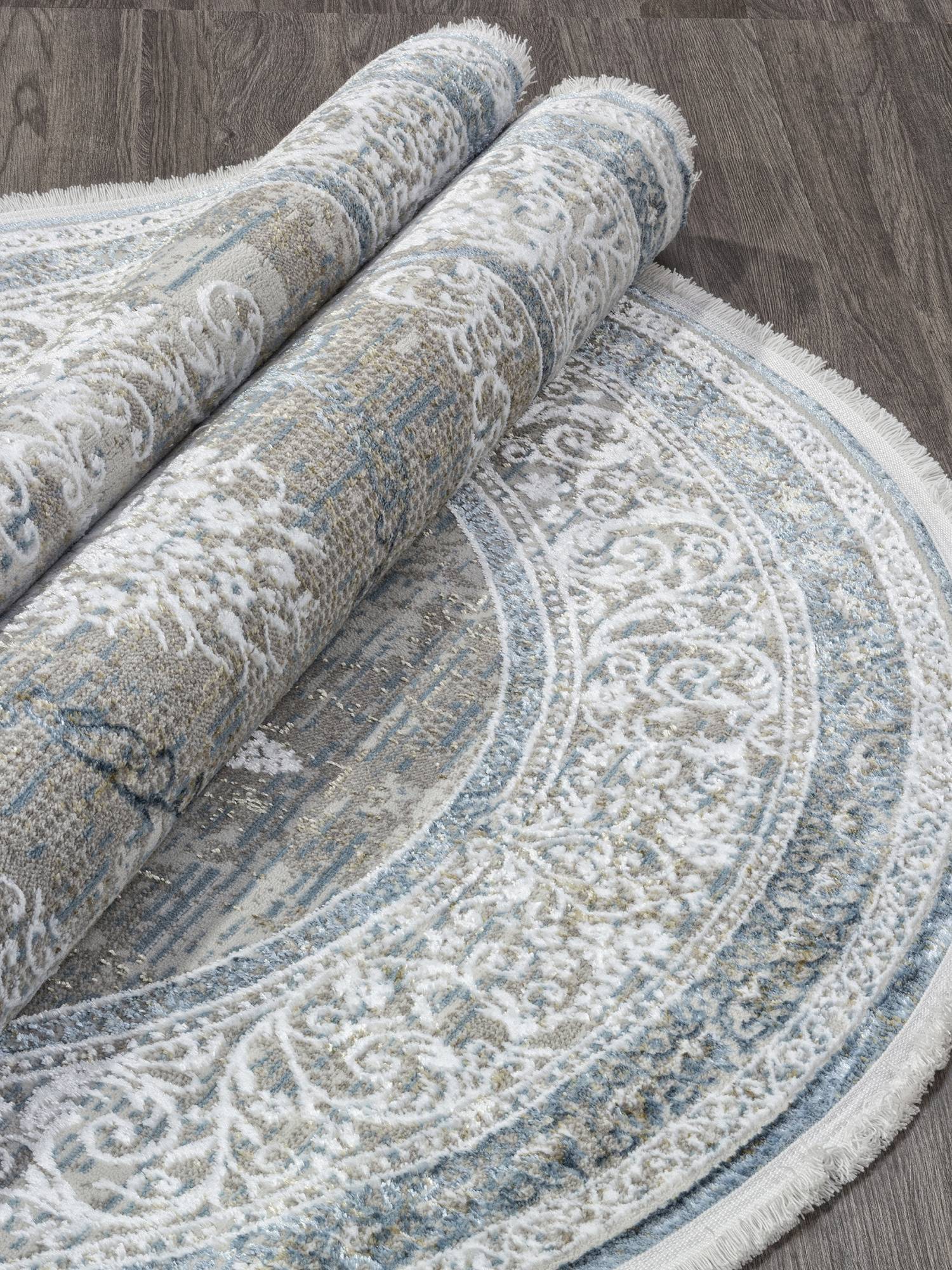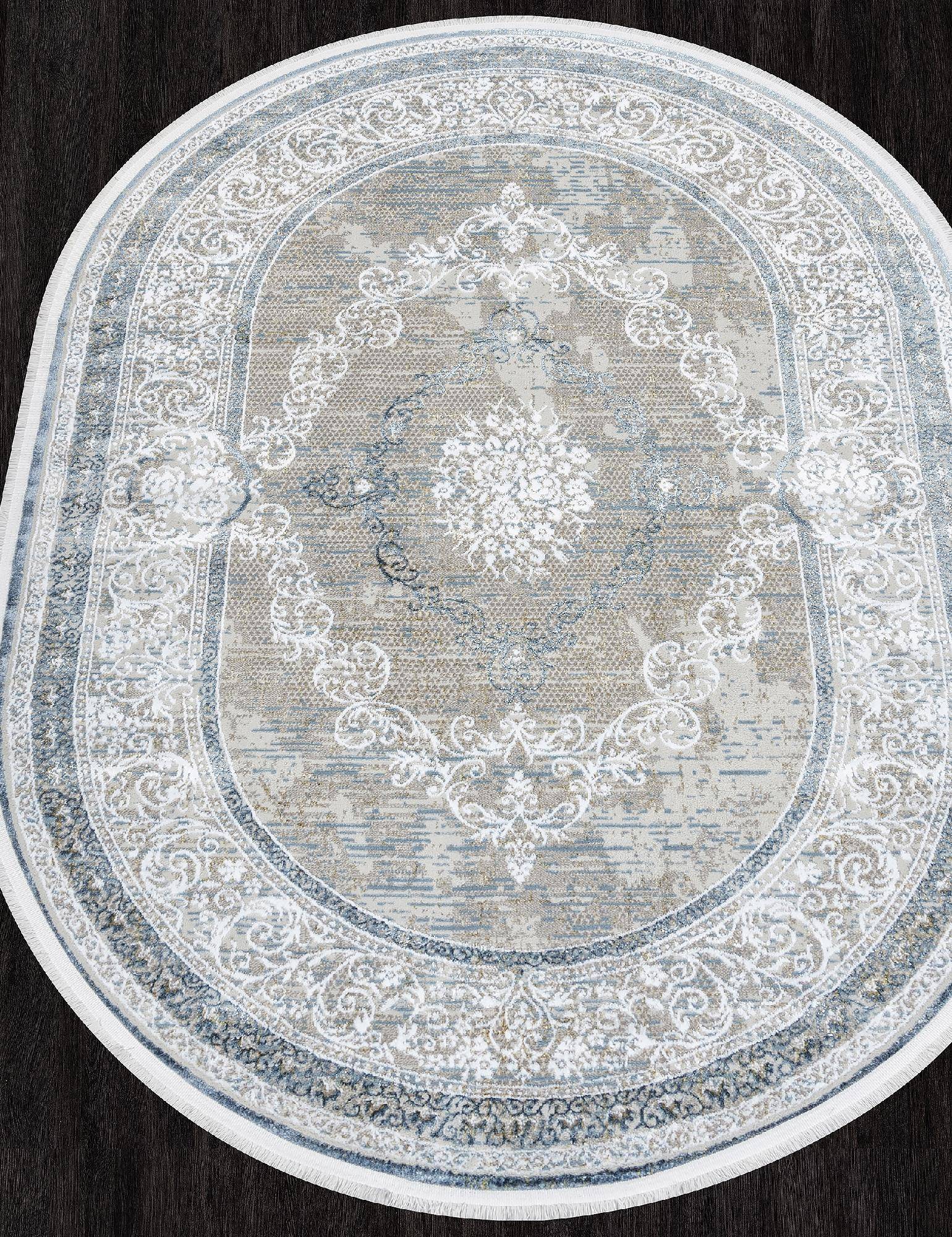Стильный овальный ковер из полиэстера в классическом стиле и серо-синей расцветке. Этот ковер будет отличным украшением для вашего дома.