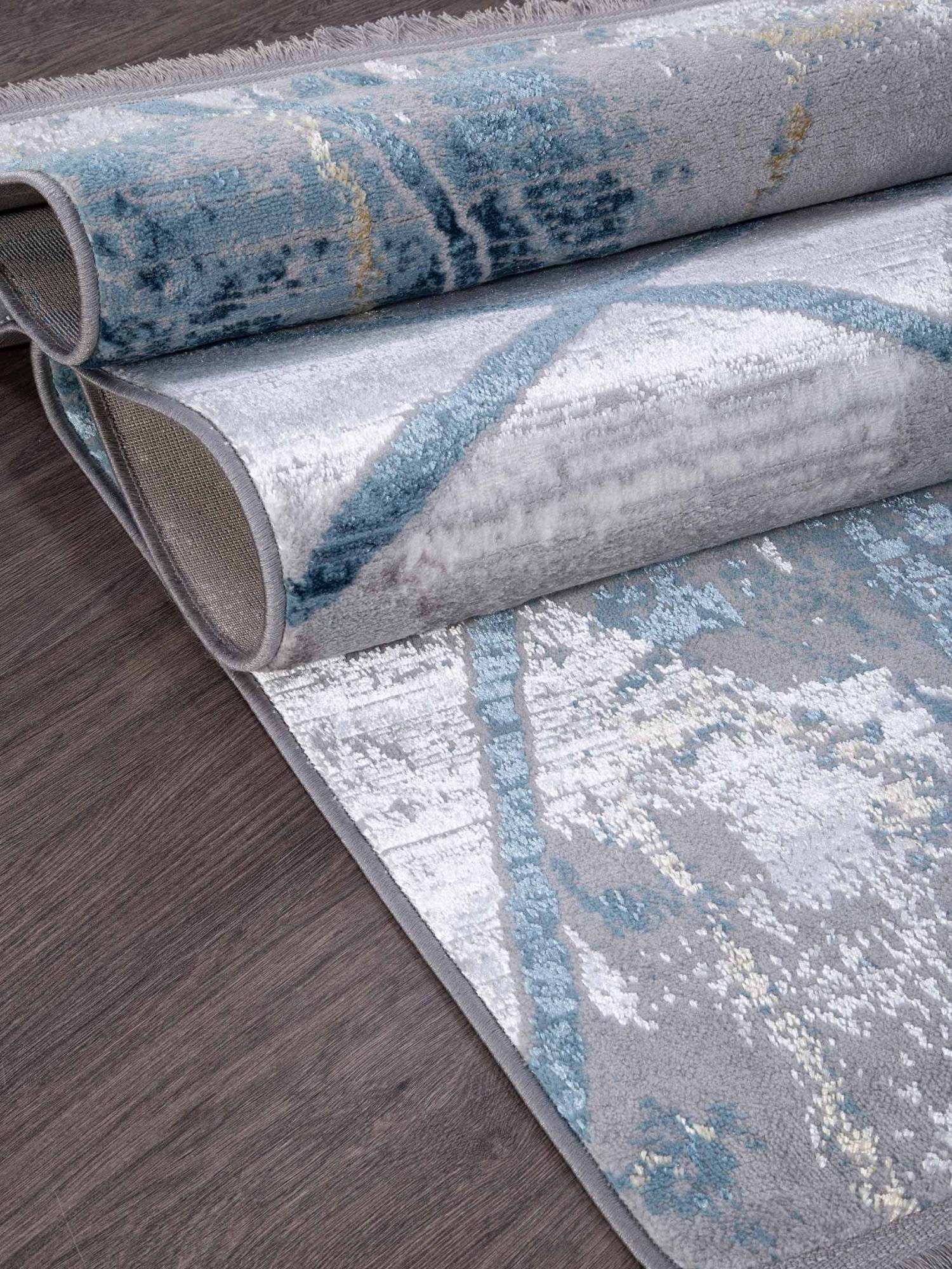 Интересный серо-синий ковер в абстрактным дизайне. Такое ковровое изделие может стать необычным дополнением к практически любому современному интерьеру.
