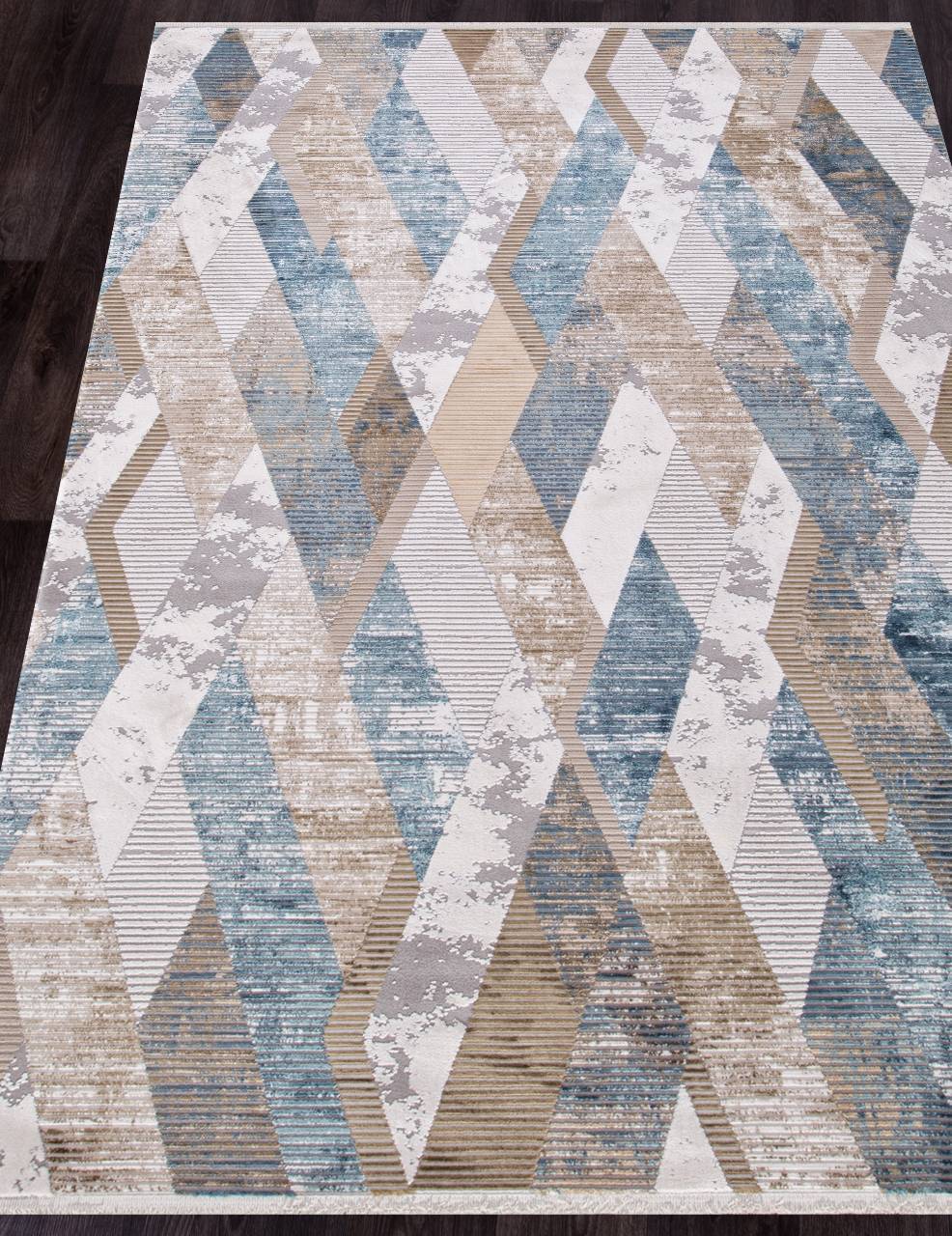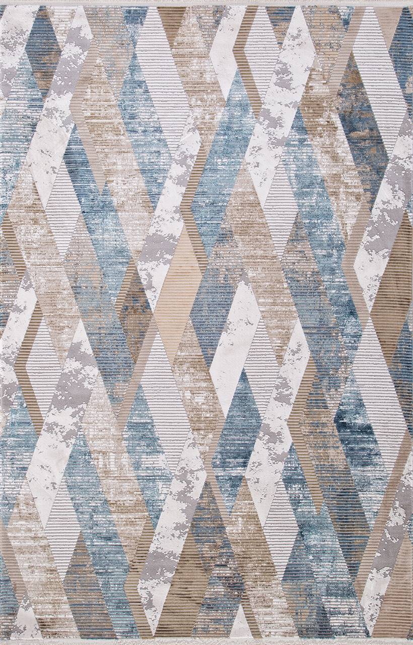 Современный стиль с геометрическим орнаментом в сине-бежевой расцветке. Такое ковровое изделие станет хорошим украшением для любого современного интерьера.