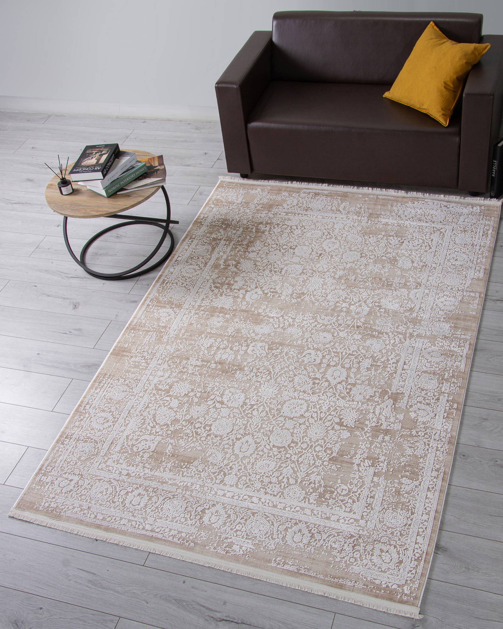 Детализированный орнамент, нейтральная, светлая расцветка и высокое качество изготовления. Идеально подойдет для гостиной или зала.