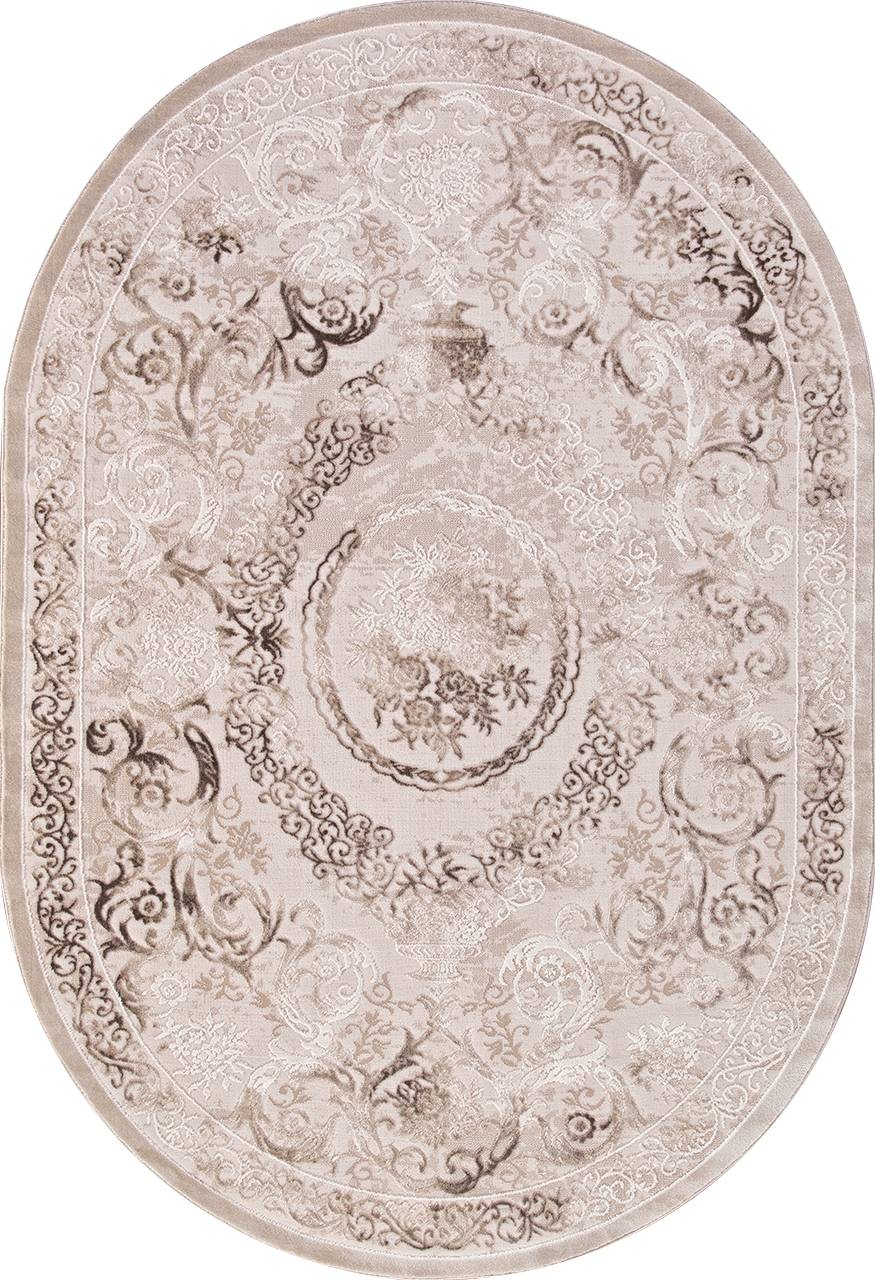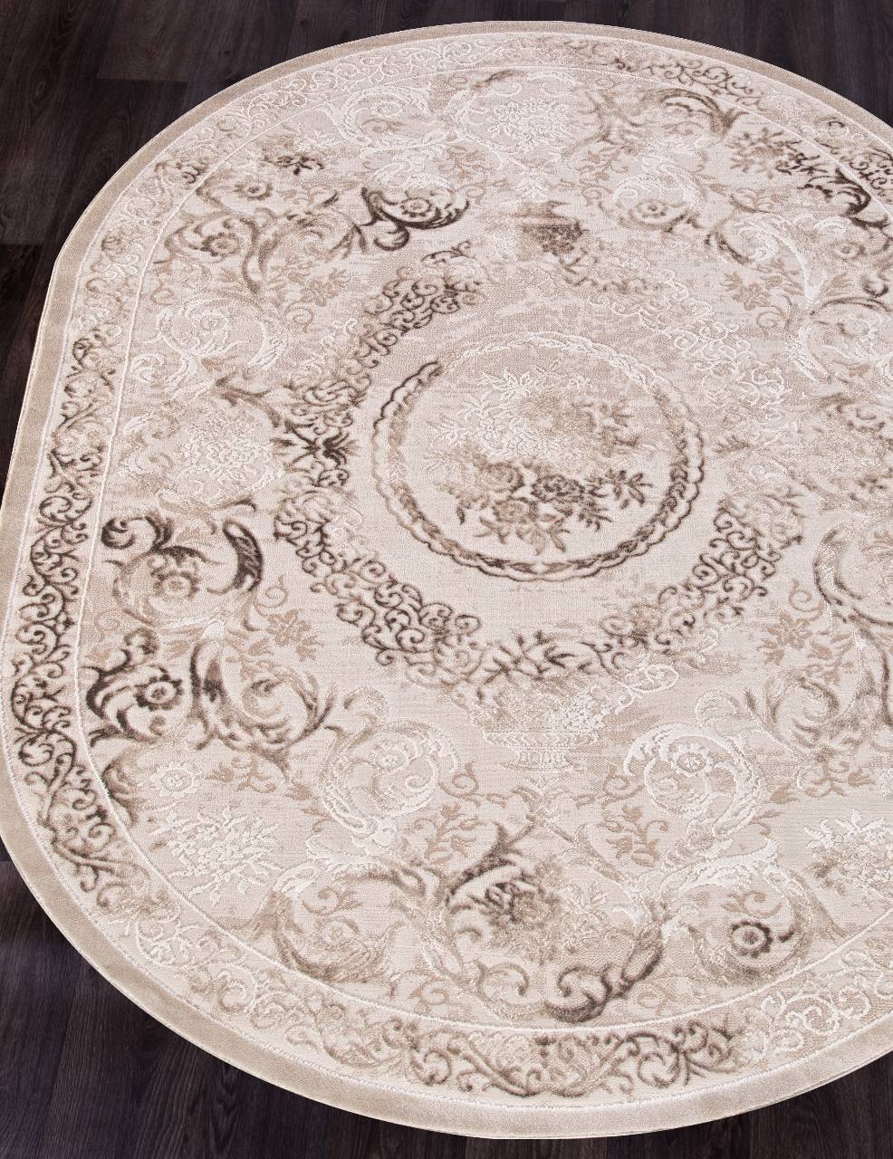 Стильный овальный ковер с имитацией потертостей в светлой цветовой гамме. Хорошо подойдет под любой современный интерьер и не принесет проблем в повседневном уходе.