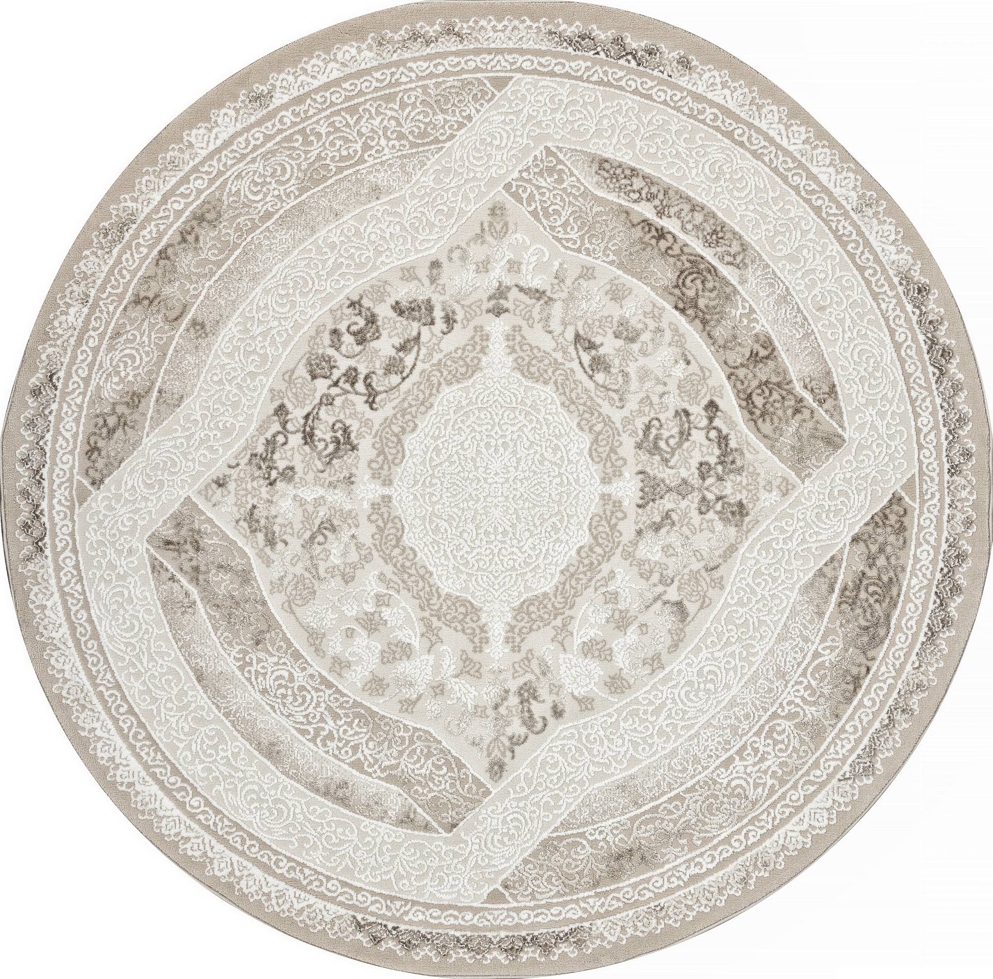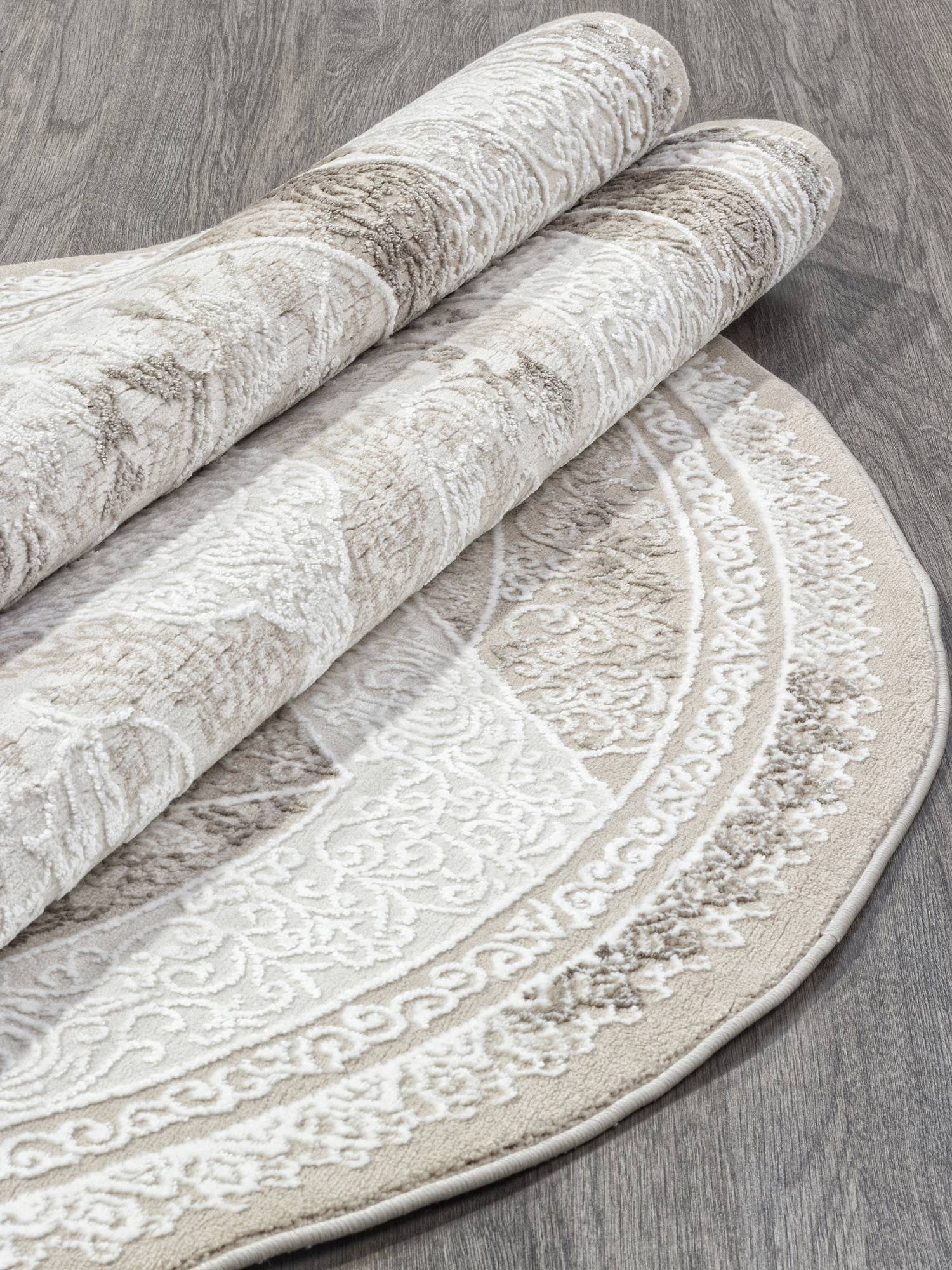 Светлый ковер в классическом стиле и в модной круглой форме. Это ковровое изделие будет отличным украшением для гостиной или зала.