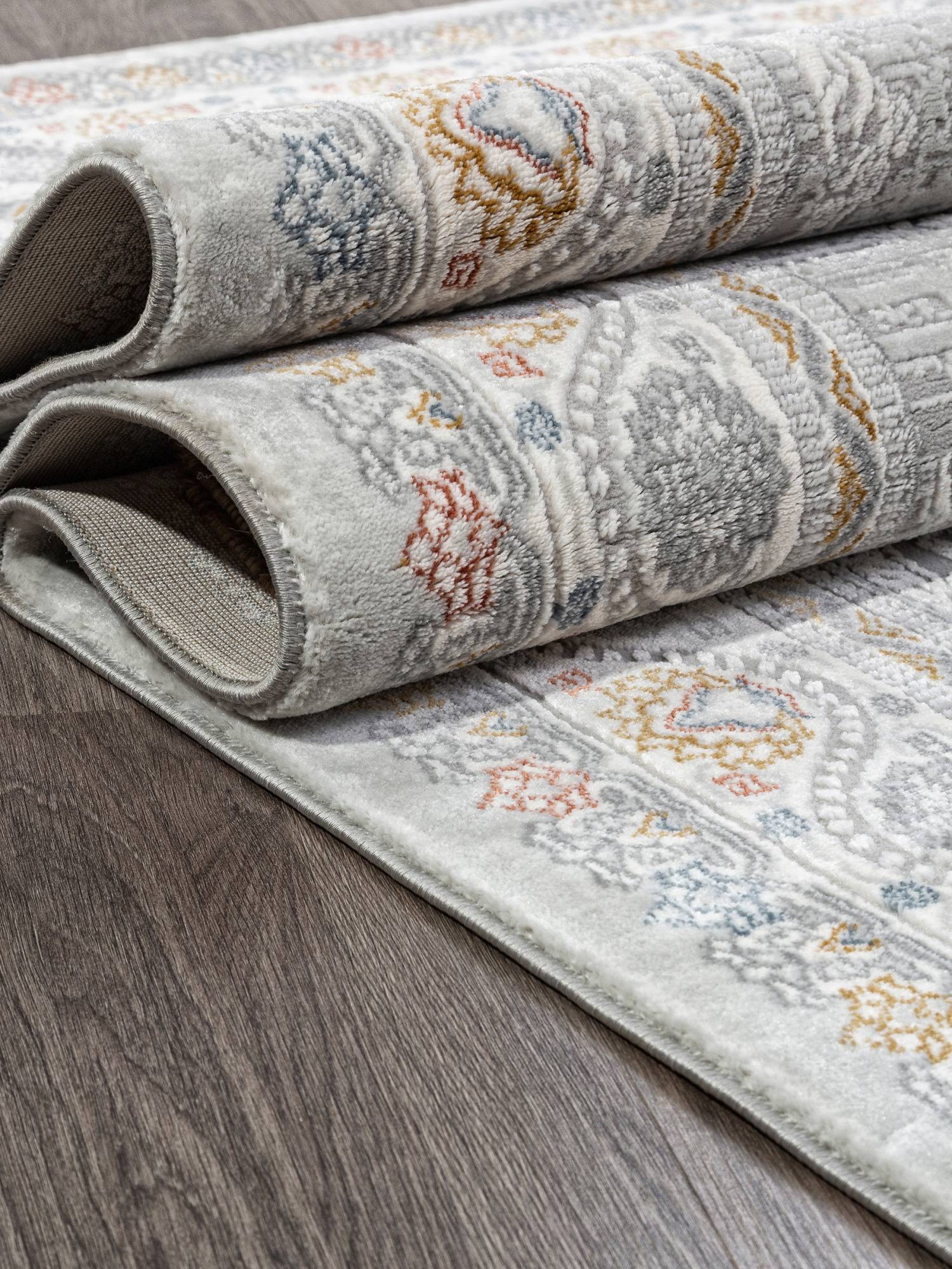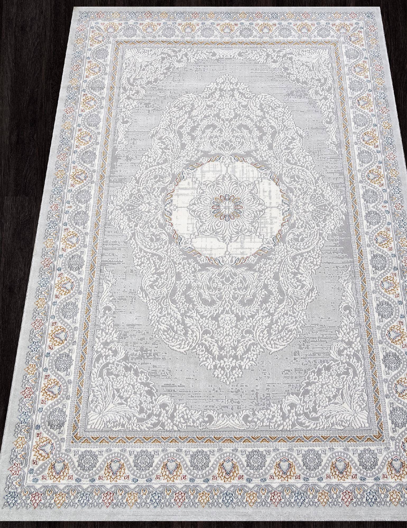Светлая серо-кремовая расцветка и интересный классический рисунок этого ковра приятно дополняют друг-друга что позволяет ему вписаться в практически любой интерьер.