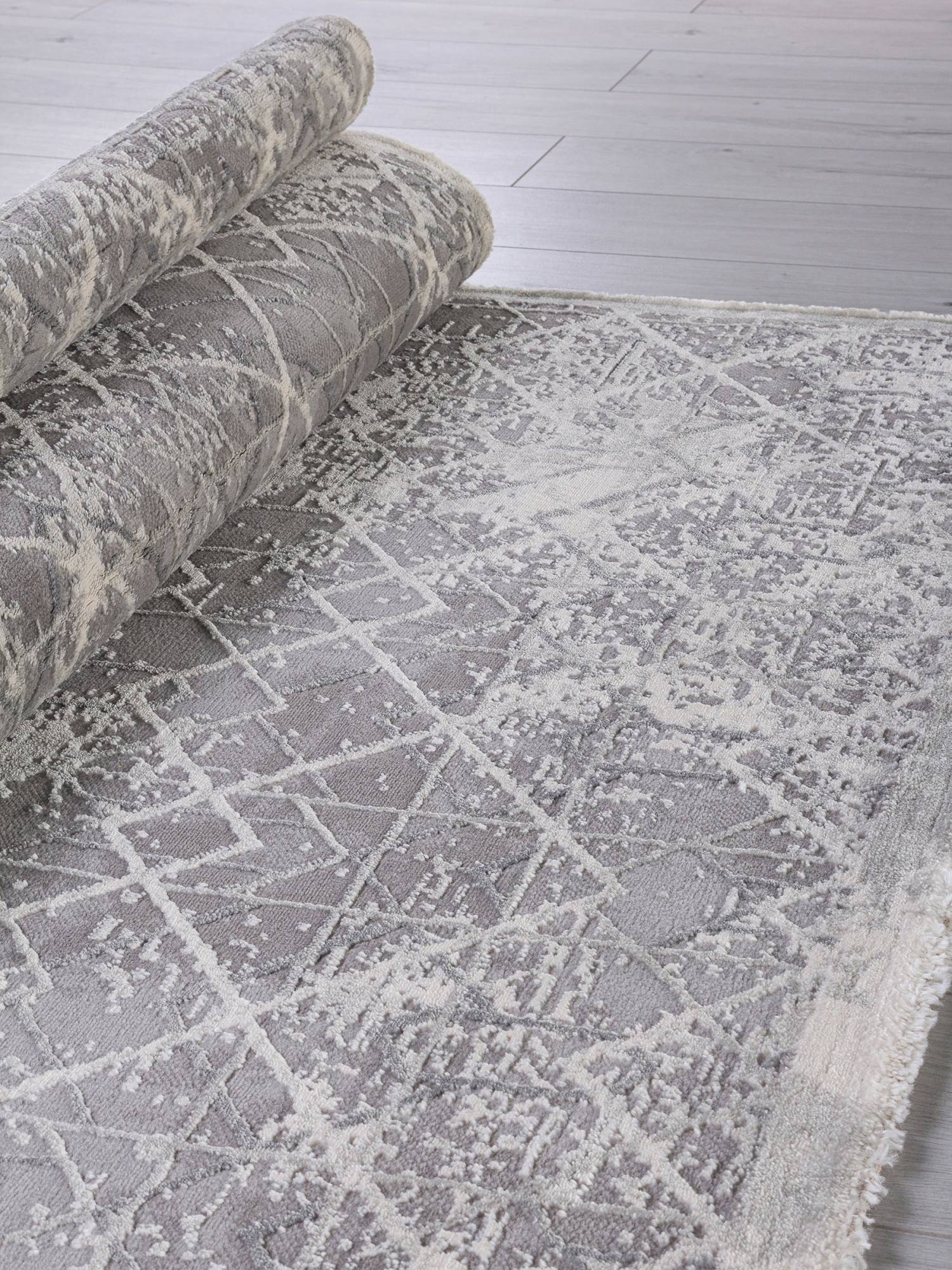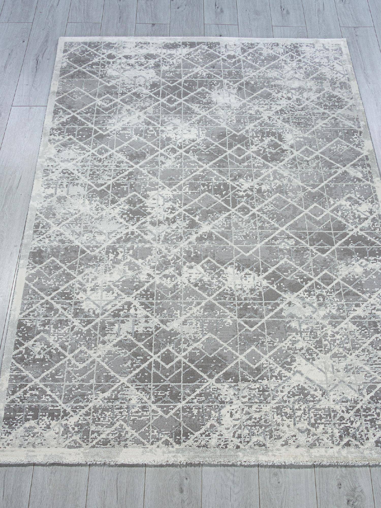 Красивый, стильный ковер с геометрическим орнаментом и стильной, абстрактной расцветкой в серых тонах. Станет отличным дополнением для интерьера вашего дома.