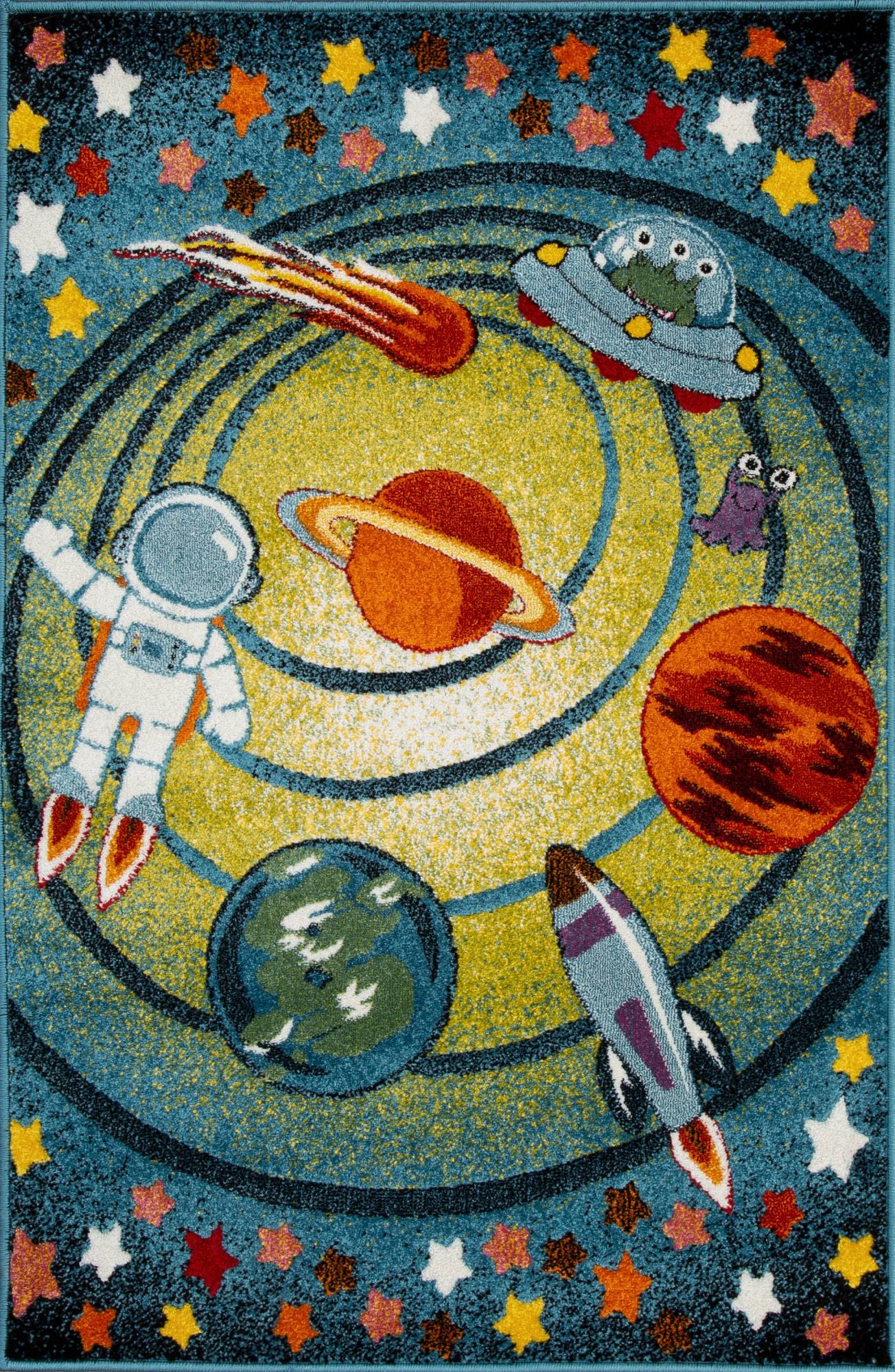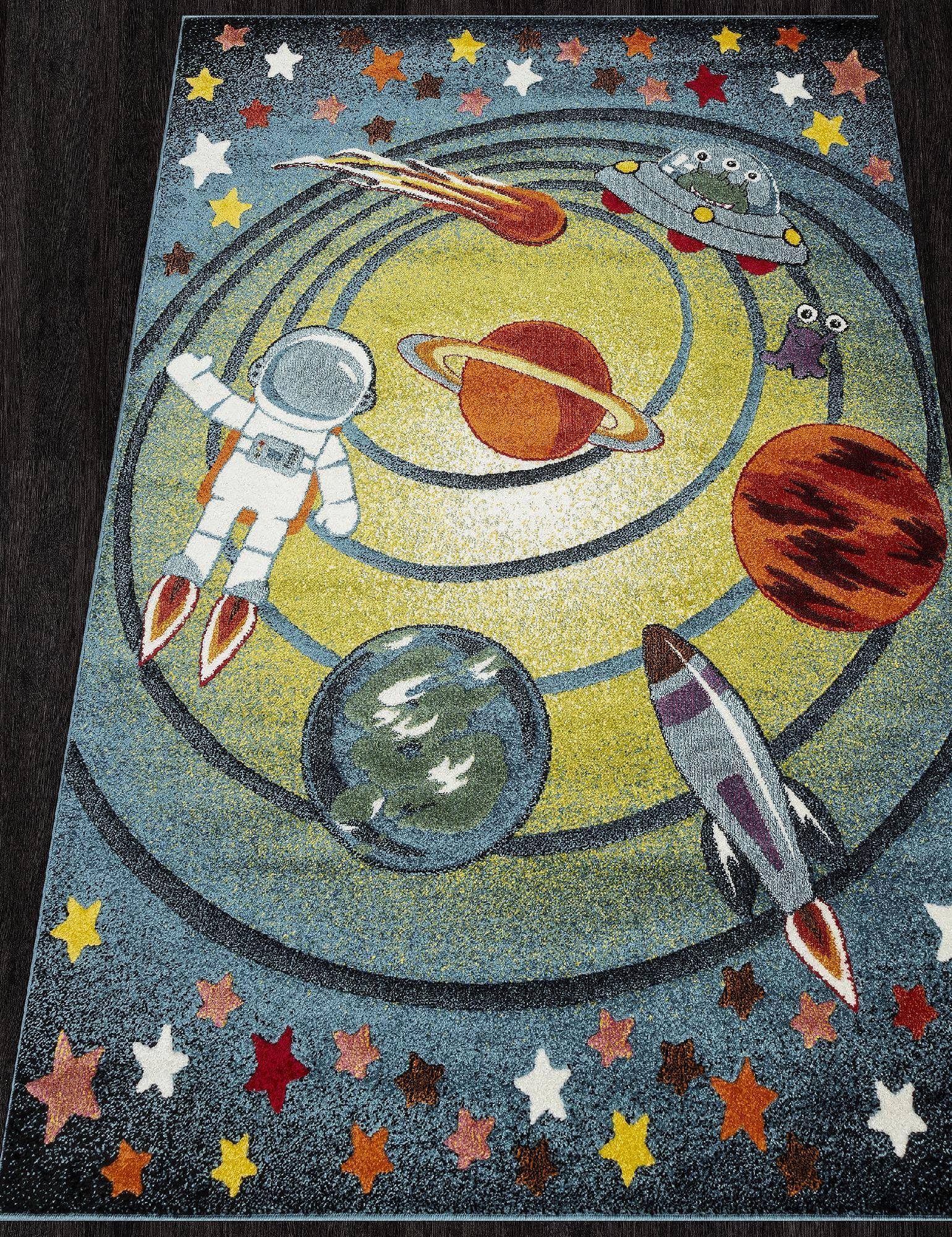 Яркий и красивый ковер для ребенка который увлекается темой космоса. такое ковровое изделие утеплит и украсит любую детскую комнату.