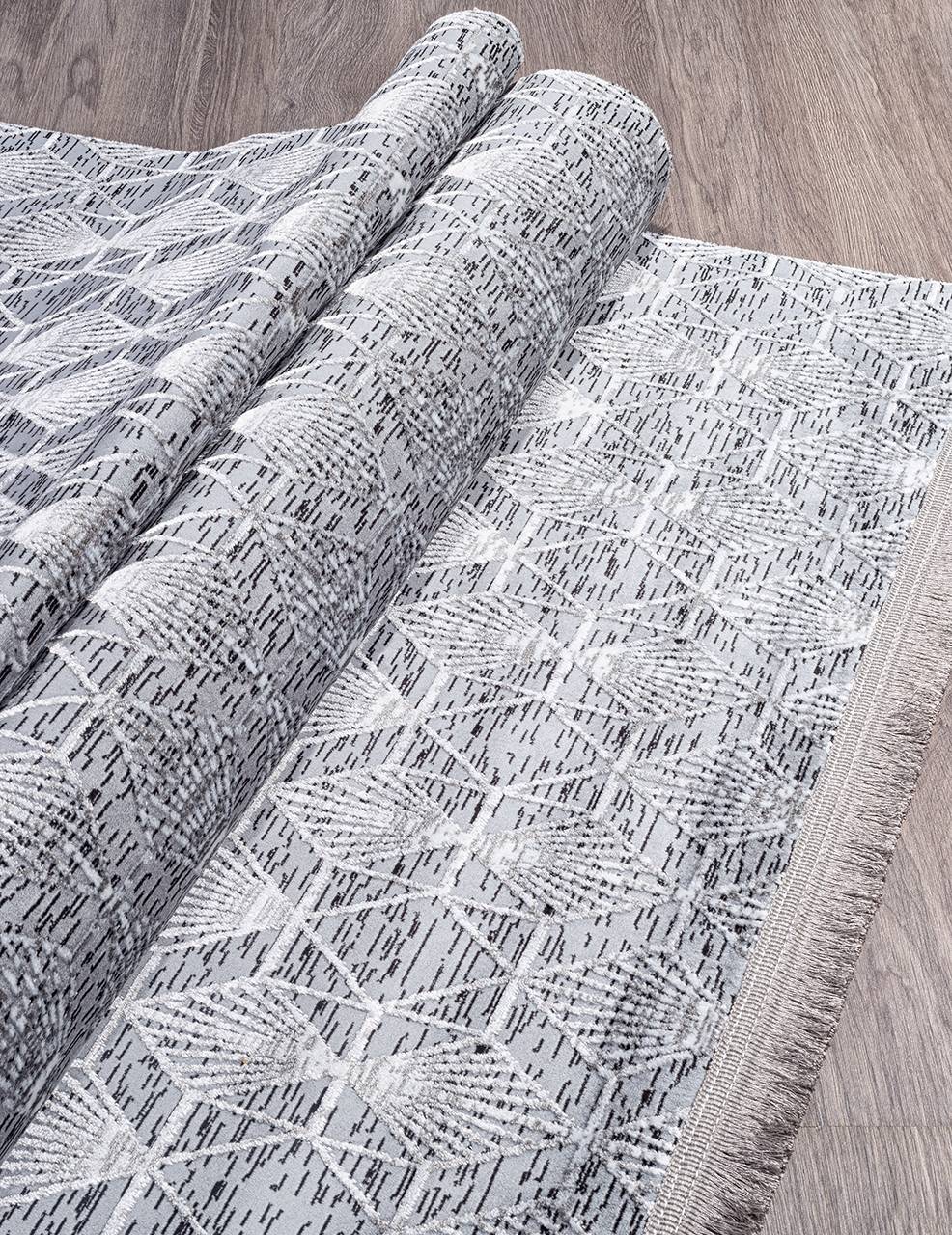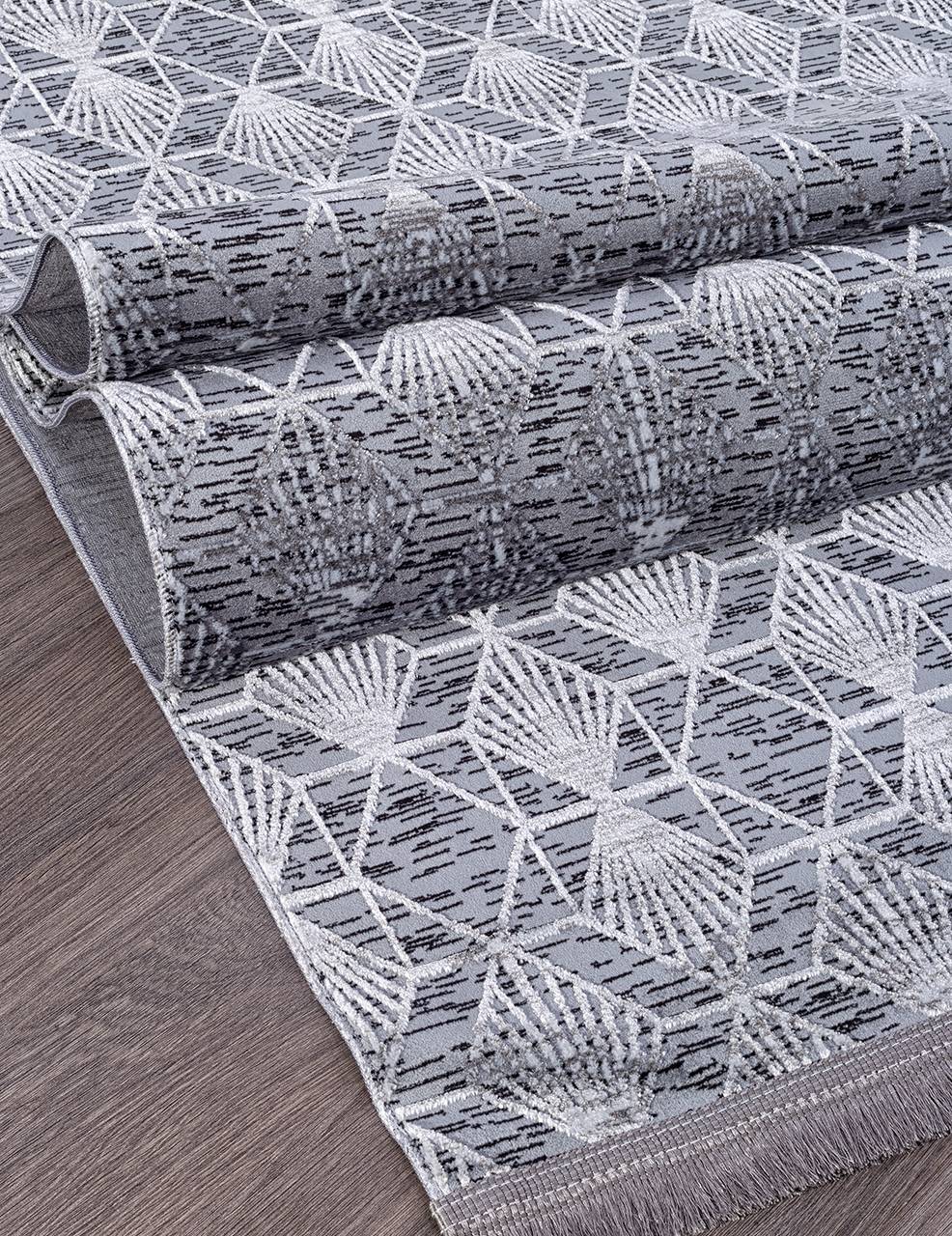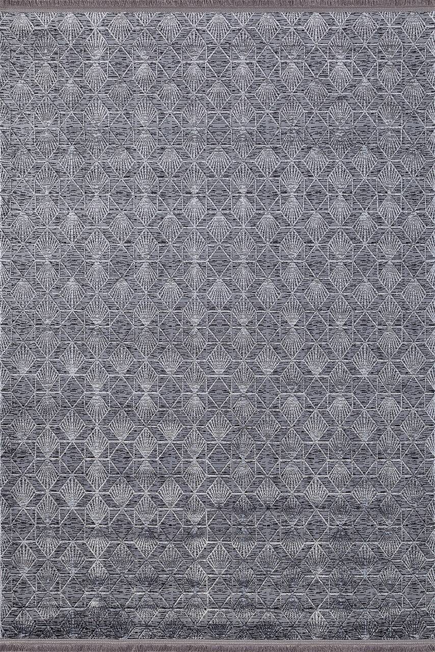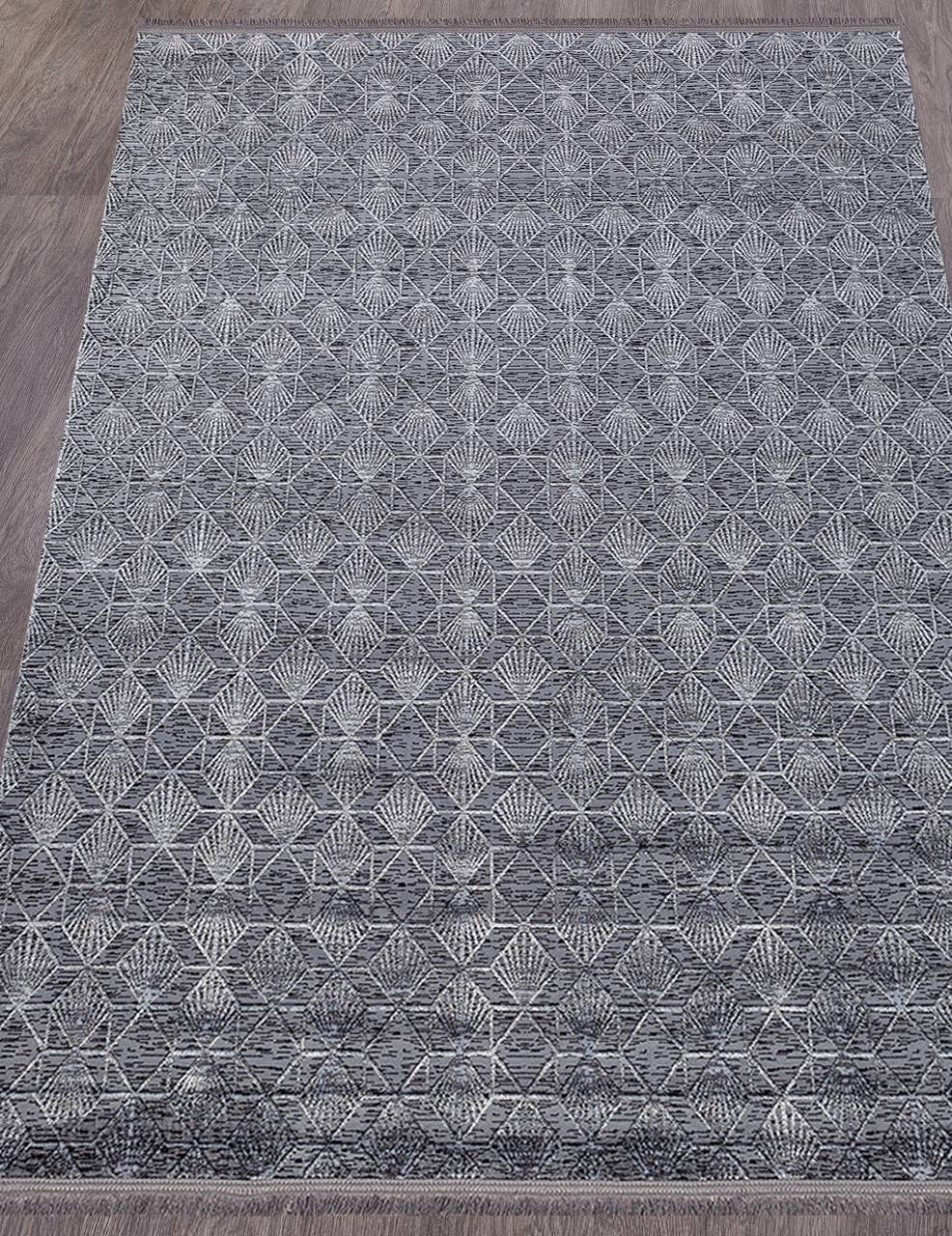 Оригинальный ковер в темной серо-синей расцветке с упорядоченным орнаментом с геометрическими элементами. Такой ковер лучше всего будет смотреться в гостиной или в зале.