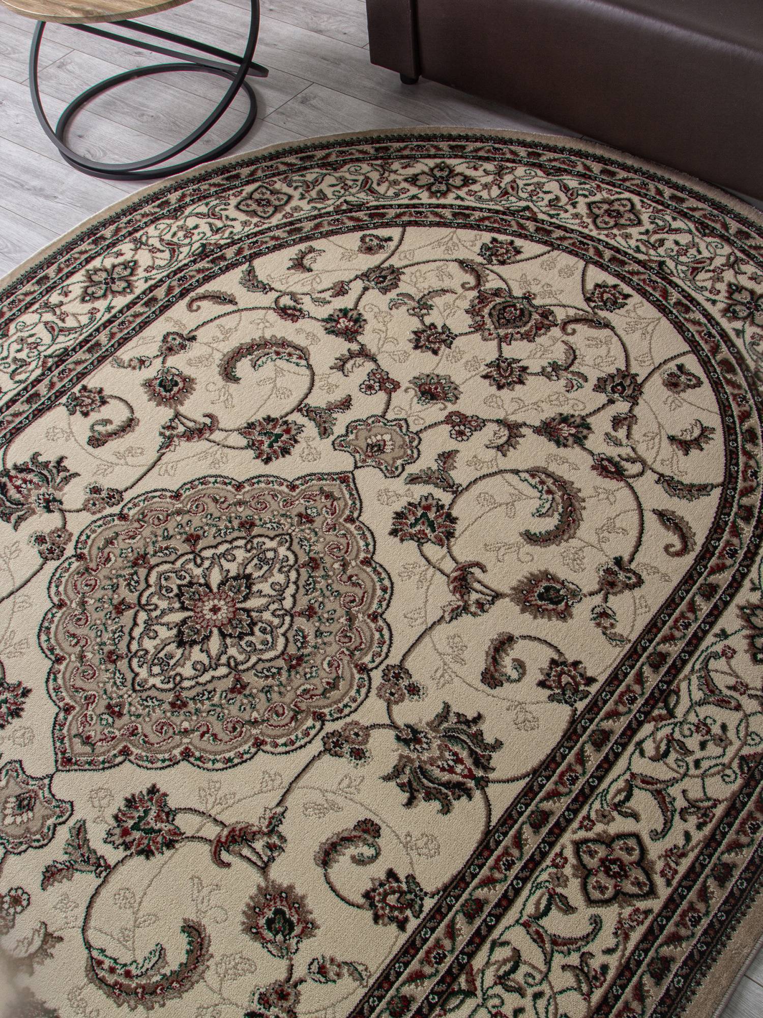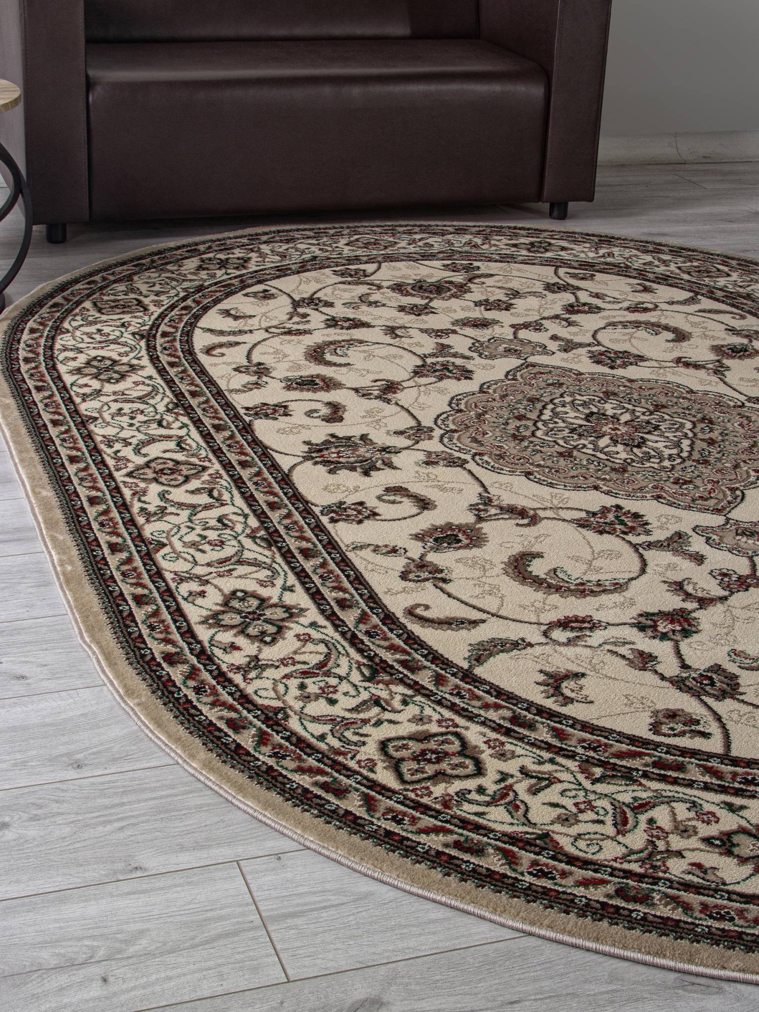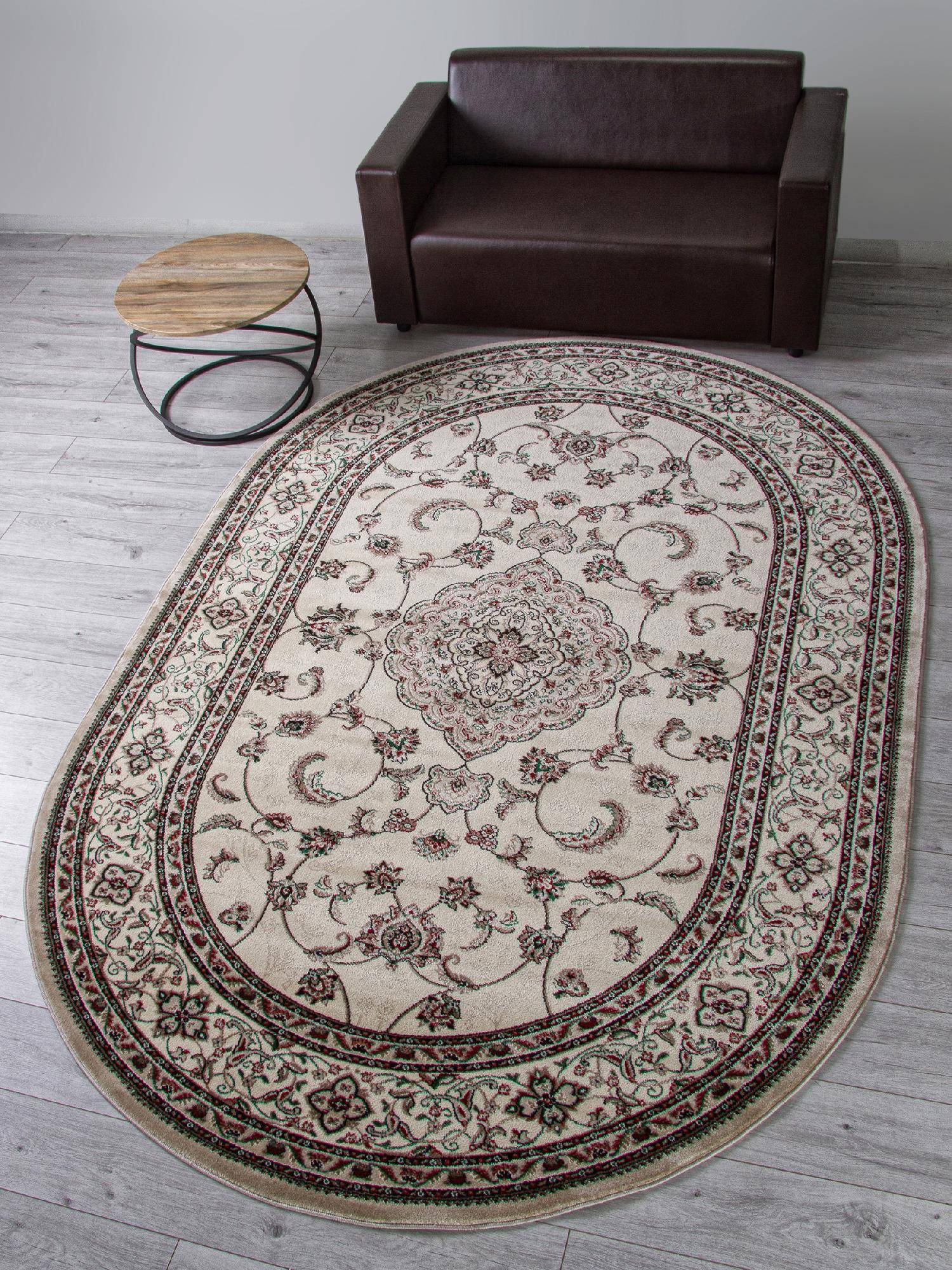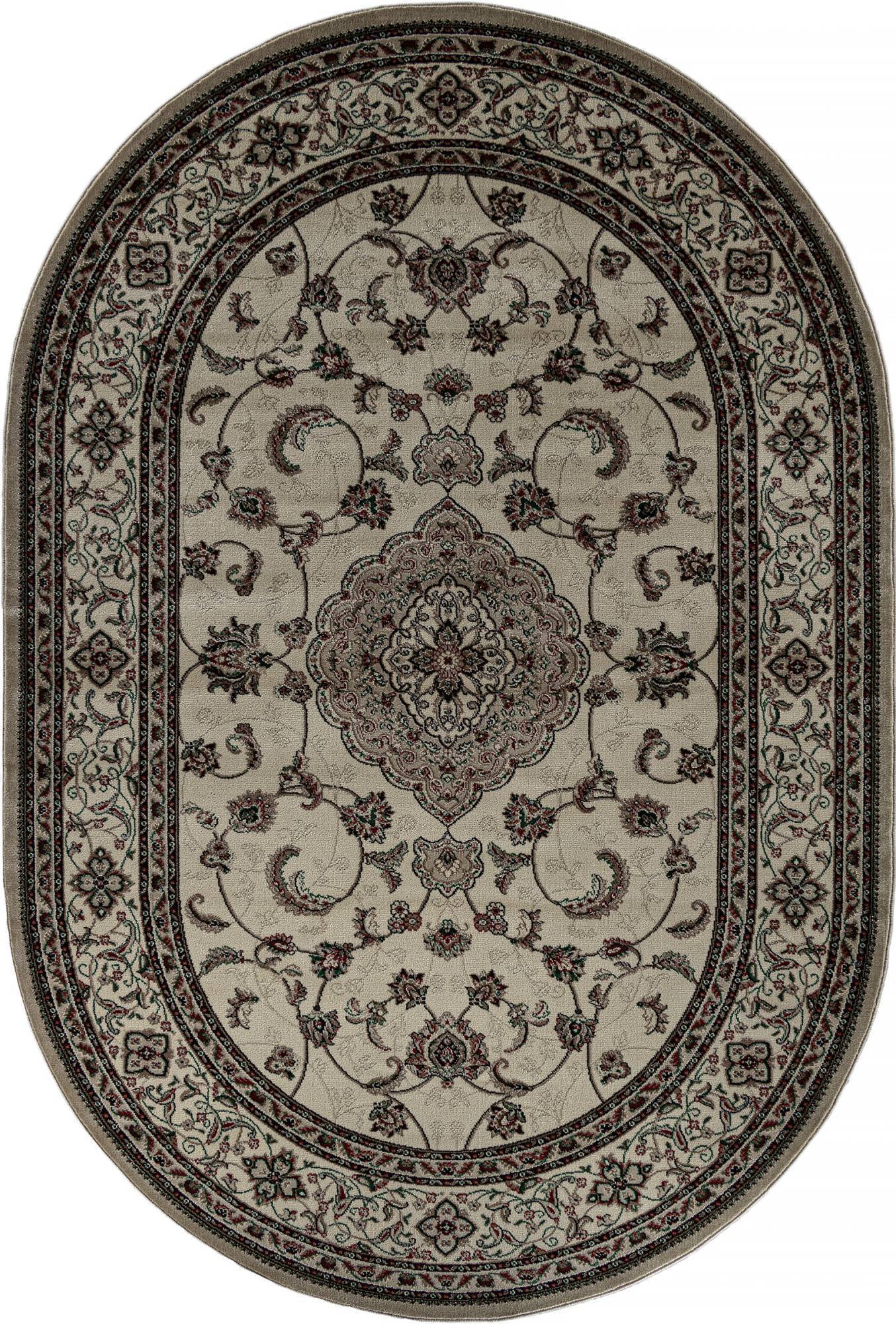 Бежевый, овальный ковер в классическом дизайне. Такое ковровое изделие станет хорошим украшением для любого современного интерьера.