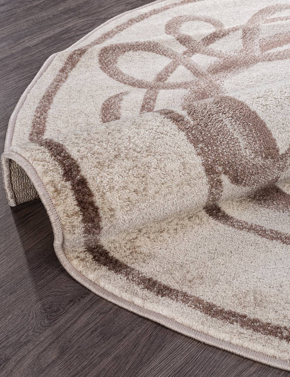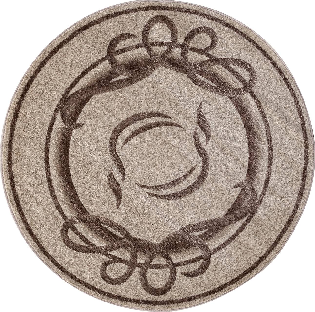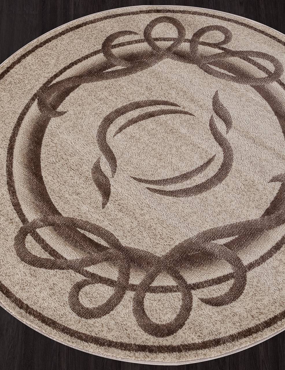 бежевый круглый ковер с абстрактным рисунком в виде линий отлично подойдет под современный интерьер в котором нужно подчеркнуть округлость линий.