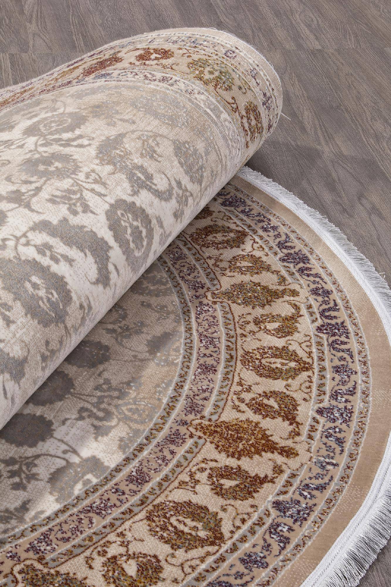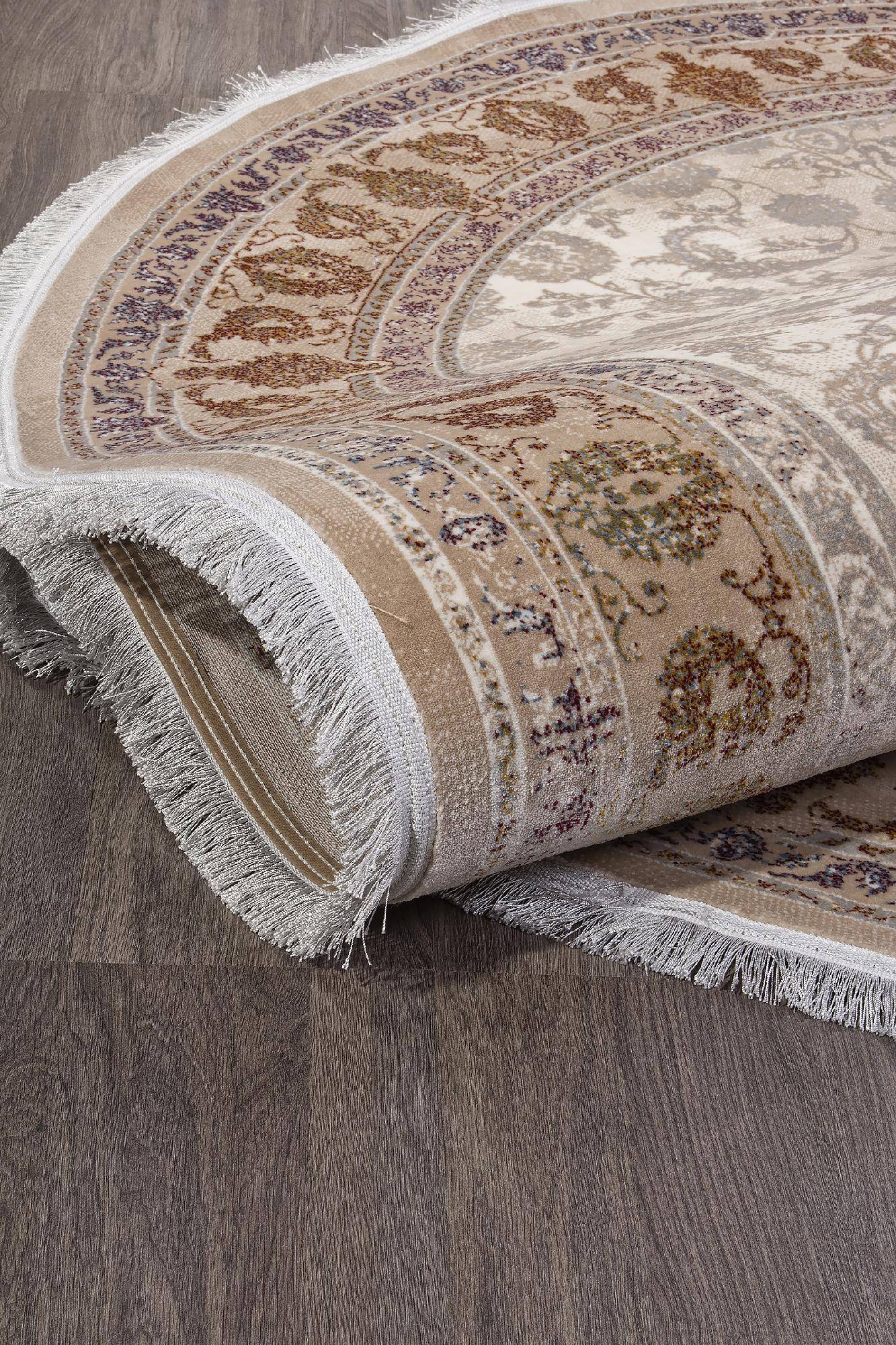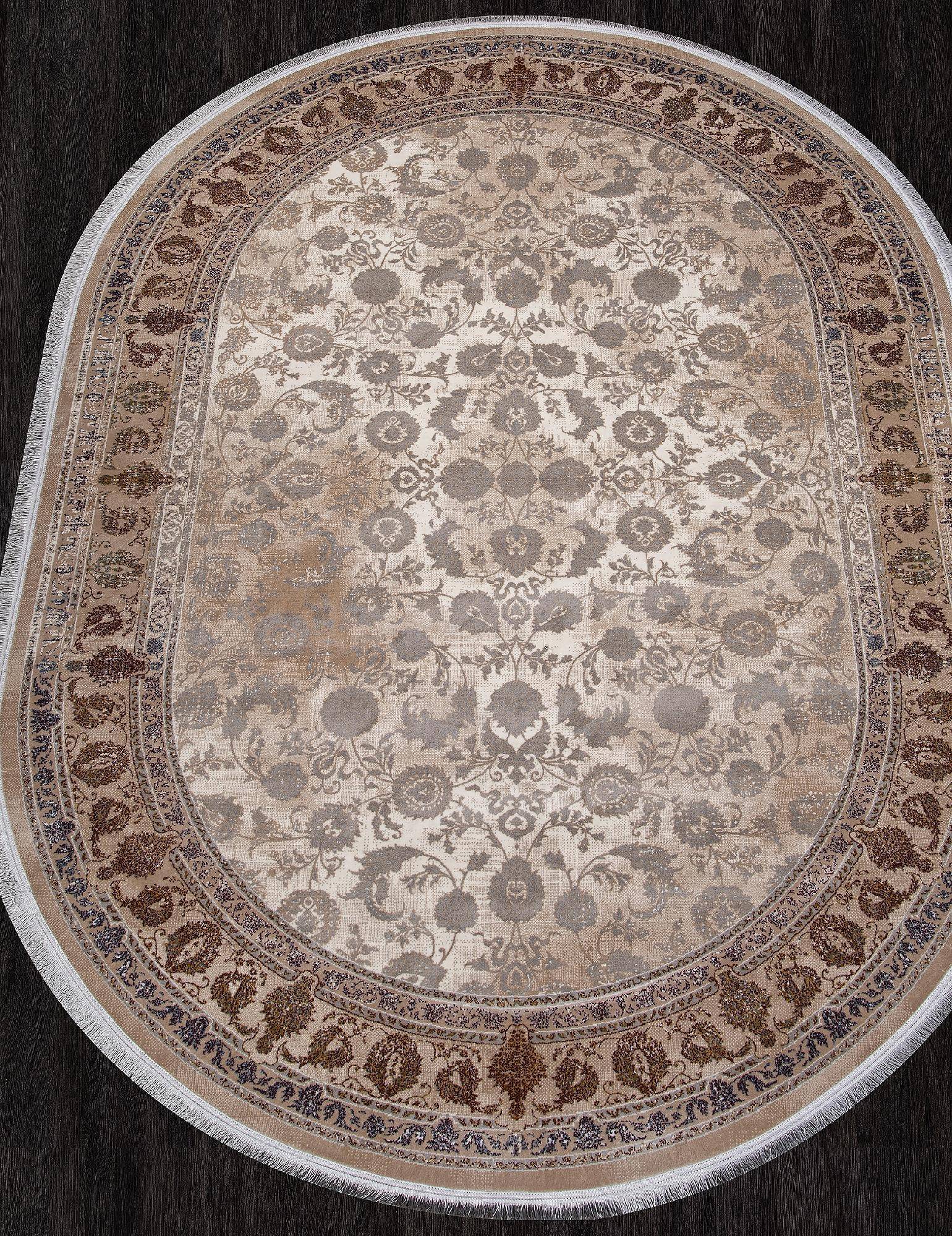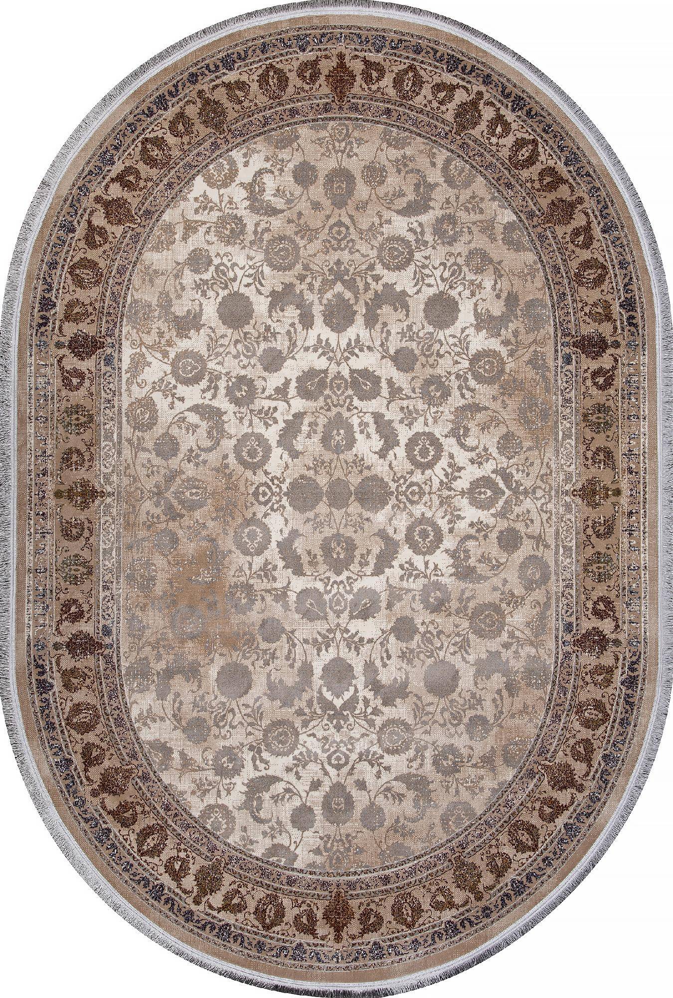 Кремово-коричневая расцветка, мелкий детализированный орнамент и стильная овальная форма. Такое ковровое изделие будет отличным украшением для зала или гостиной.