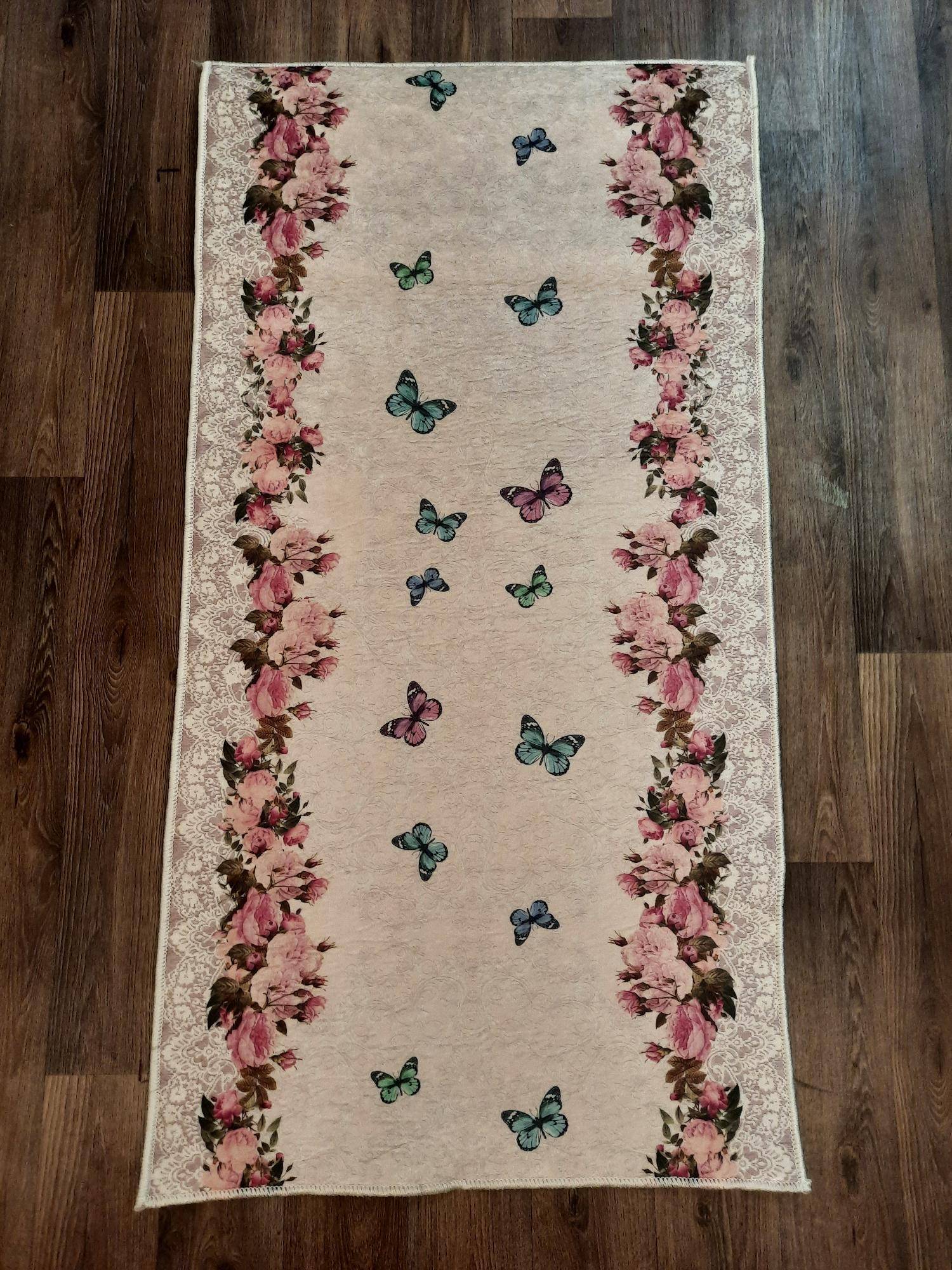 Красивый и светлый ковер с цветами и бабочками благодаря своему размеру идеально подойдет для украшения коридора в вашем доме.