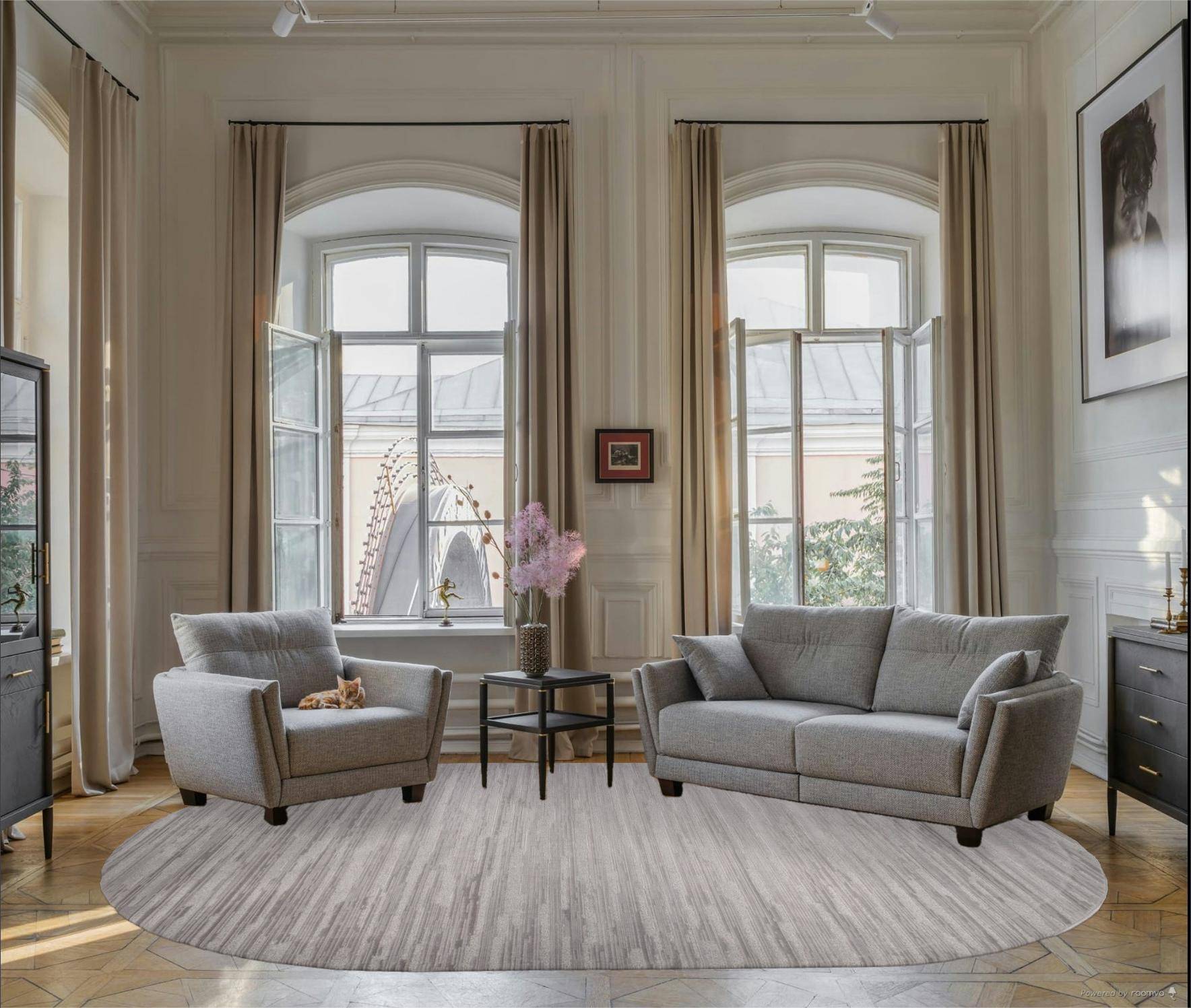 Современный овальный ковер в приятной серой расцветке. Этот ковер будет интересным дополнением для любого современного интерьера.