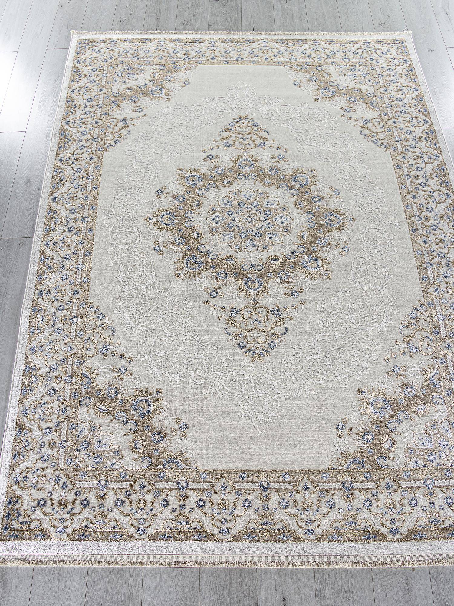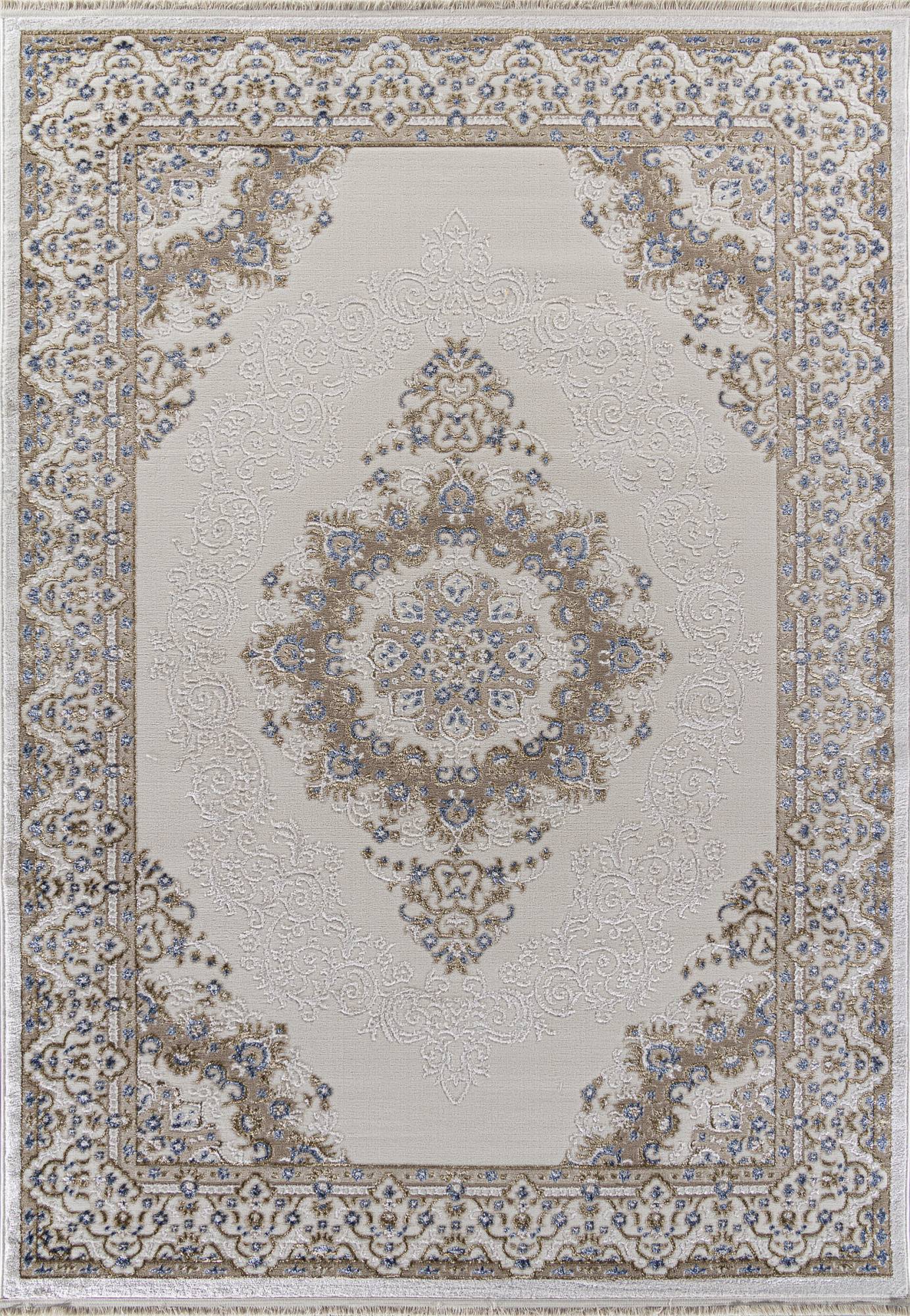 Приятная расцветка в кремовых, бежевых и синих оттенках, а также стильный дизайн этого ковра позволяют ему стать отличным дополнением для любого интерьера.