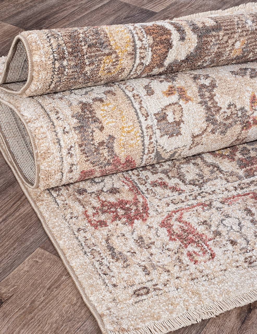 Классический ковер в кремово-коричневой расцветке с имитацией винтажных потертостей. Такое ковровое изделие будет неплохим украшением для гостиной или зала в современном интерьере.