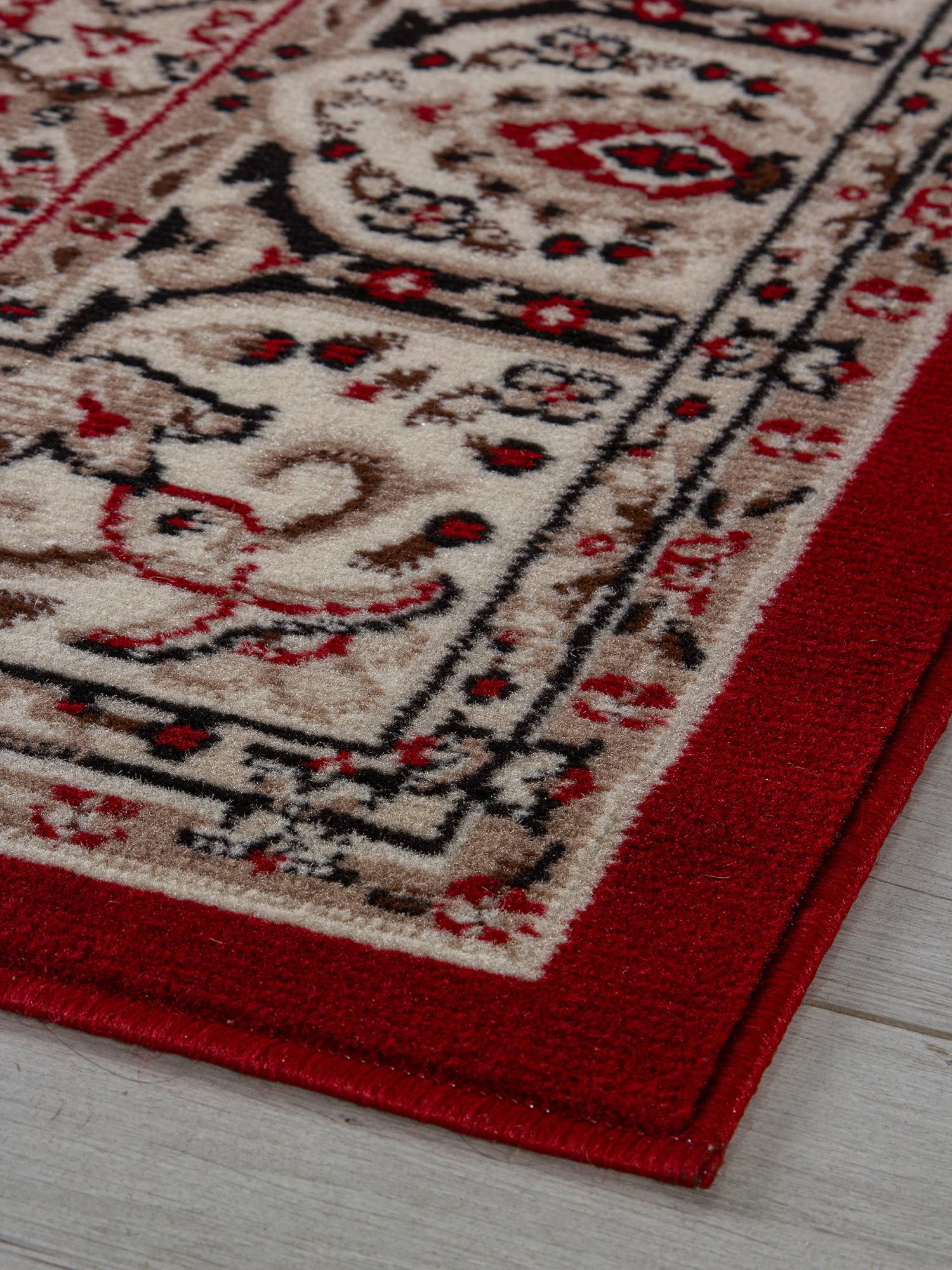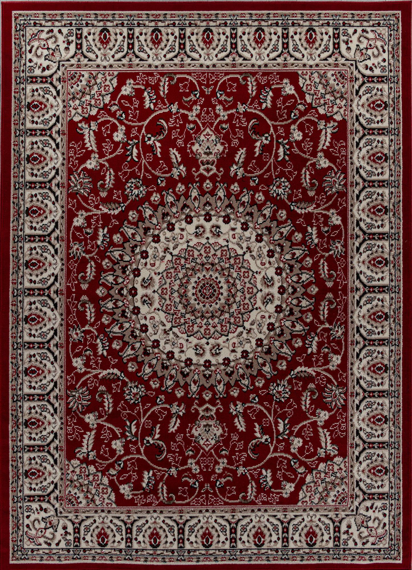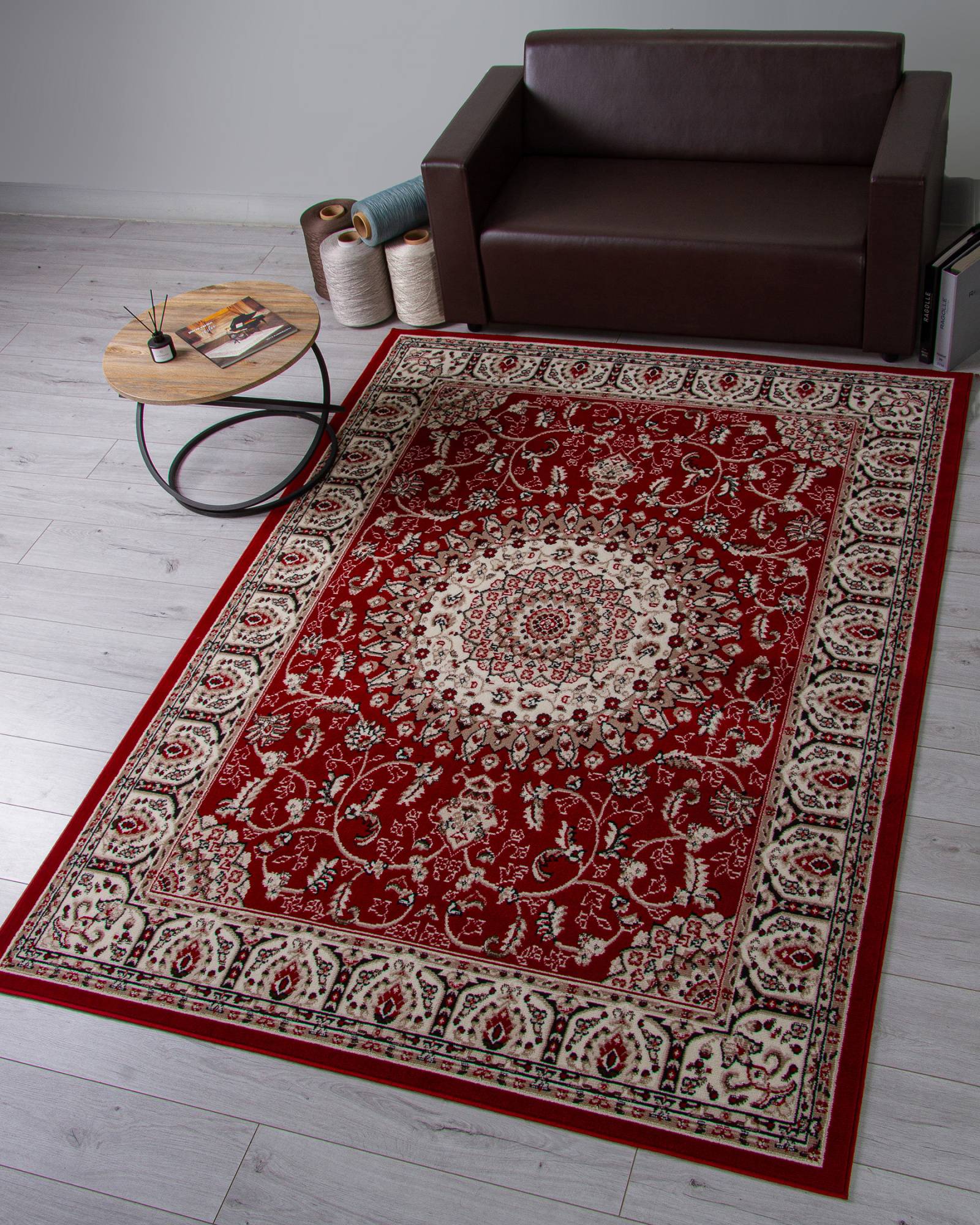 Качественный ковер в классическом дизайне и яркой расцветке в красных тонах. Отличное решение для украшения интерьера гостиной или зала.