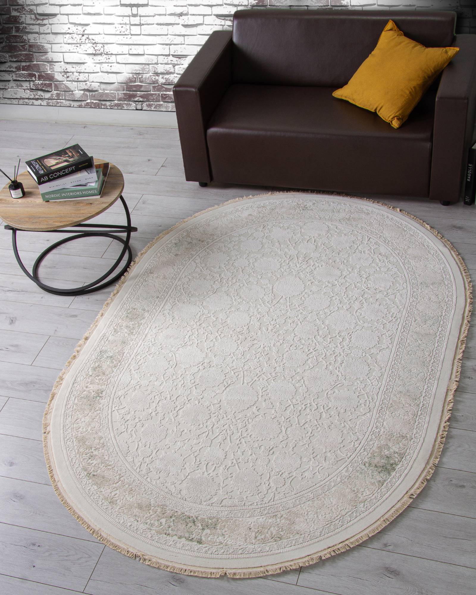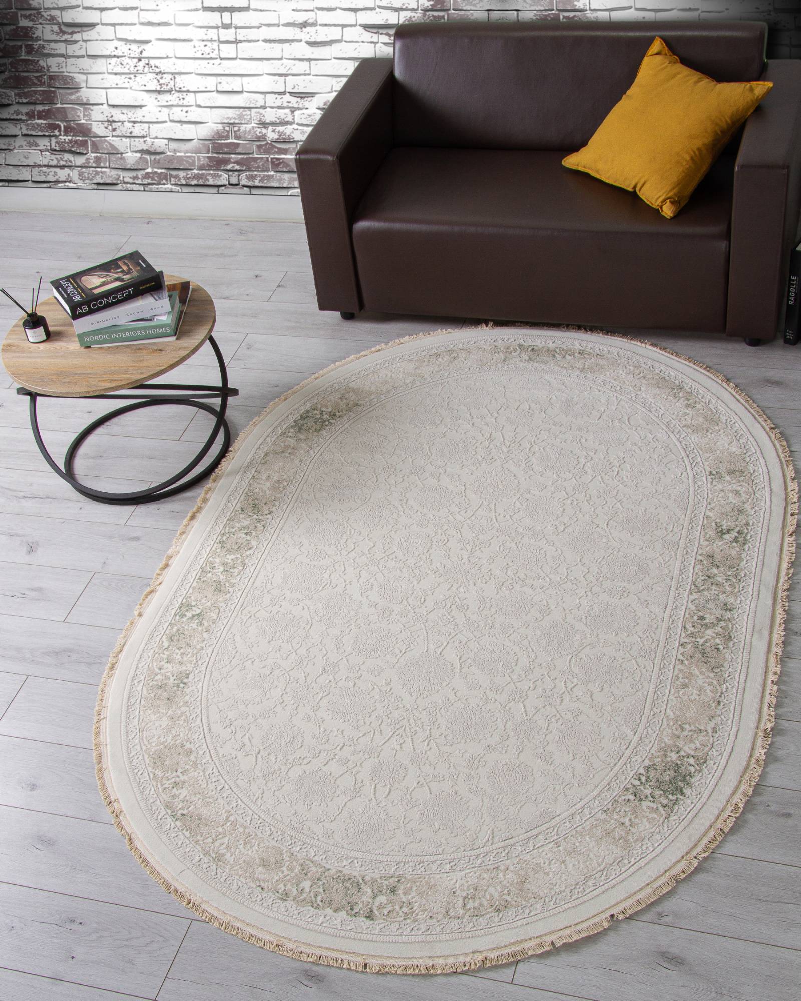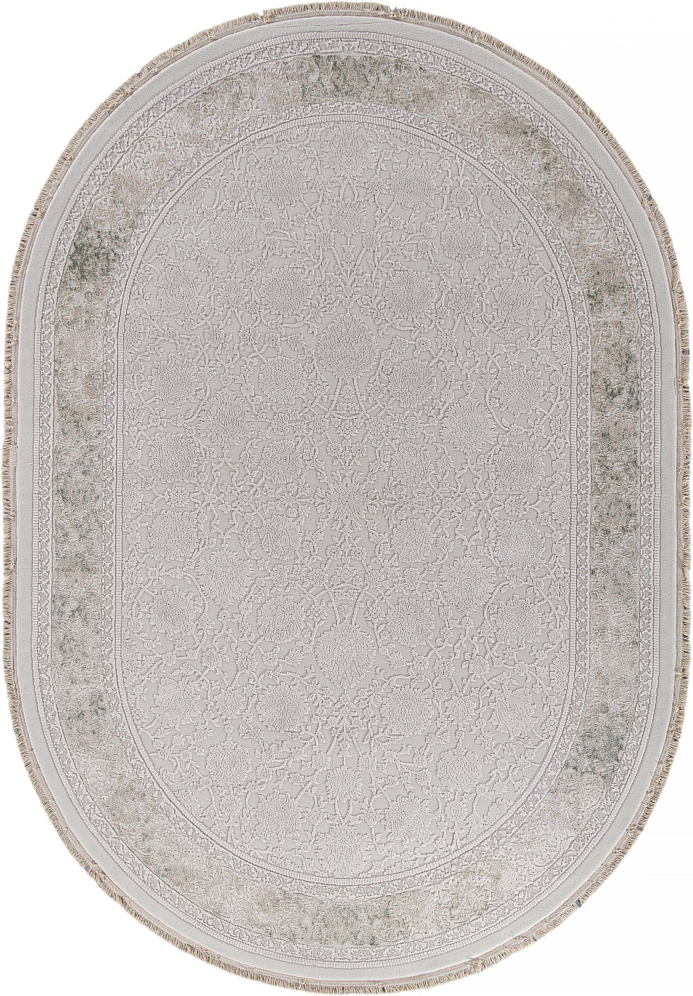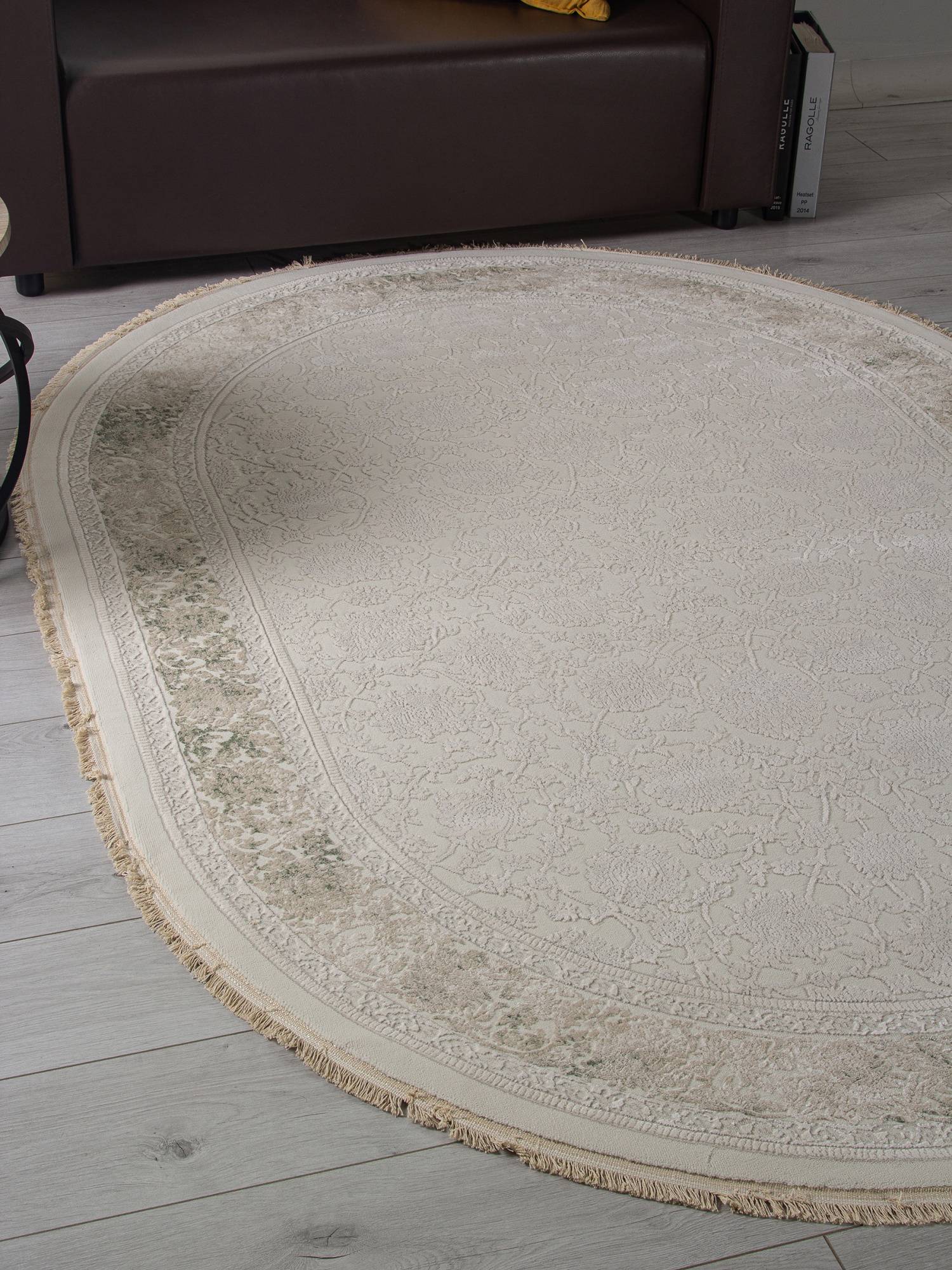 Модный овальный ковер в светлой расцветке и классическом дизайне. Этот ковер будет хорошим украшением для интерьера гостиной или зала.