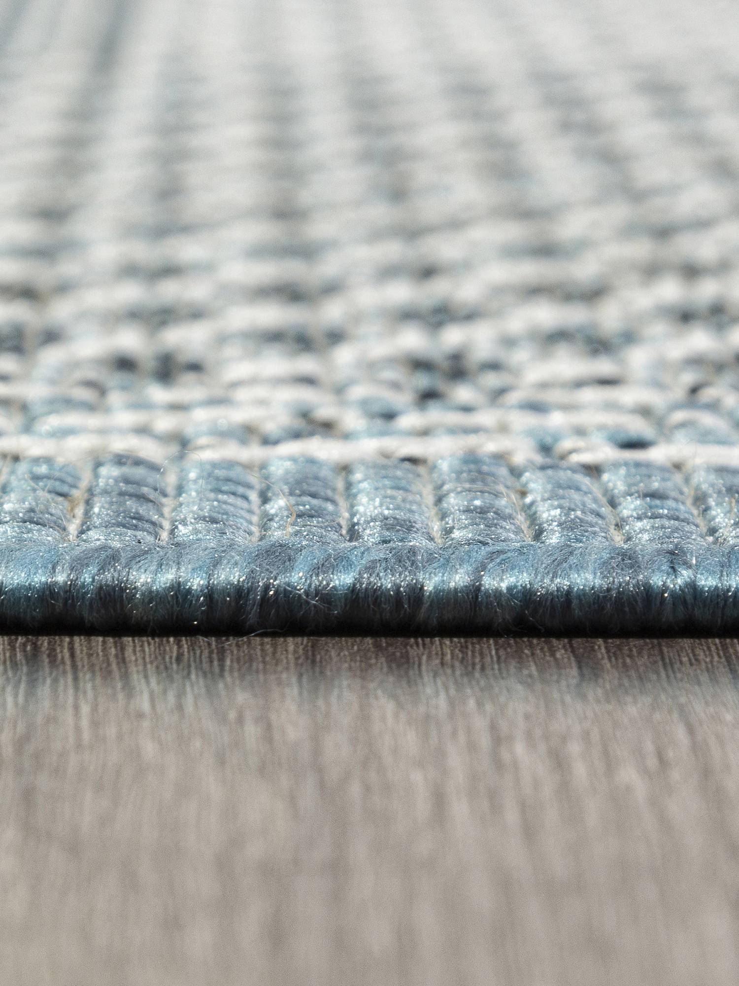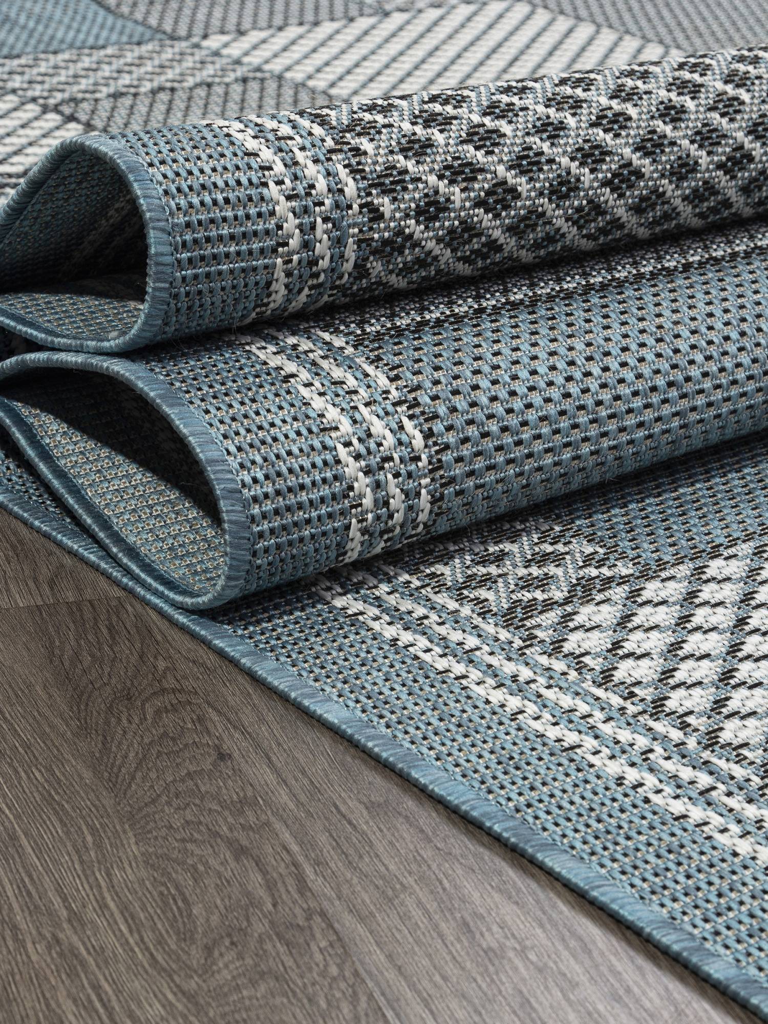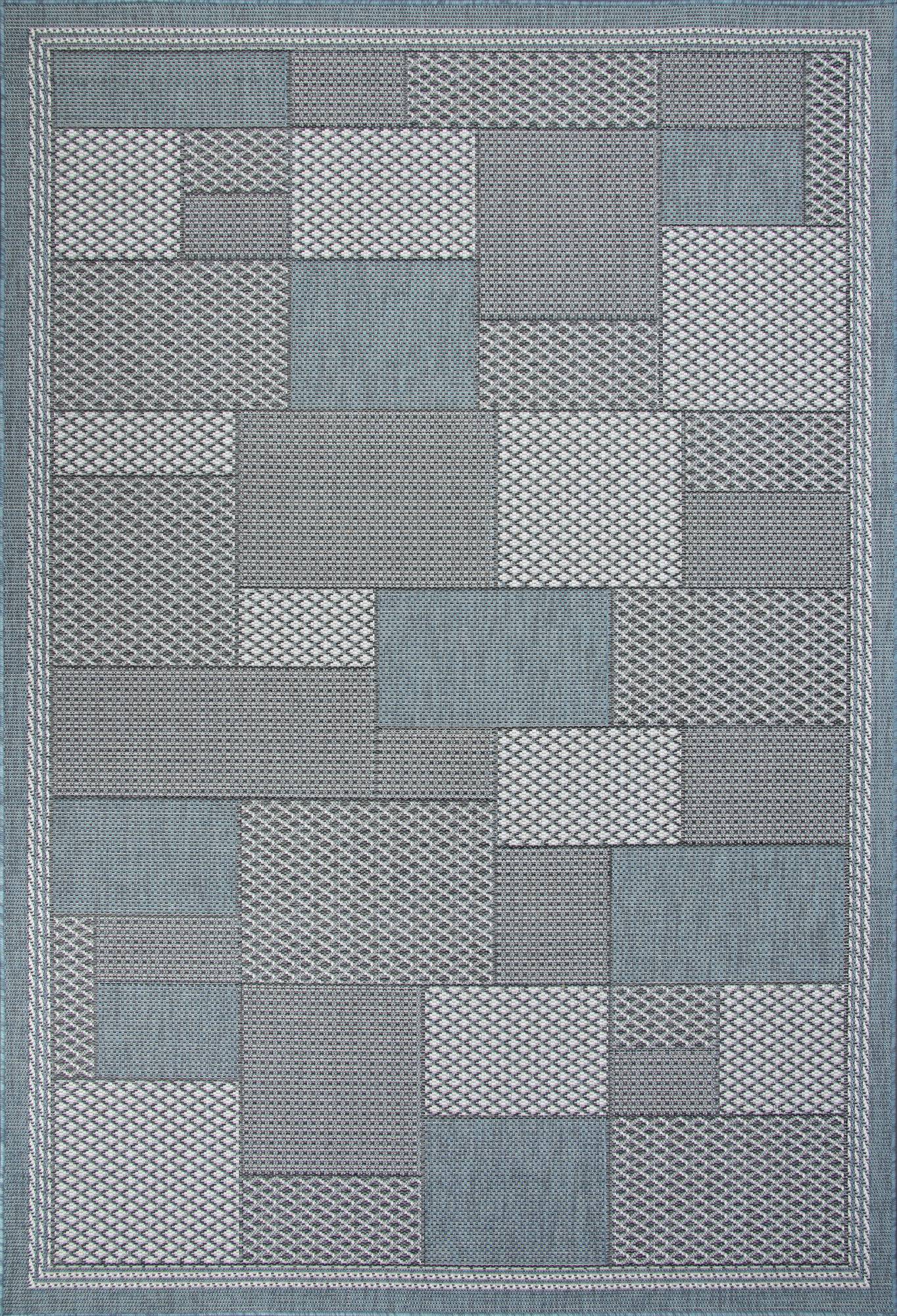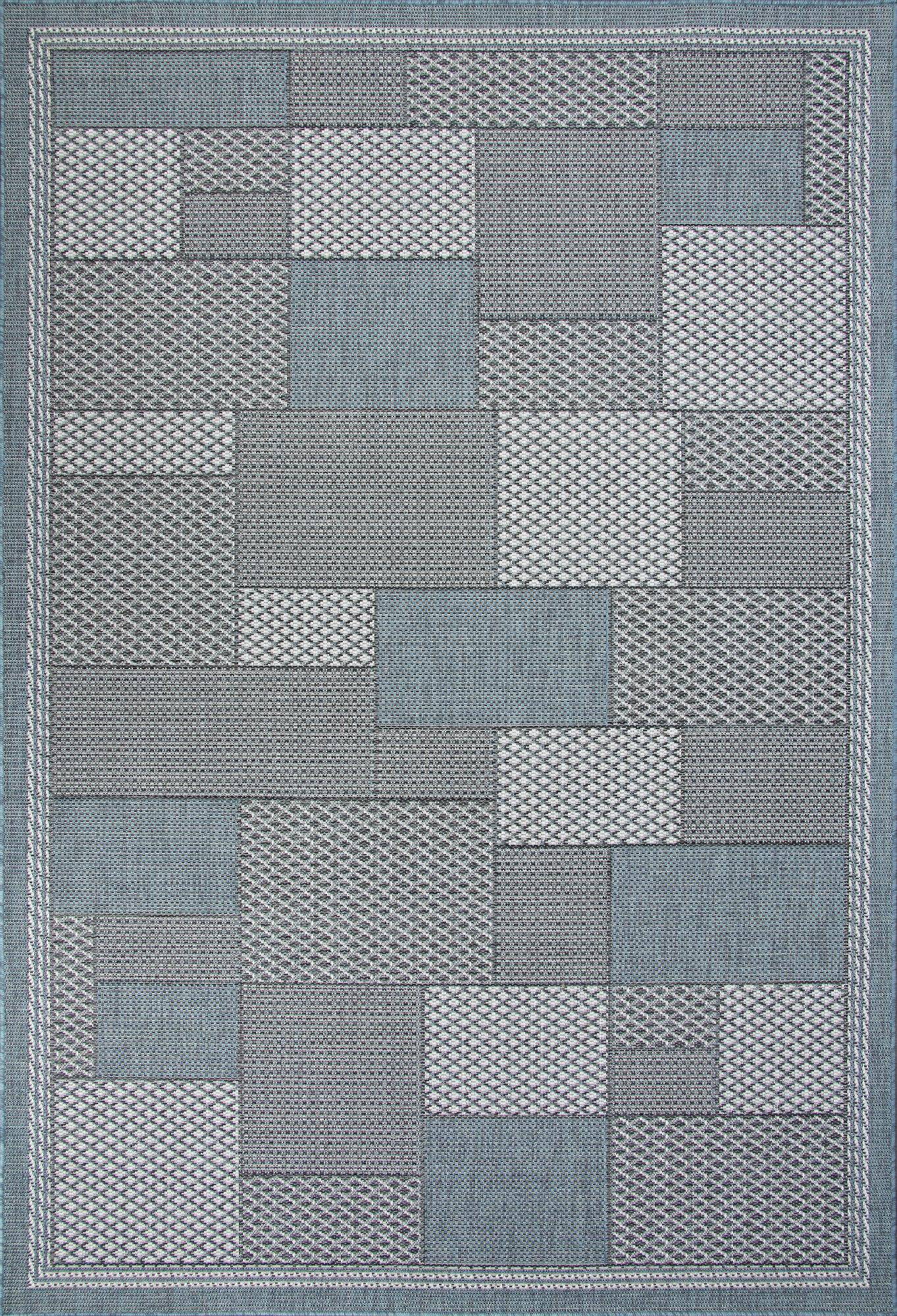 Серо-синяя расцветка и геометрический орнамент хорошо сочетаются между собой что позволяет этому ковру стать стильным дополнением для интерьера вашего дома.