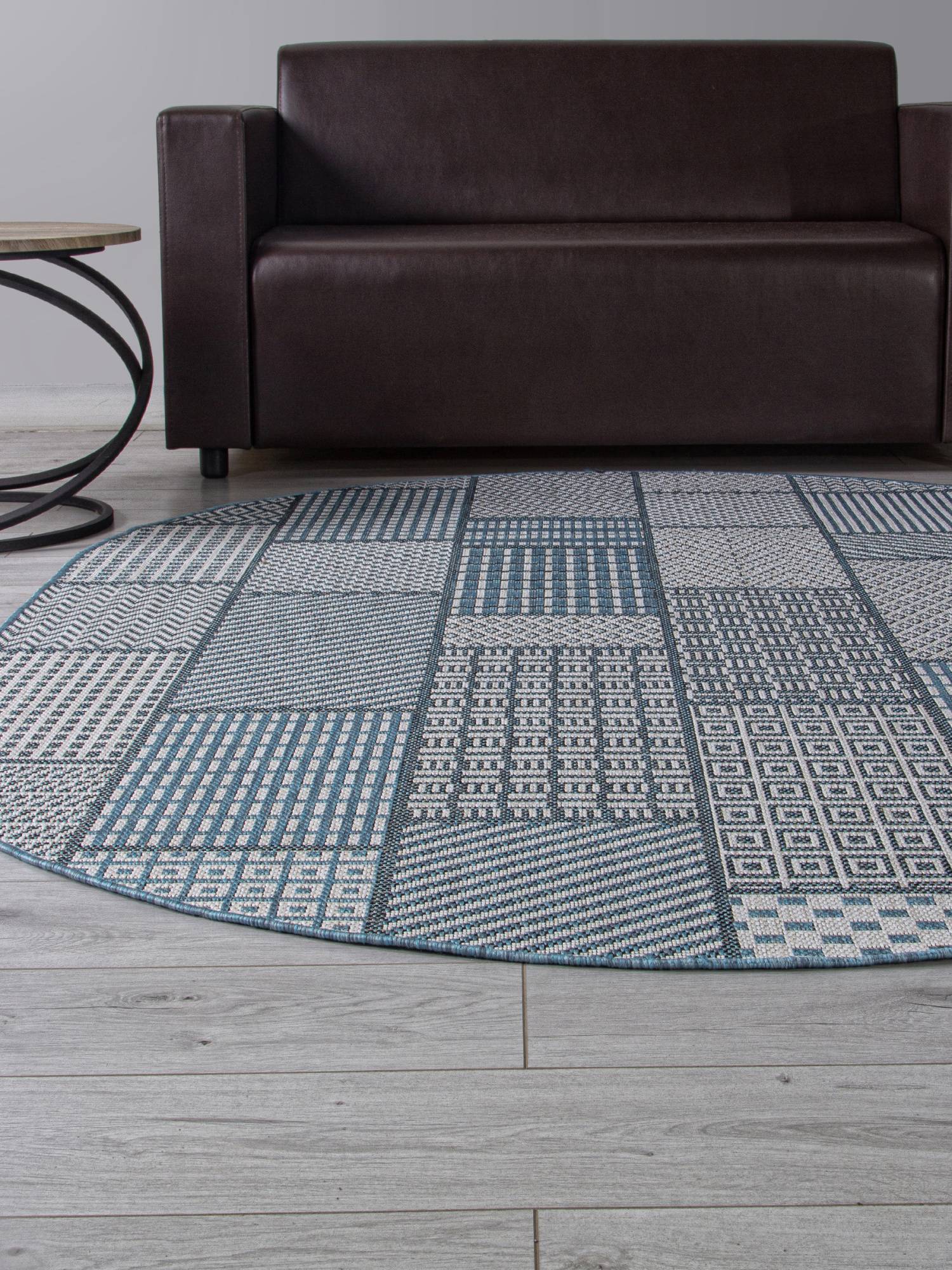 Красивый, современный ковер с оригинальным орнаментом с геометрическими элементами и расцветкой в холодных тонах.