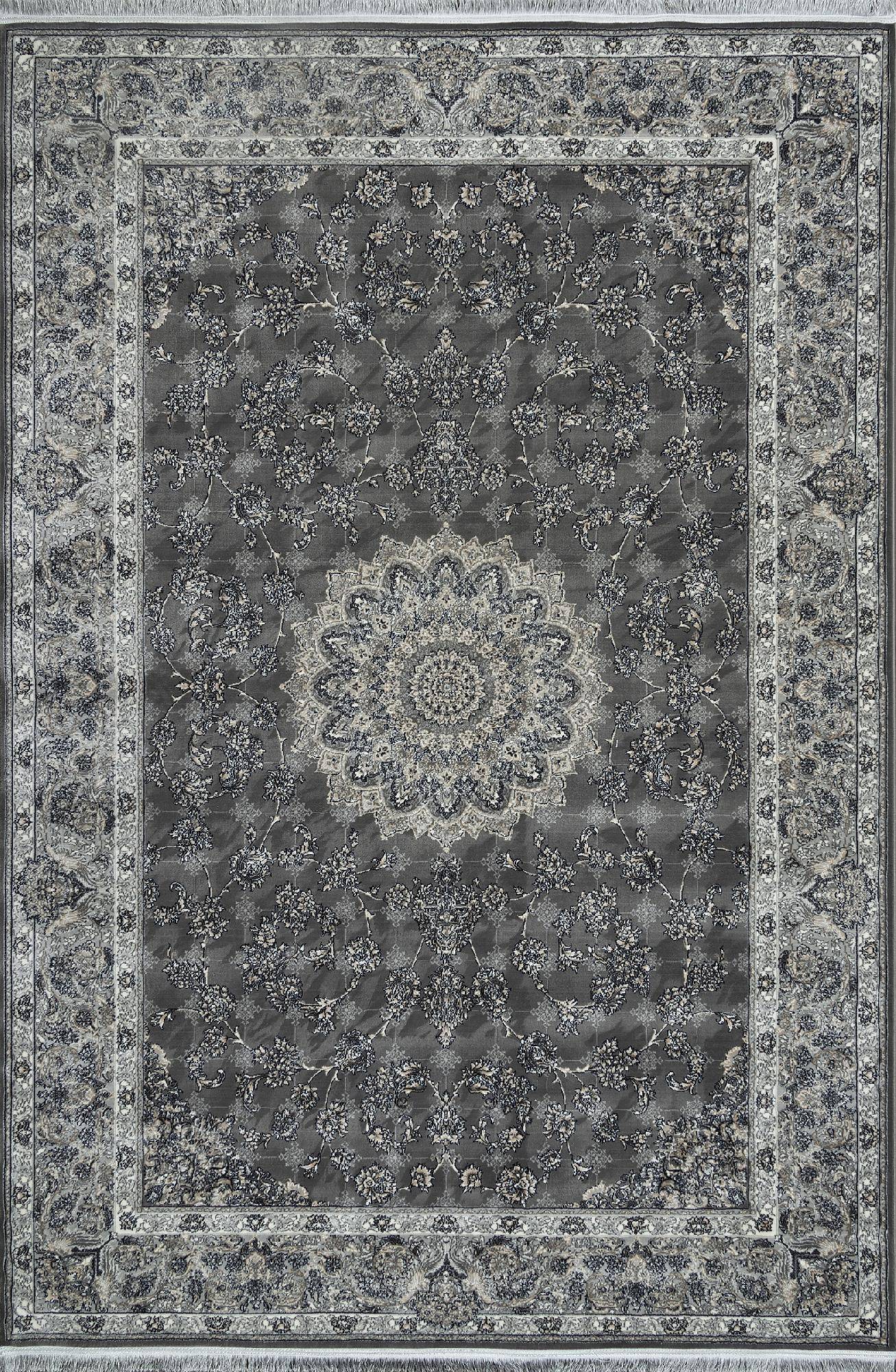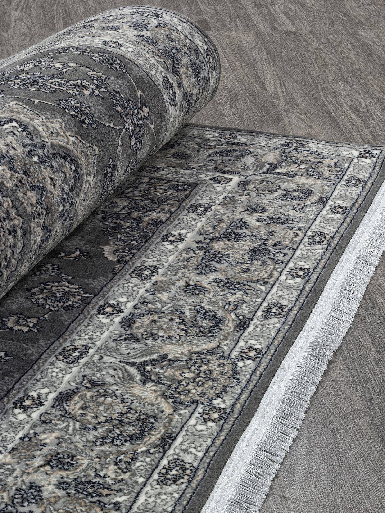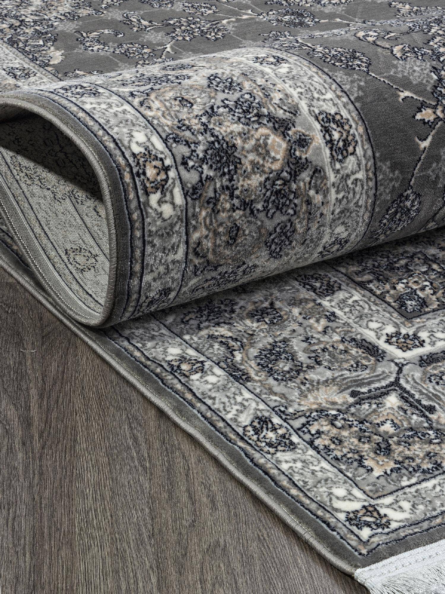 Детализированный оранамент и расцветка в серых тонах делают этот ковер модным украшением для интерьера гостиной или зала.