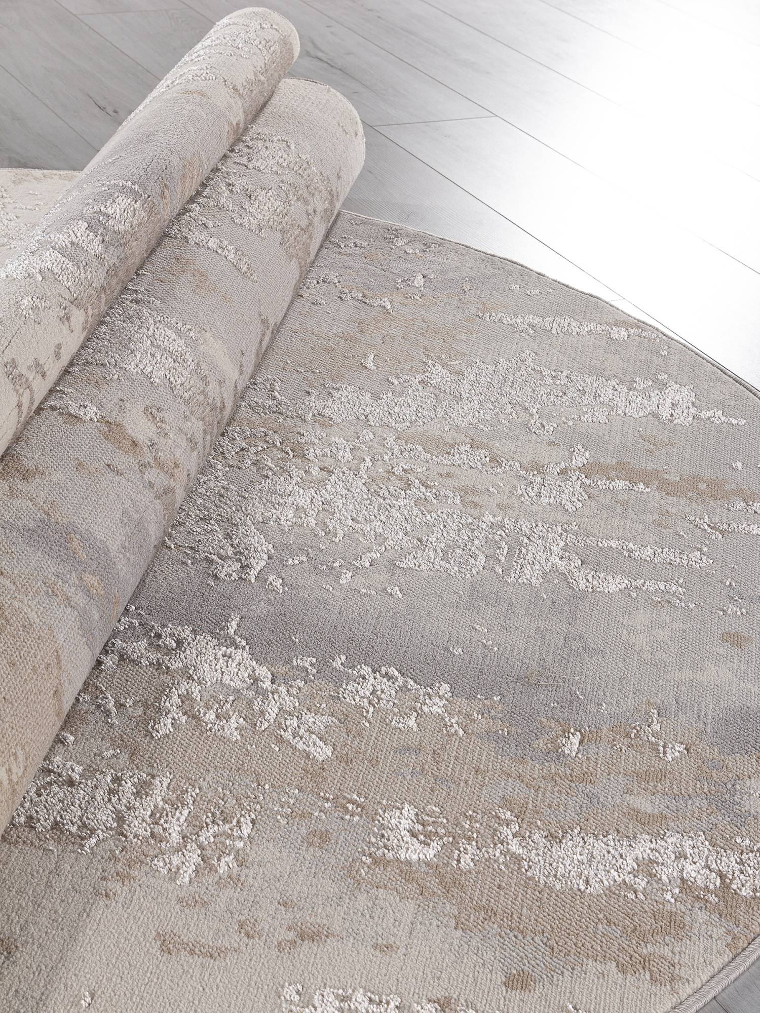 Абстрактный рисунок, серо-бежевая расцветка и модная овальная форма. Этот ковер будет стильным дополнением для интерьера вашего дома.