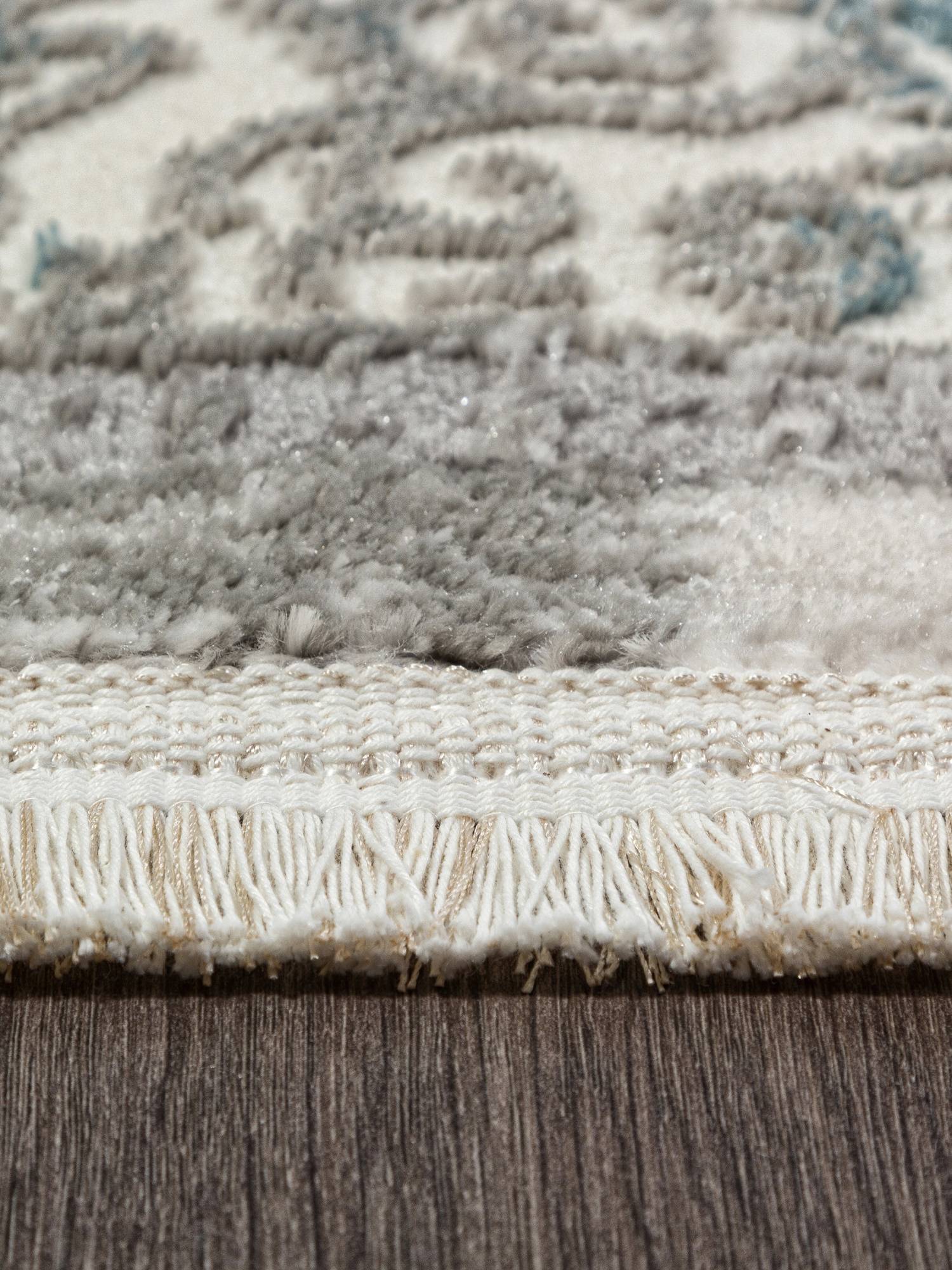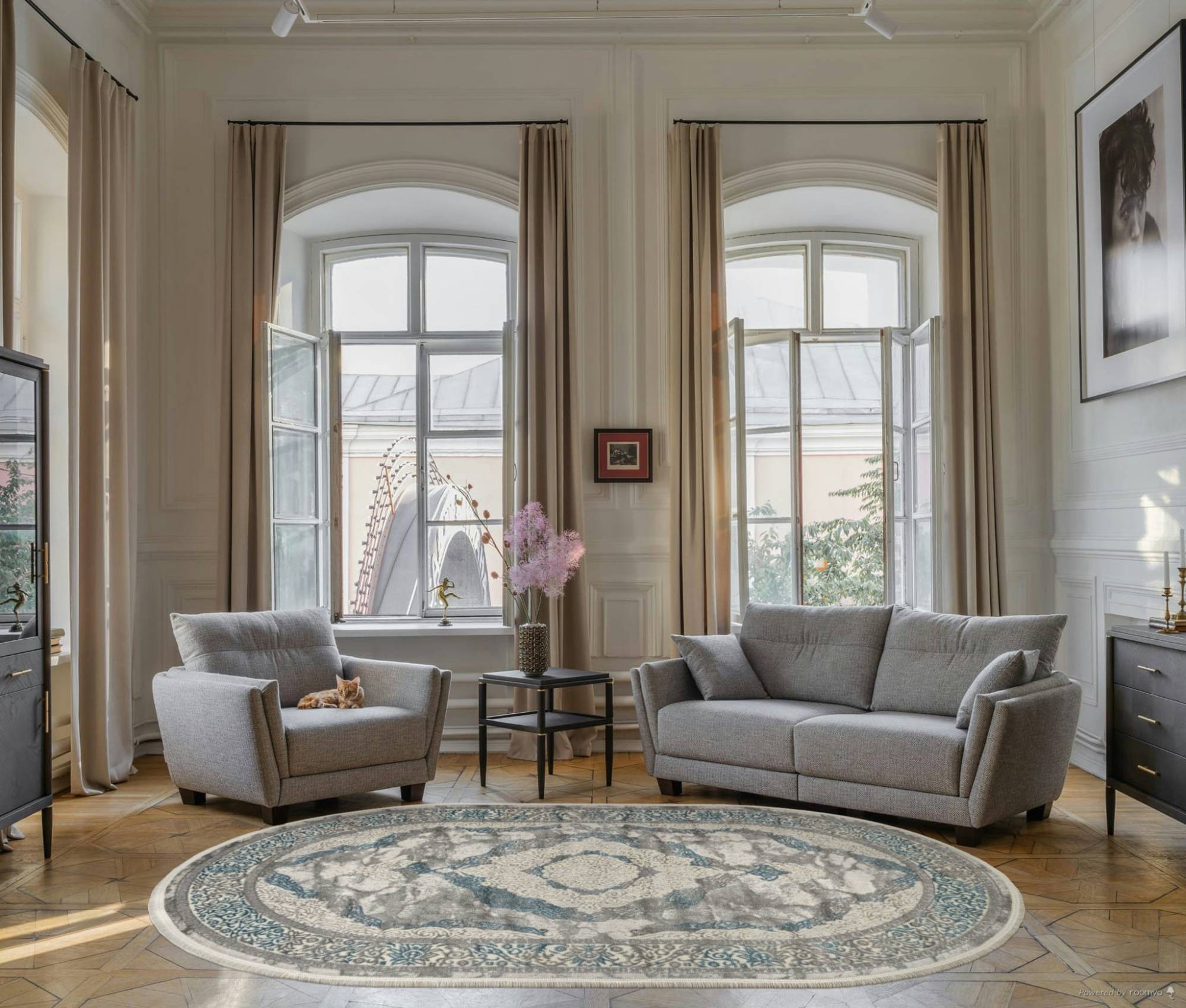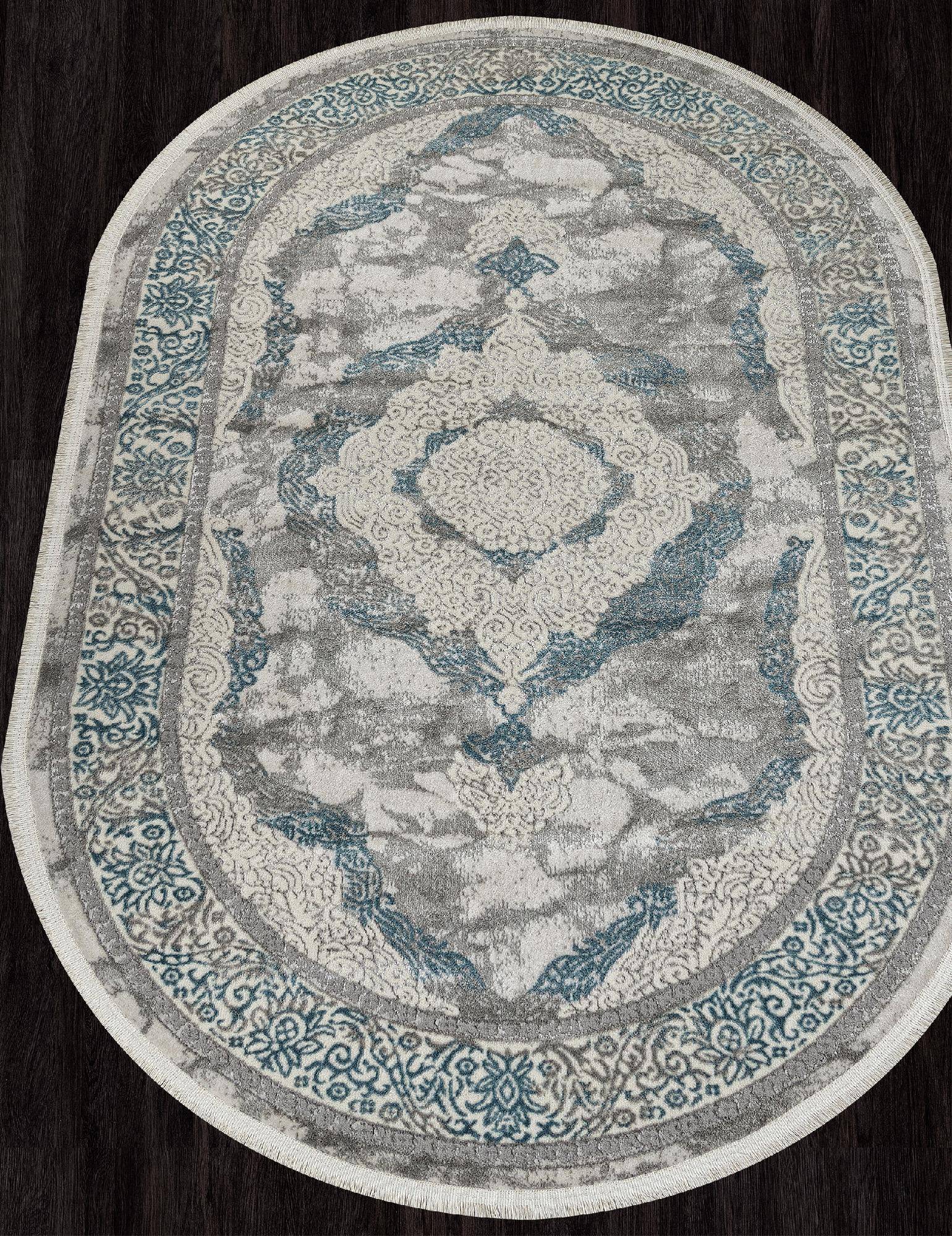 Оригинальная серо-синяя расцветка, детализированный орнамент и модная овальная форма позволяют этому ковру стать отличным украшением для интерьера вашего дома.