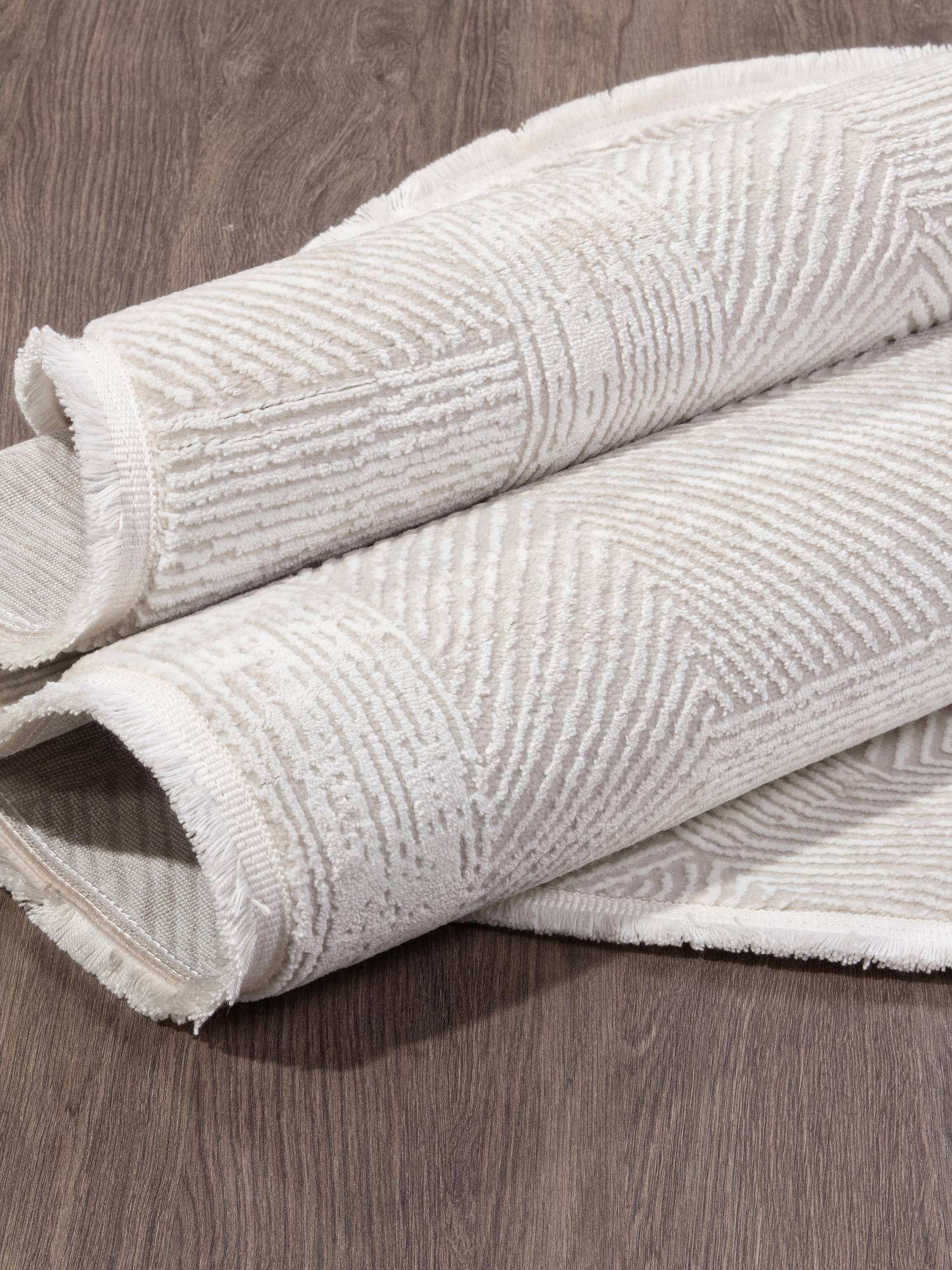 Светлая кремово-серая расцветка, модная овальная форма и геометрический орнамент позволяют этому ковру отлично дополнять любой современный интерьер.