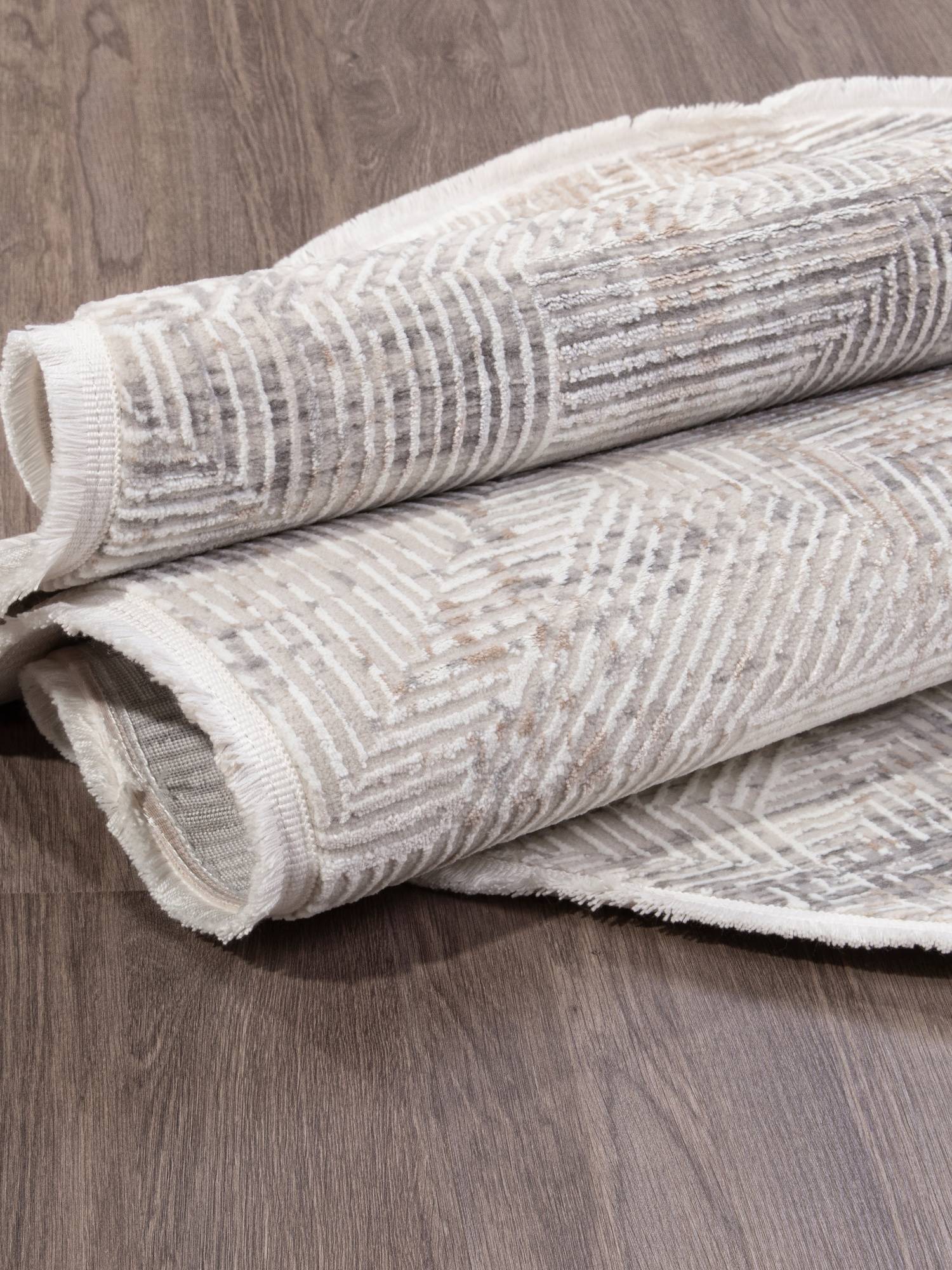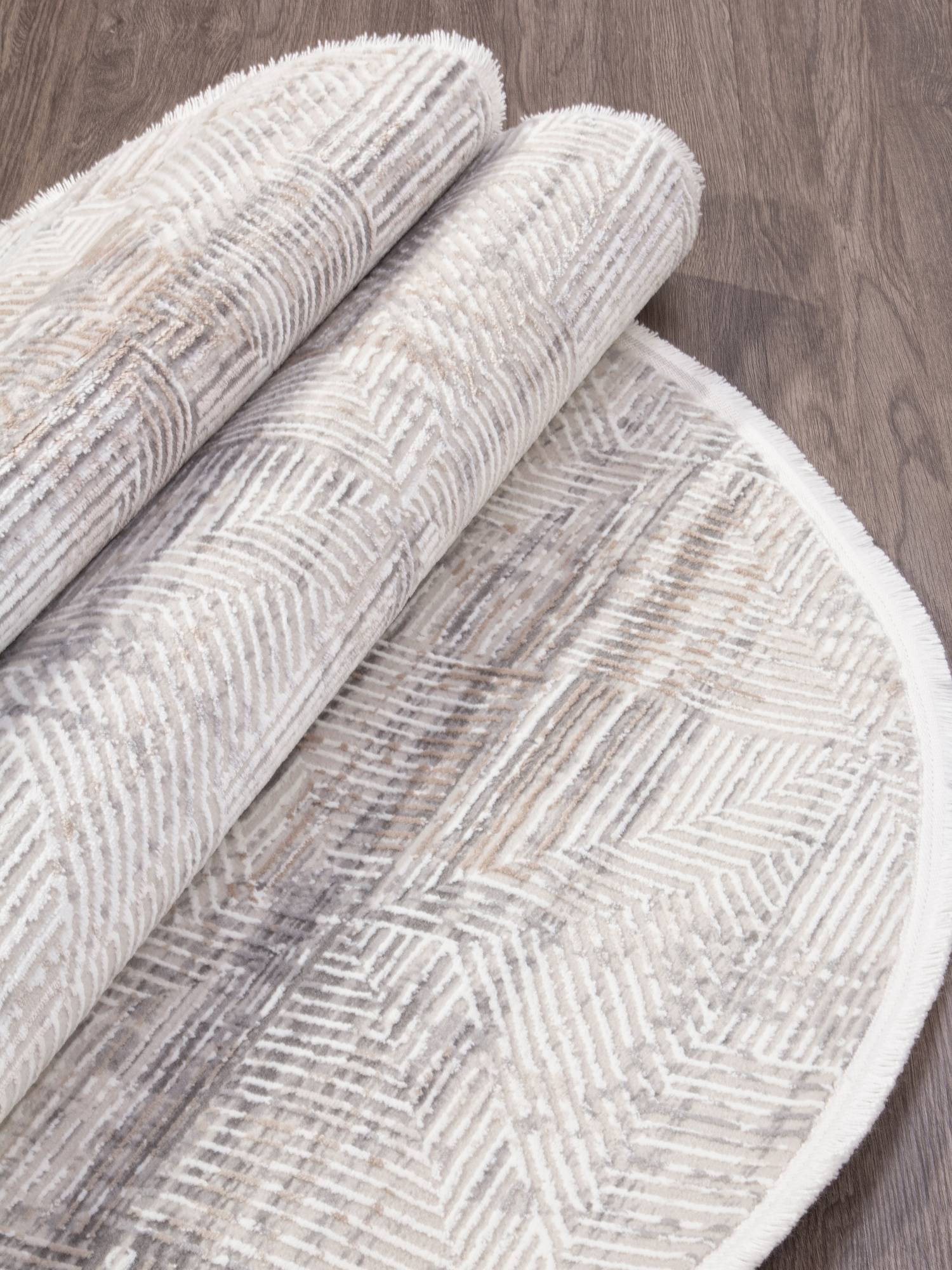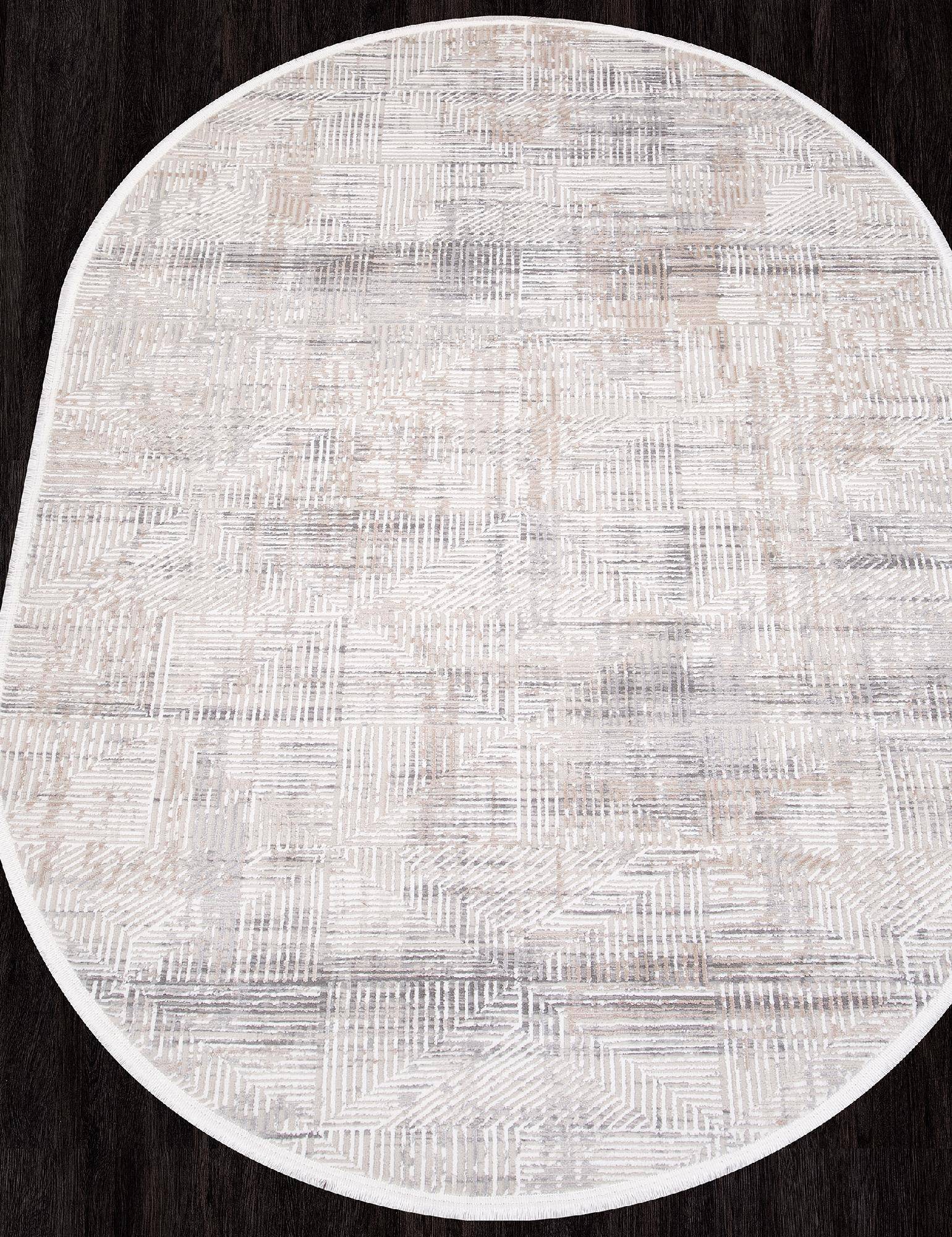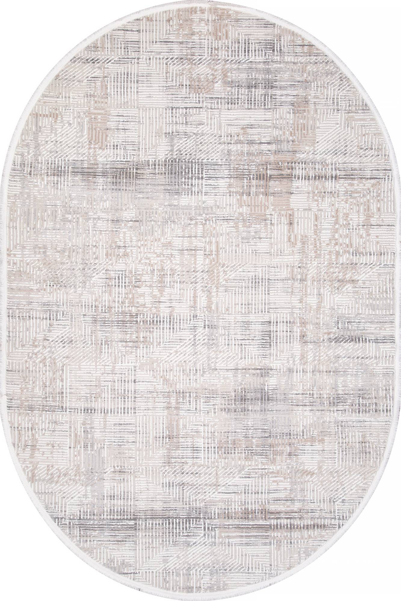 Геометрический орнамент в бежево-серой расцветке и модная овальная форма. Это ковровое изделие будет хорошим и стильным украшением для интерьера вашего дома.