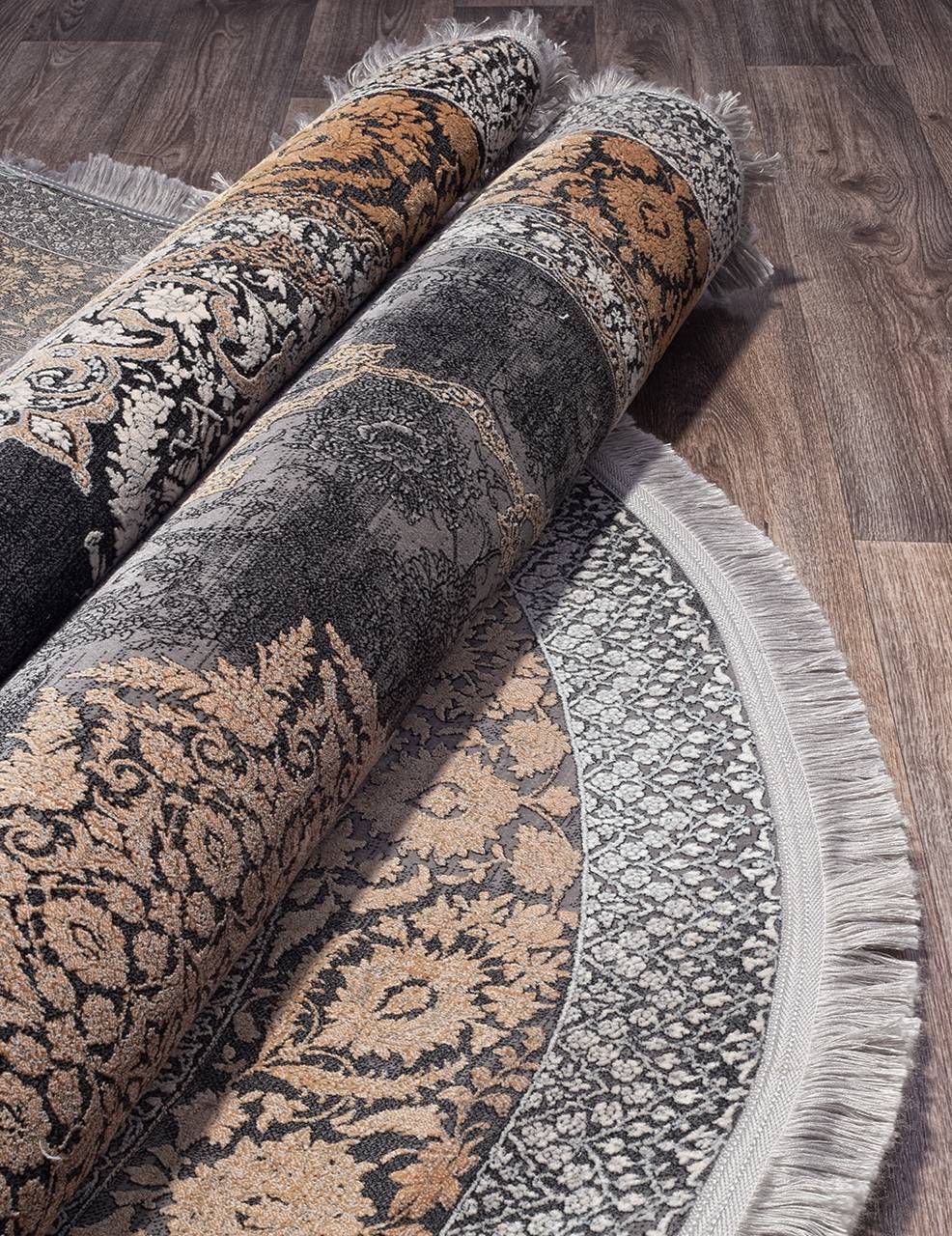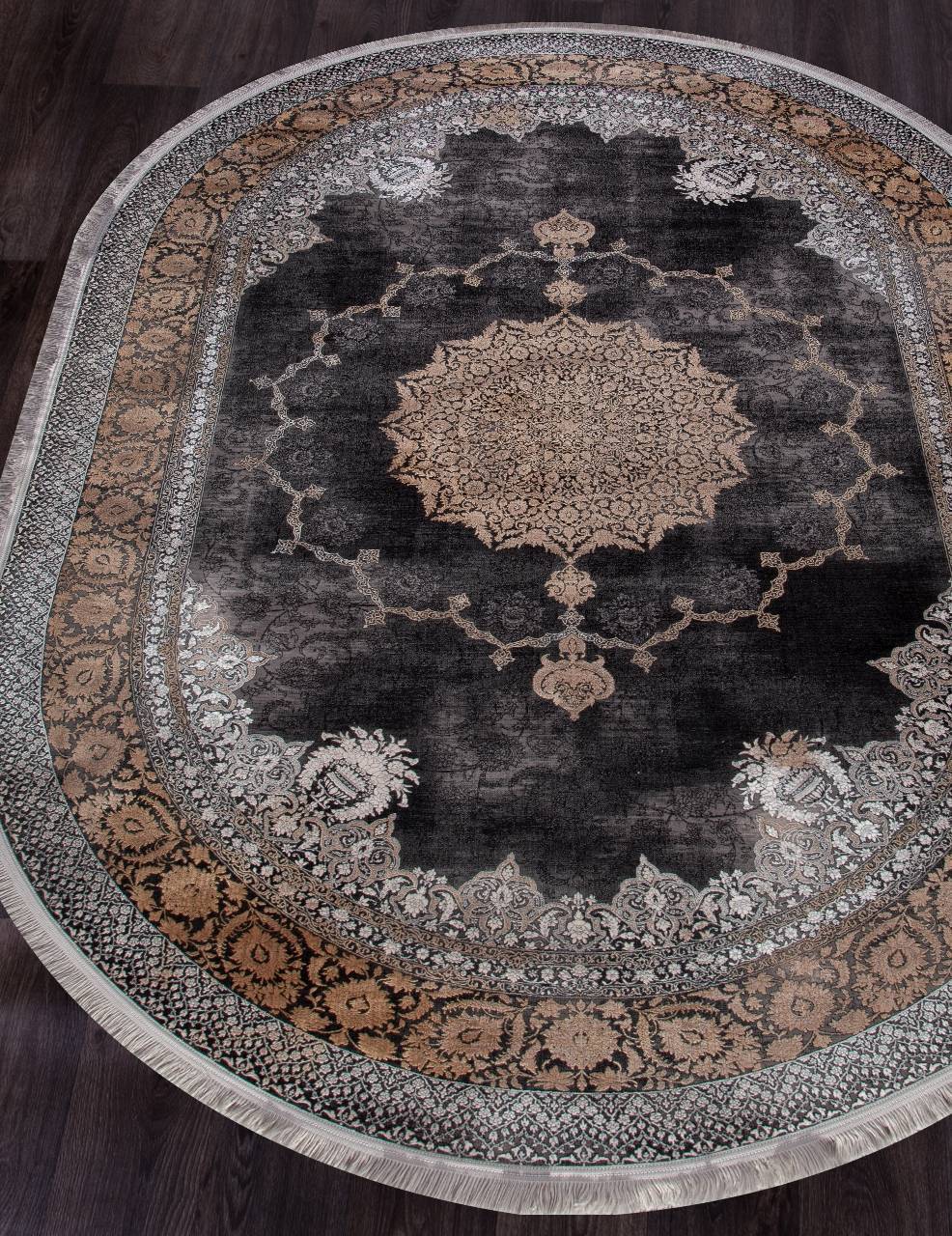 Красивый овальный ковер с детализированным абстрактным рисунком в классическом стиле и короткой бахромой по краям. Ковровое изделие сделано из бамбукового шелка - это очень гладкий и приятный на ощупь материал, который блестит и переливается при солнечном свете.