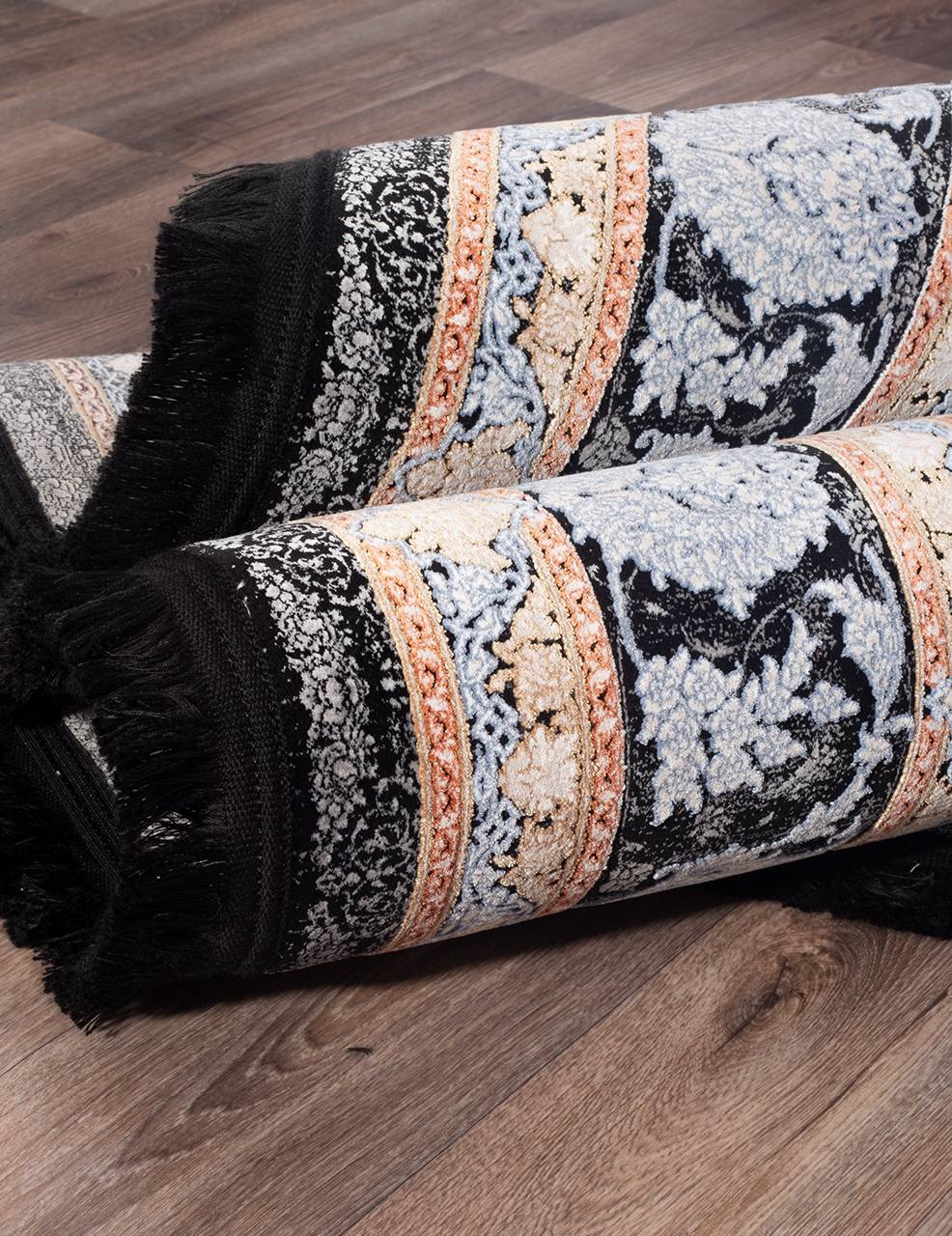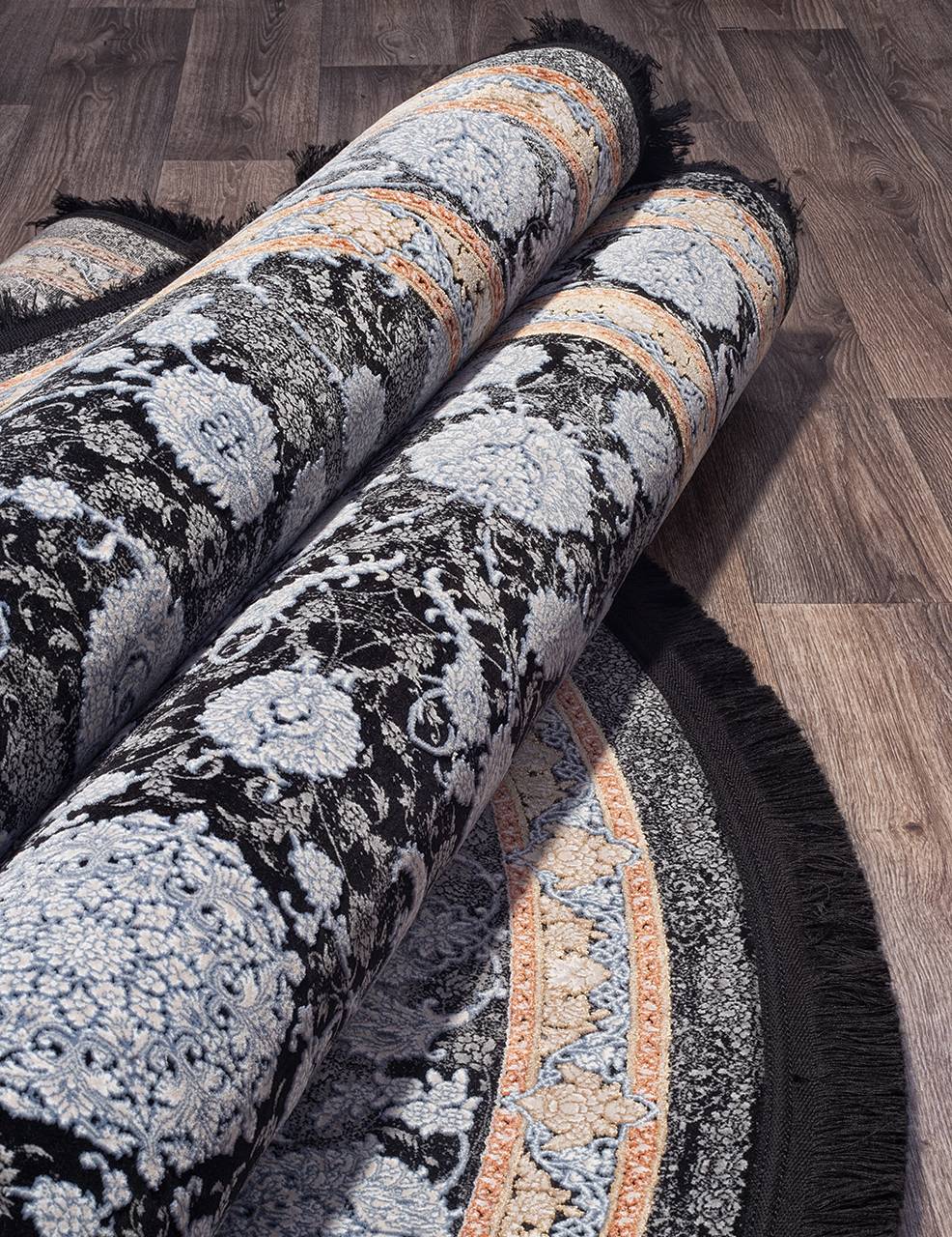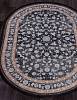 Иранский овальный ковер из коллекции MUSKAT в серо-черной расцветке. Ковровое покрытие из бамбукового шелка красиво блестит и переливается на свету.