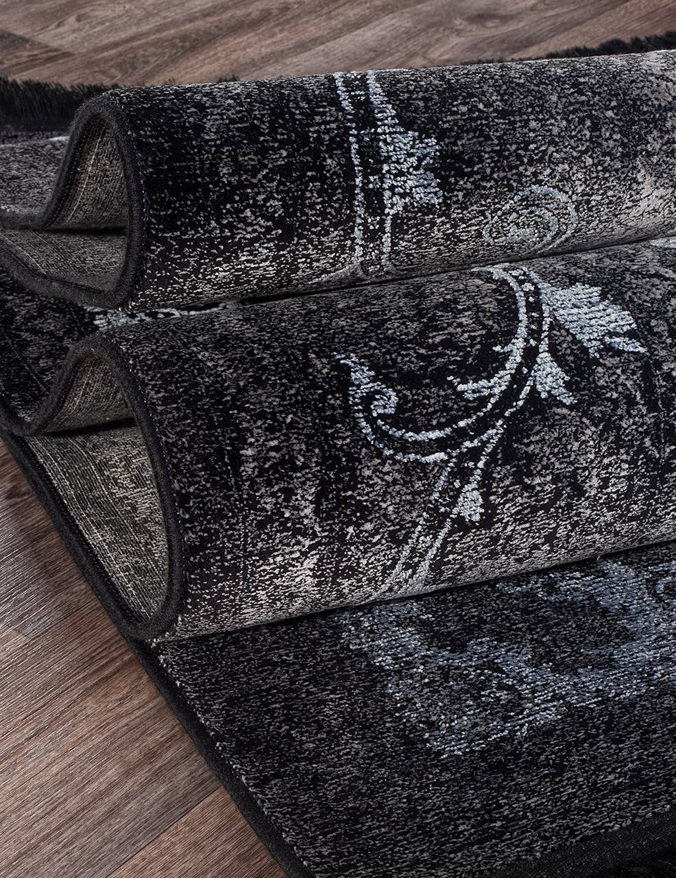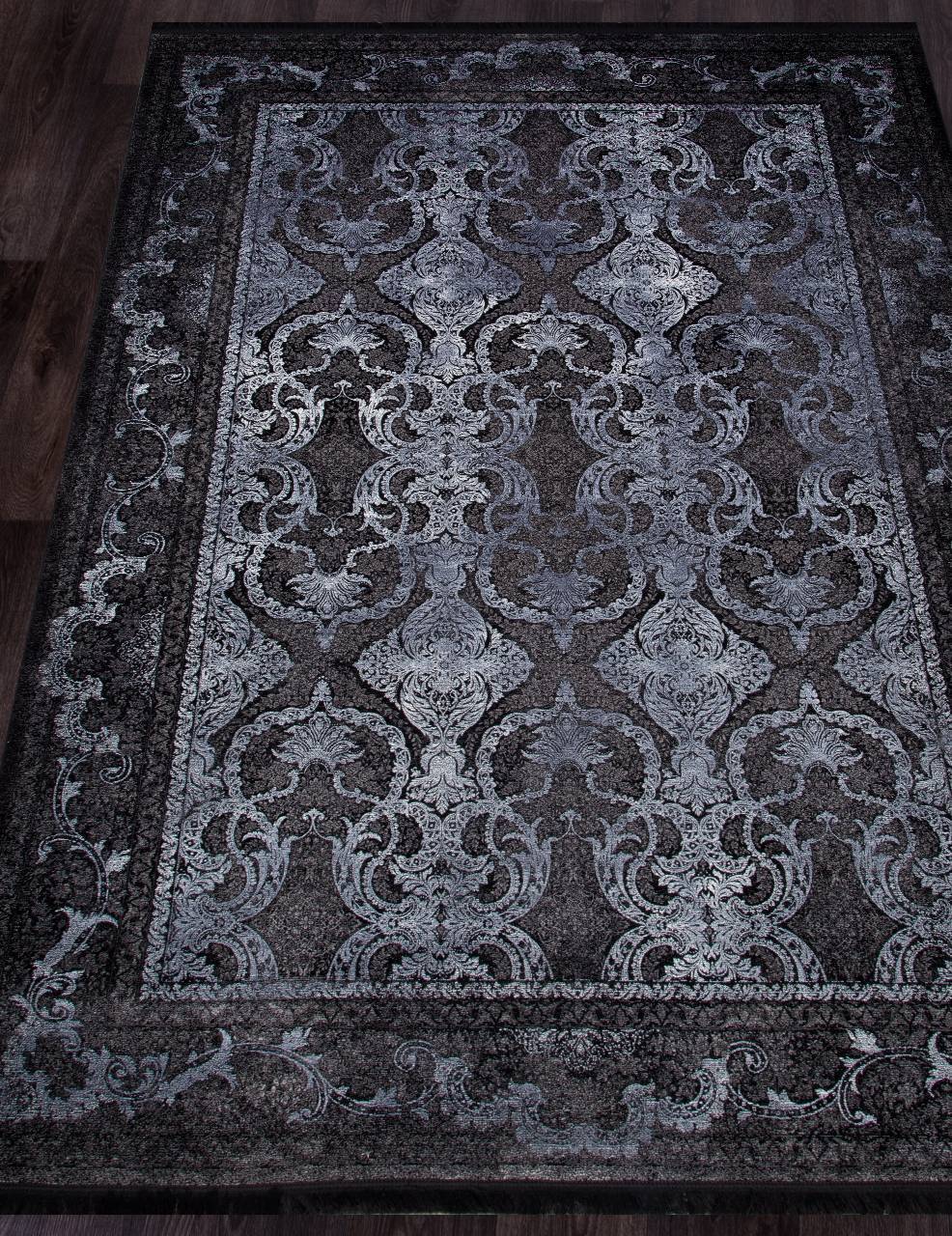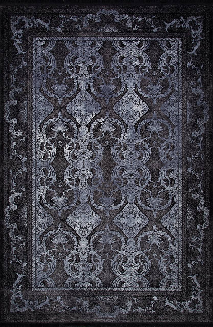 Стильный ковер из бамбукового шелка в красивой черно-синей расцветке. Элегантное ковровое изделие которое привнесет в дом ощущение богатства.