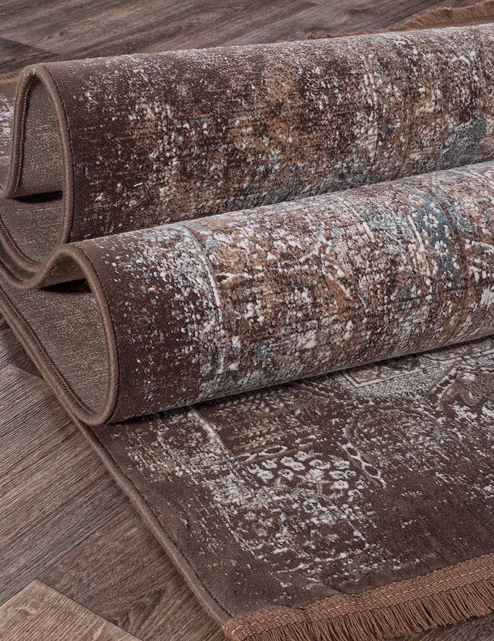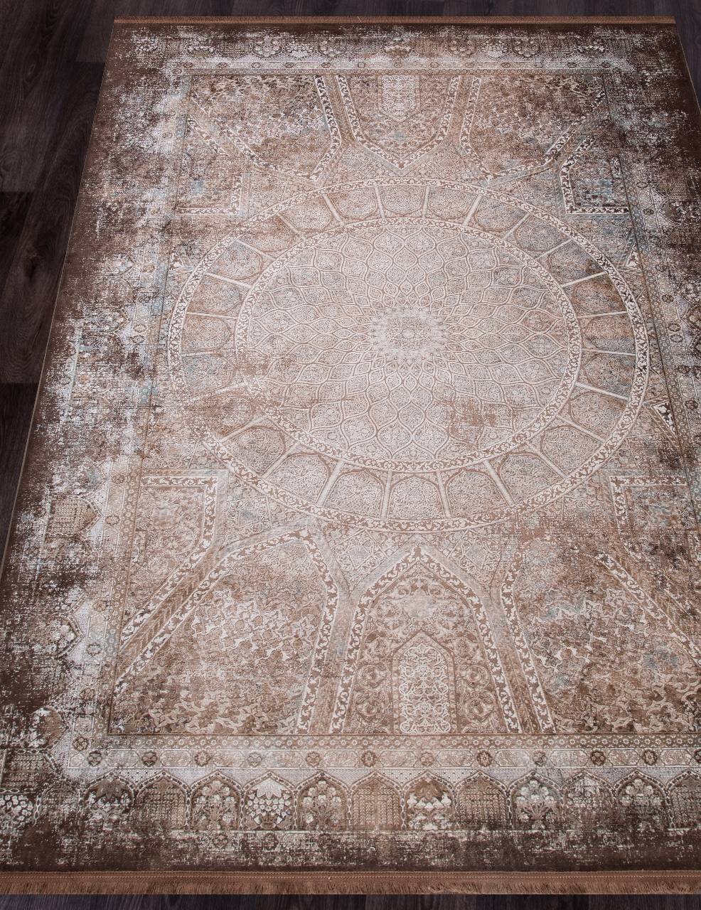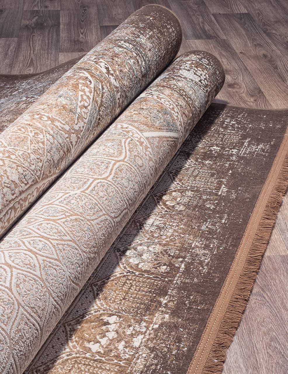 Тканый акриловый ковер в котором гармонично сочетаются бежевые и коричневые цвета, а винтажная потертость делает его более стильным.