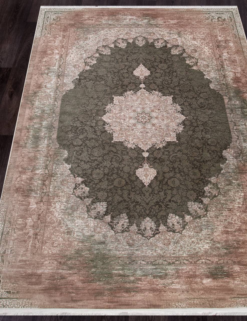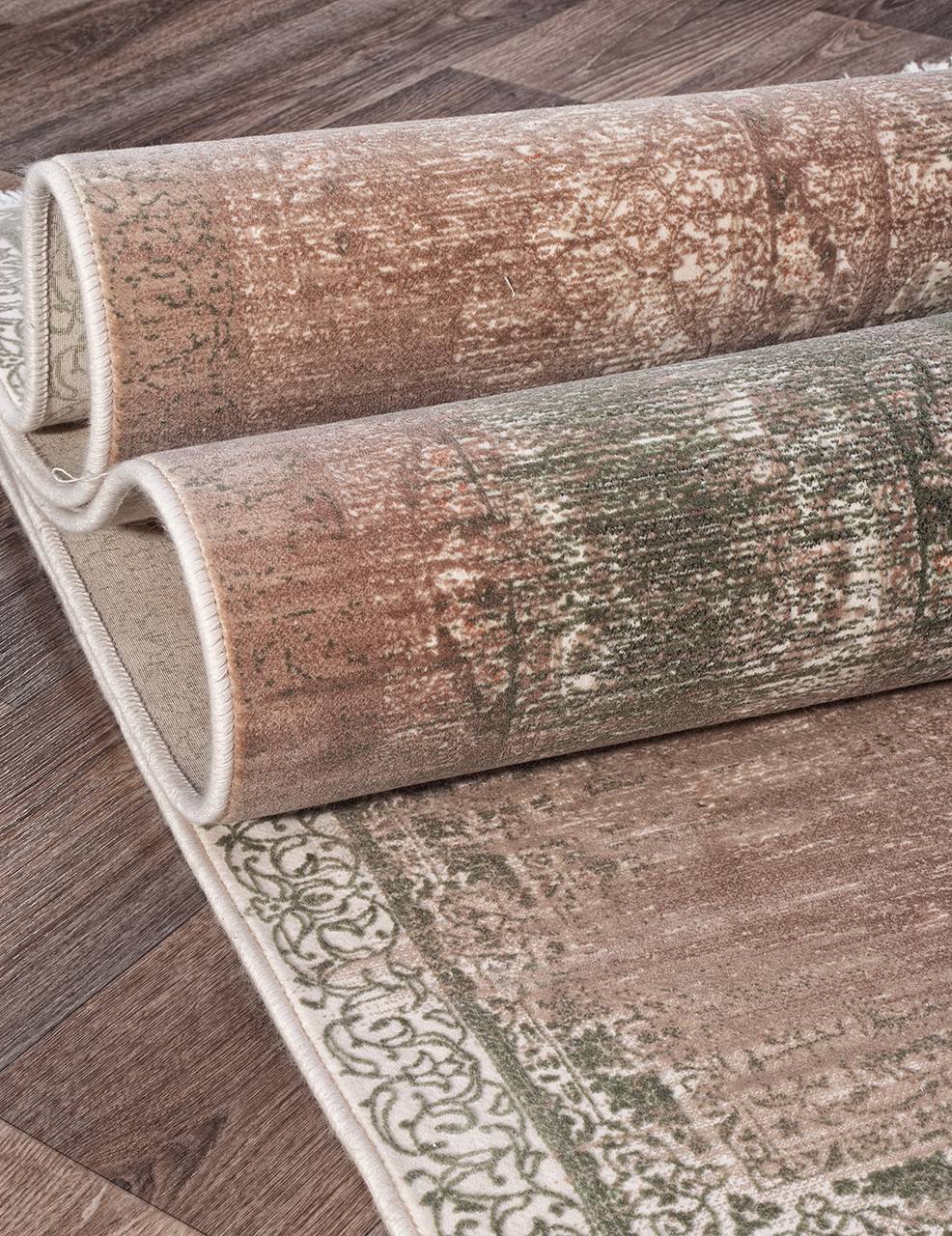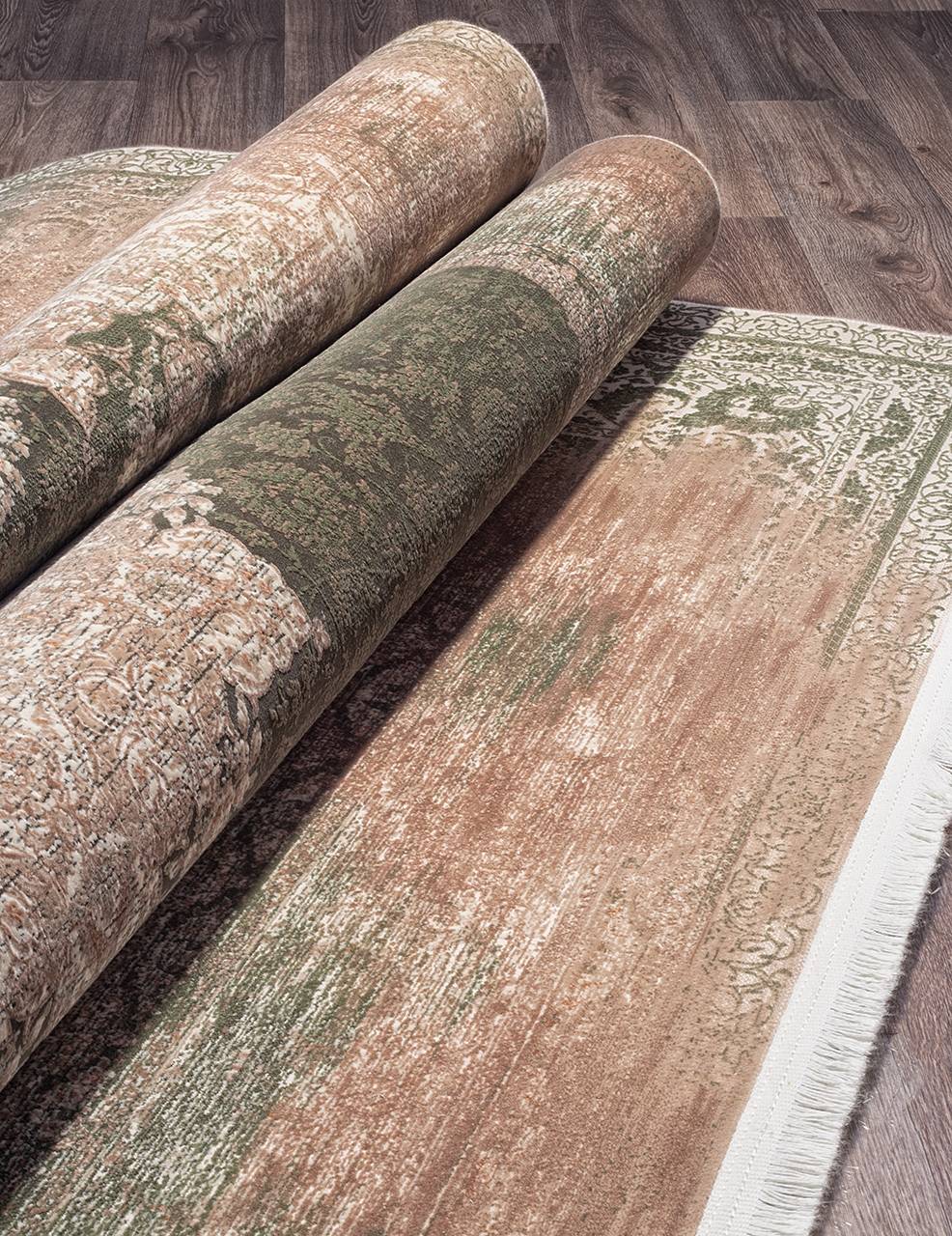 Бежевый фон ковра с детализированным рисунком и зеленый орнамент в центре отлично дополняют друг друга, а винтажная потертость делает ковровое покрытие оригинальным. Благодаря большой линейке размеров вы можете подобрать нужное вам ковровое изделие под любую комнату.