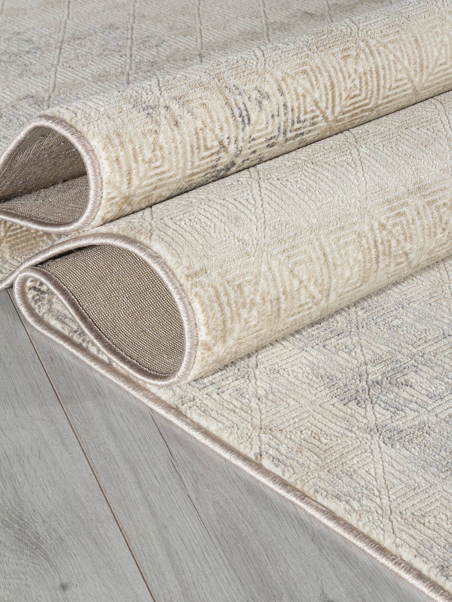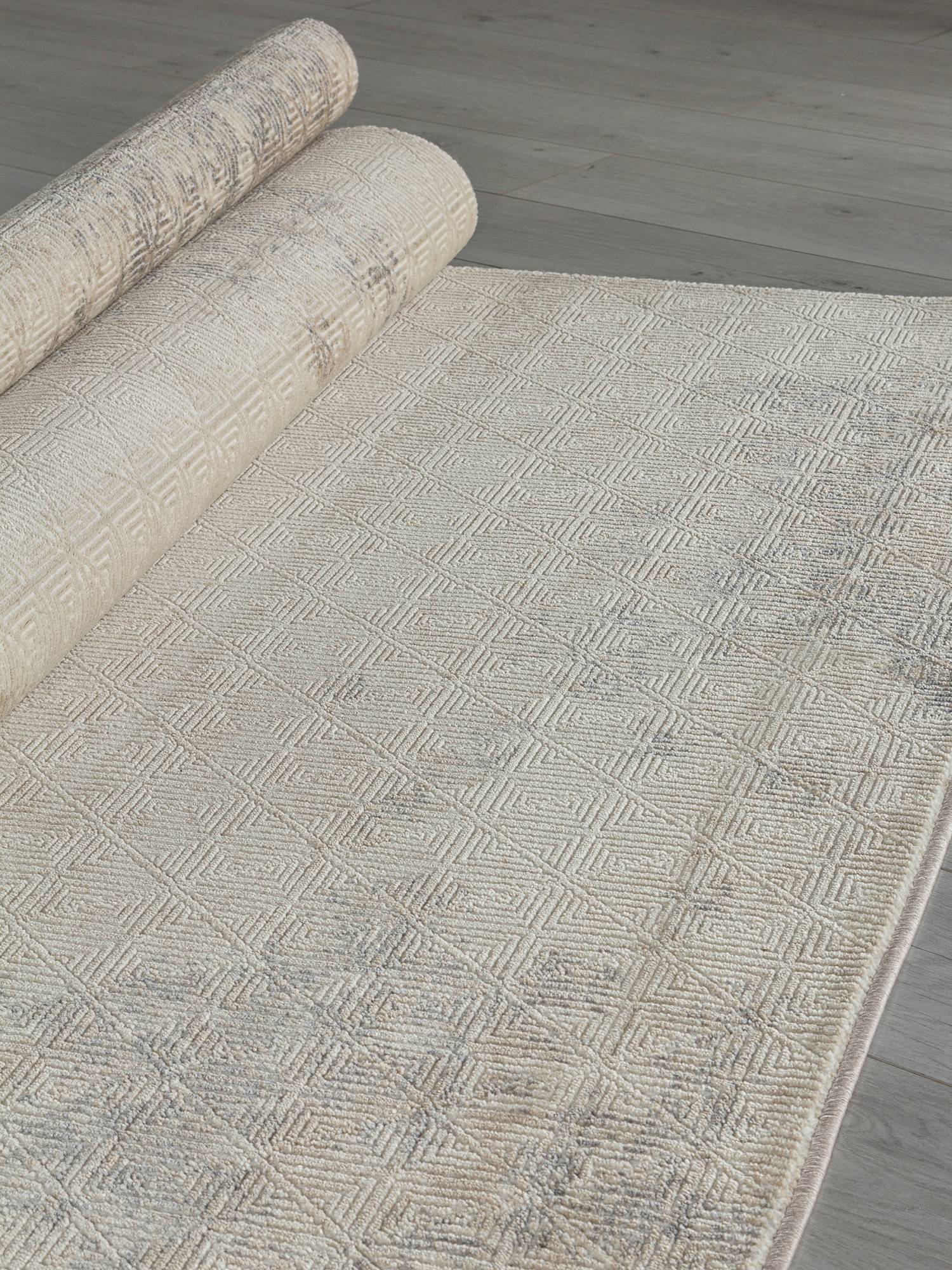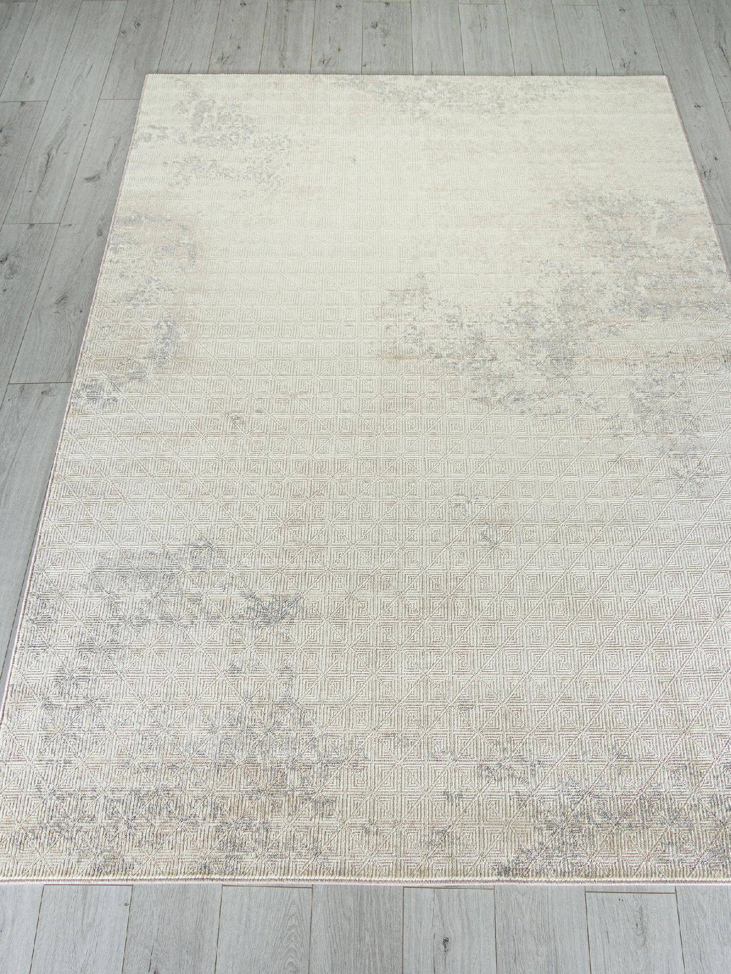 Оригинальный ковер с абстрактным и геометрическим рисунком, а также светлой расцветкой. Этот ковер будет интересным дополнением для интерьера вашего дома.