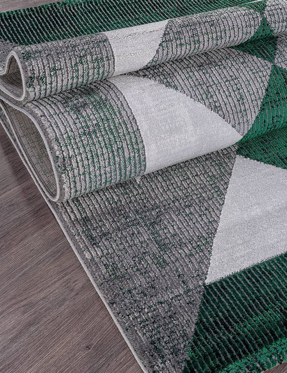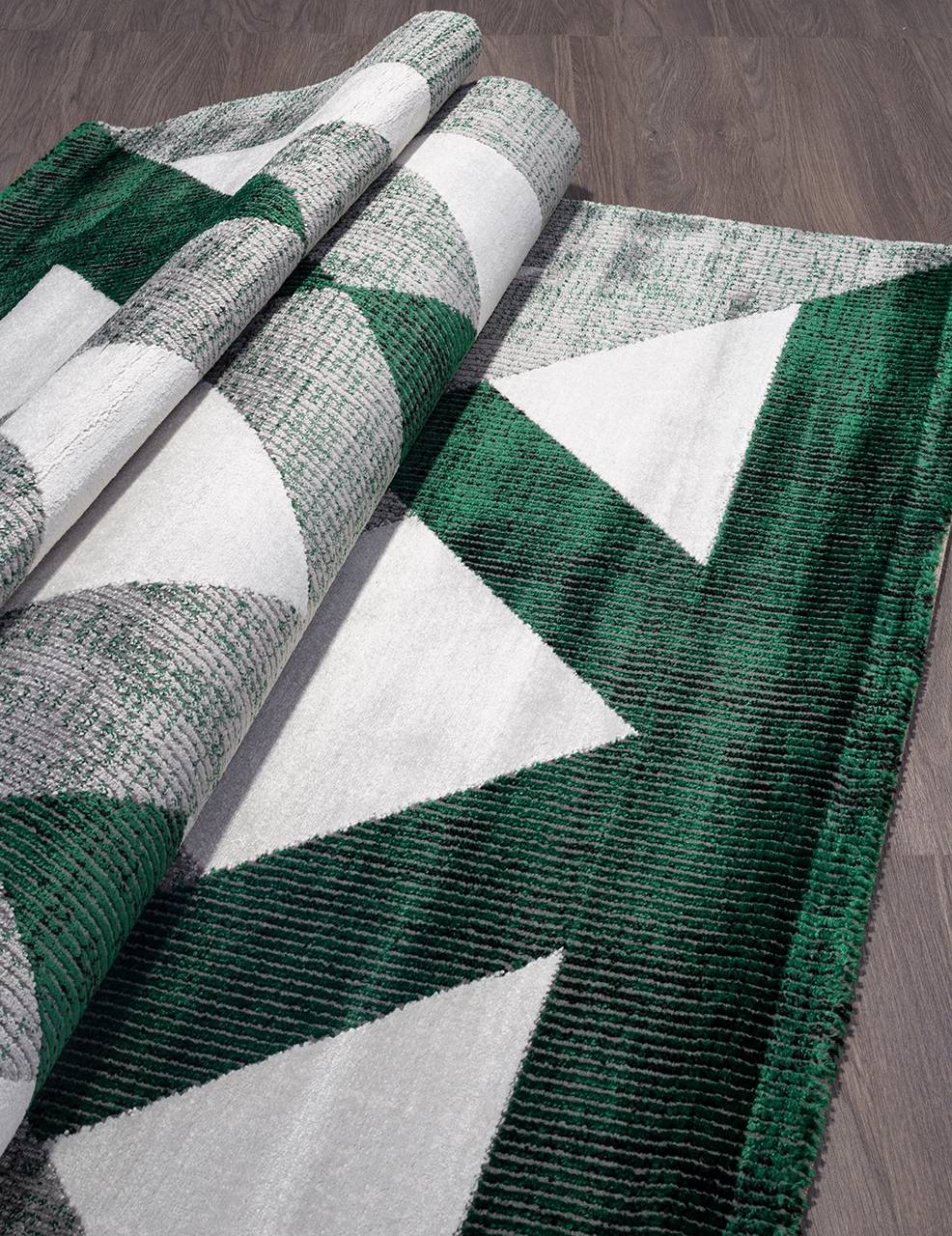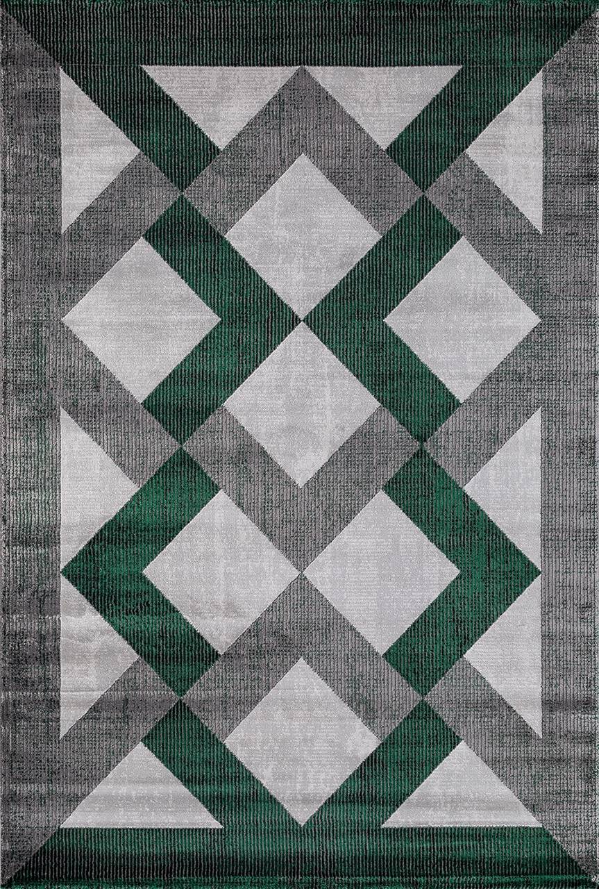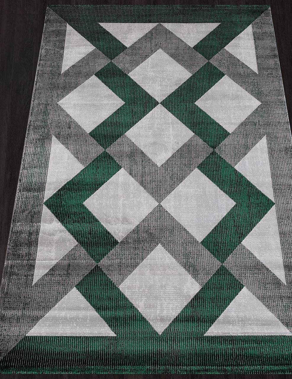 Стильный геометрический рисунок и приятная серо-зеленая расцветка. Такое ковровое изделие подойдет в интерьера со строгим стилем.