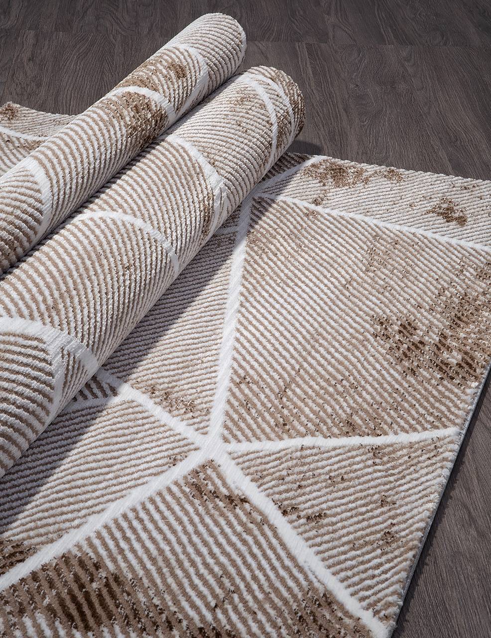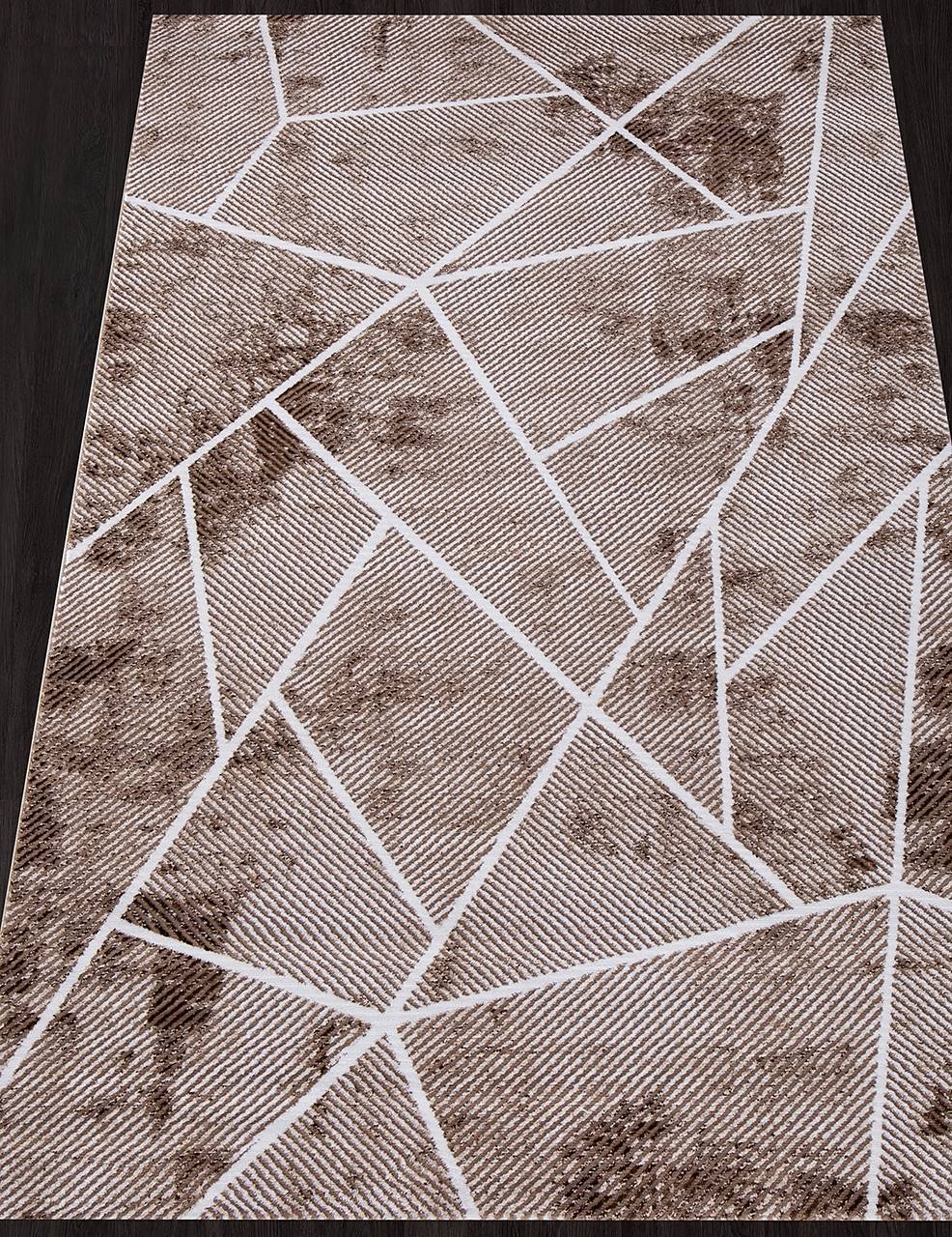 Прямоугольный ковер с оригинальным геометрическим рисунком в бежевых тонах и рельефным ворсом. Благо...