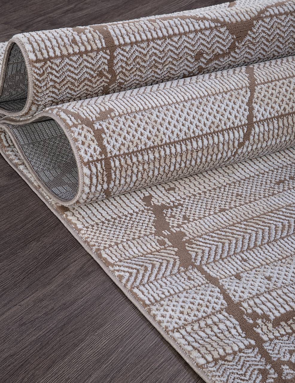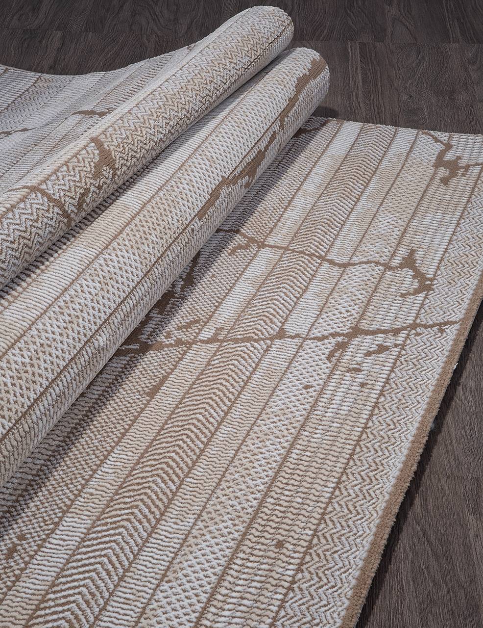 Красивый прямоугольный ковер с современном стиле и нежном бежевом цвете. Благодаря большому выбору размеров его можно подобрать практически для любого помещения. Относительно длинный ворс (9 мм.) придает поверхности ковра мягкость и поглощает звуки, но не делает процесс уборки сложным.
