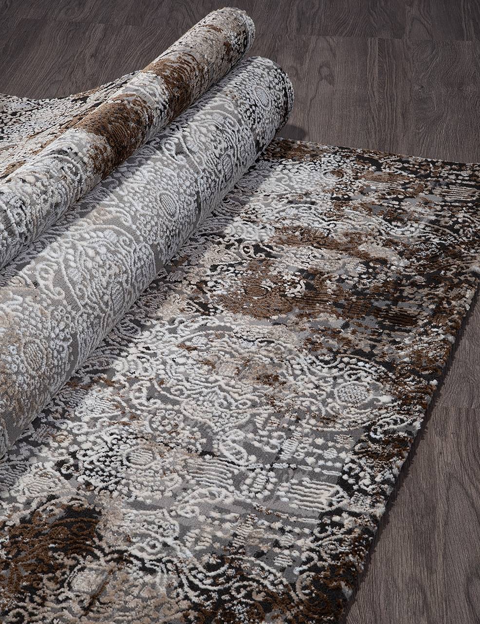 Серо-коричневый ковер с абстрактным рисунком на джутовой основе. Практичный и износостойкий, благодаря относительно не большому ворсу (9 мм). Подойдет практически для любой комнаты в доме.