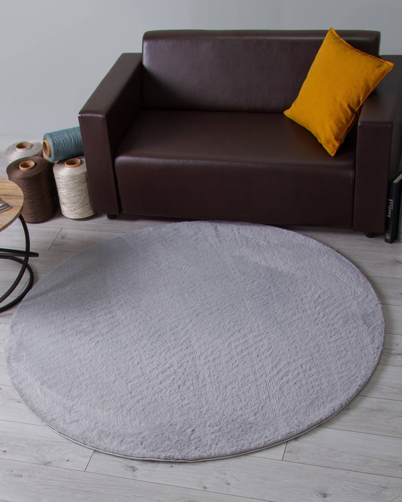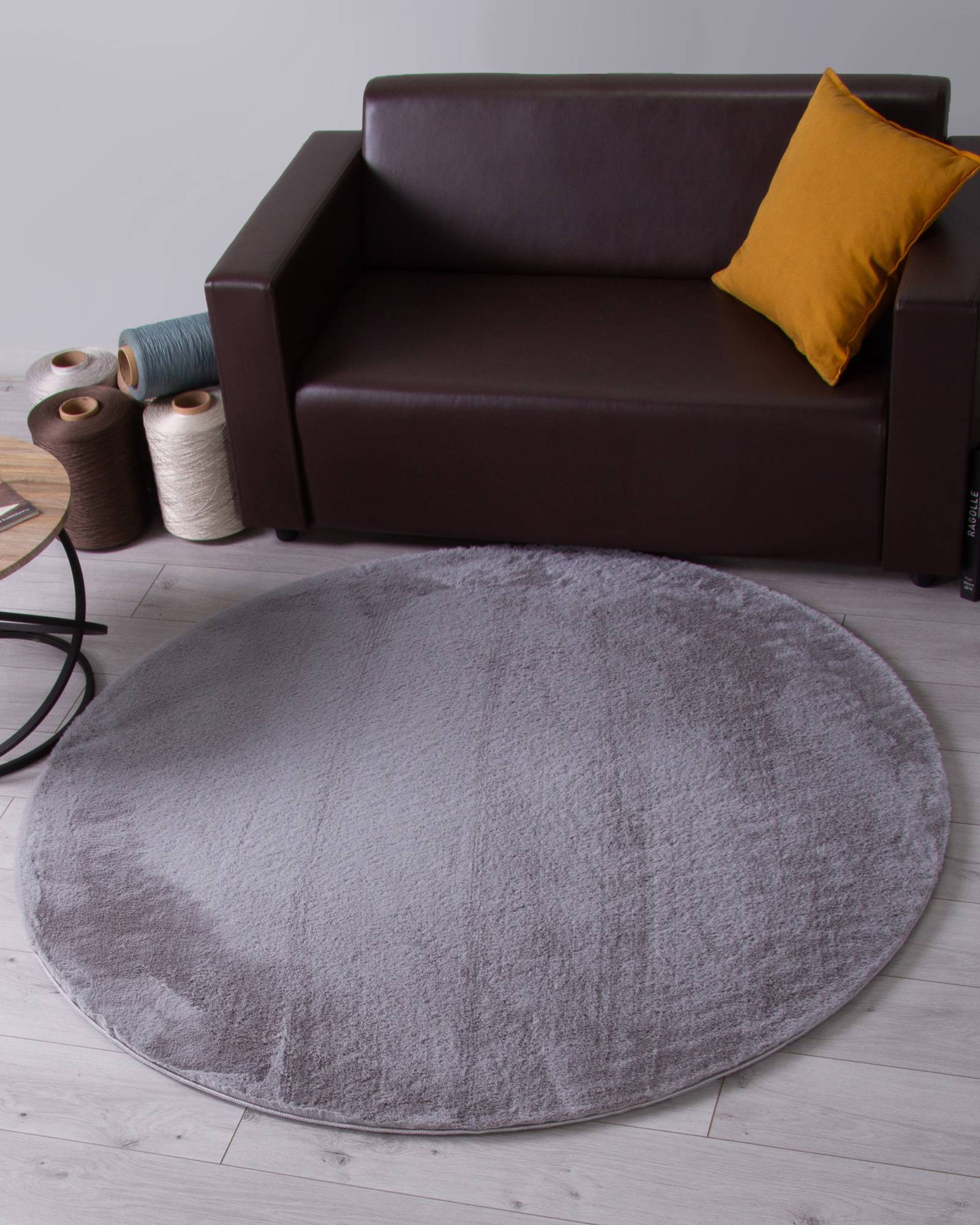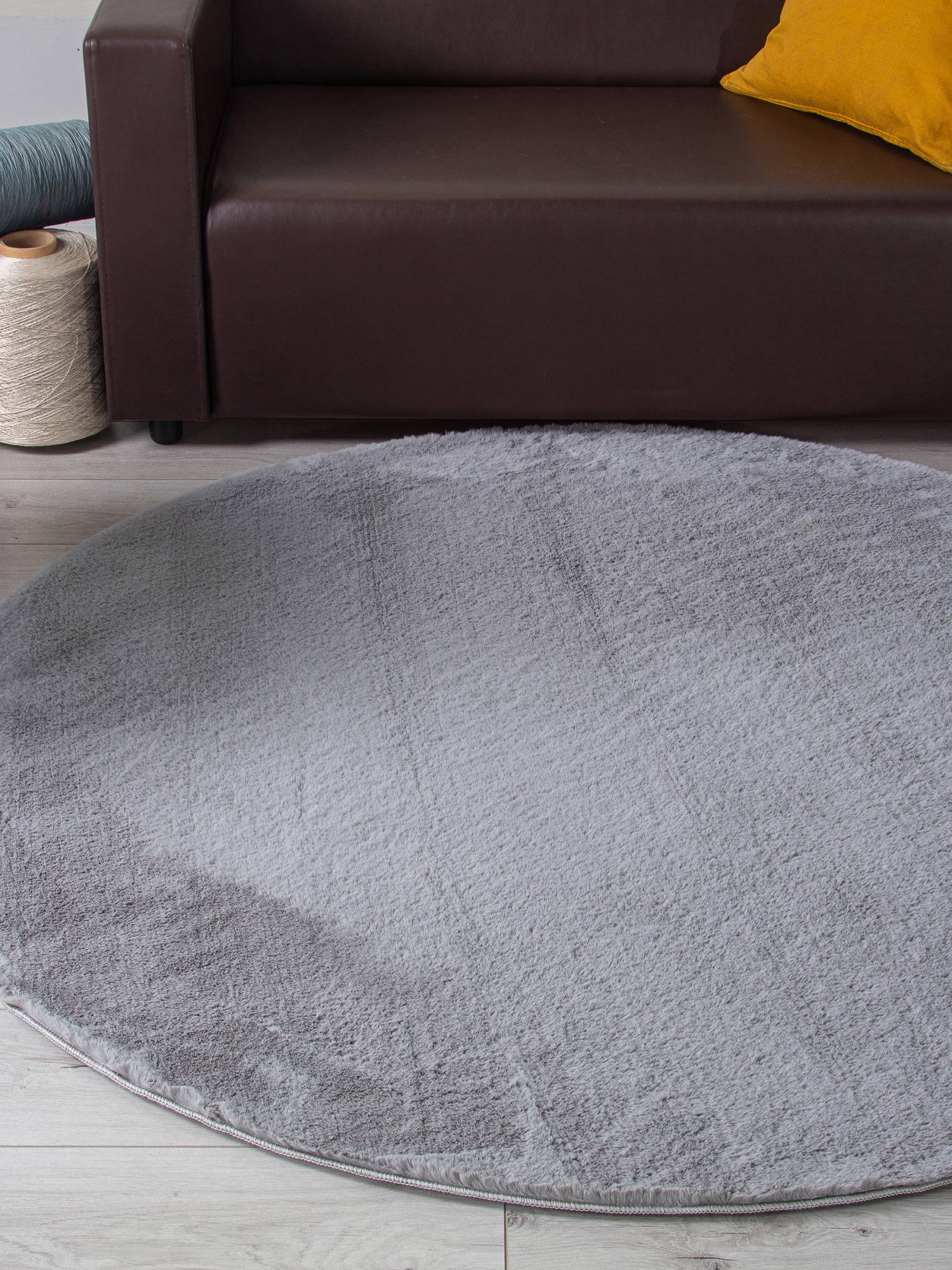 Спокойная, однотонная расцветка в сером тоне, мягкий, длинный ворс, круглая форма и высокое качество изготовления позволяют этому ковру стать интересным дополнением к любому современному интерьеру.