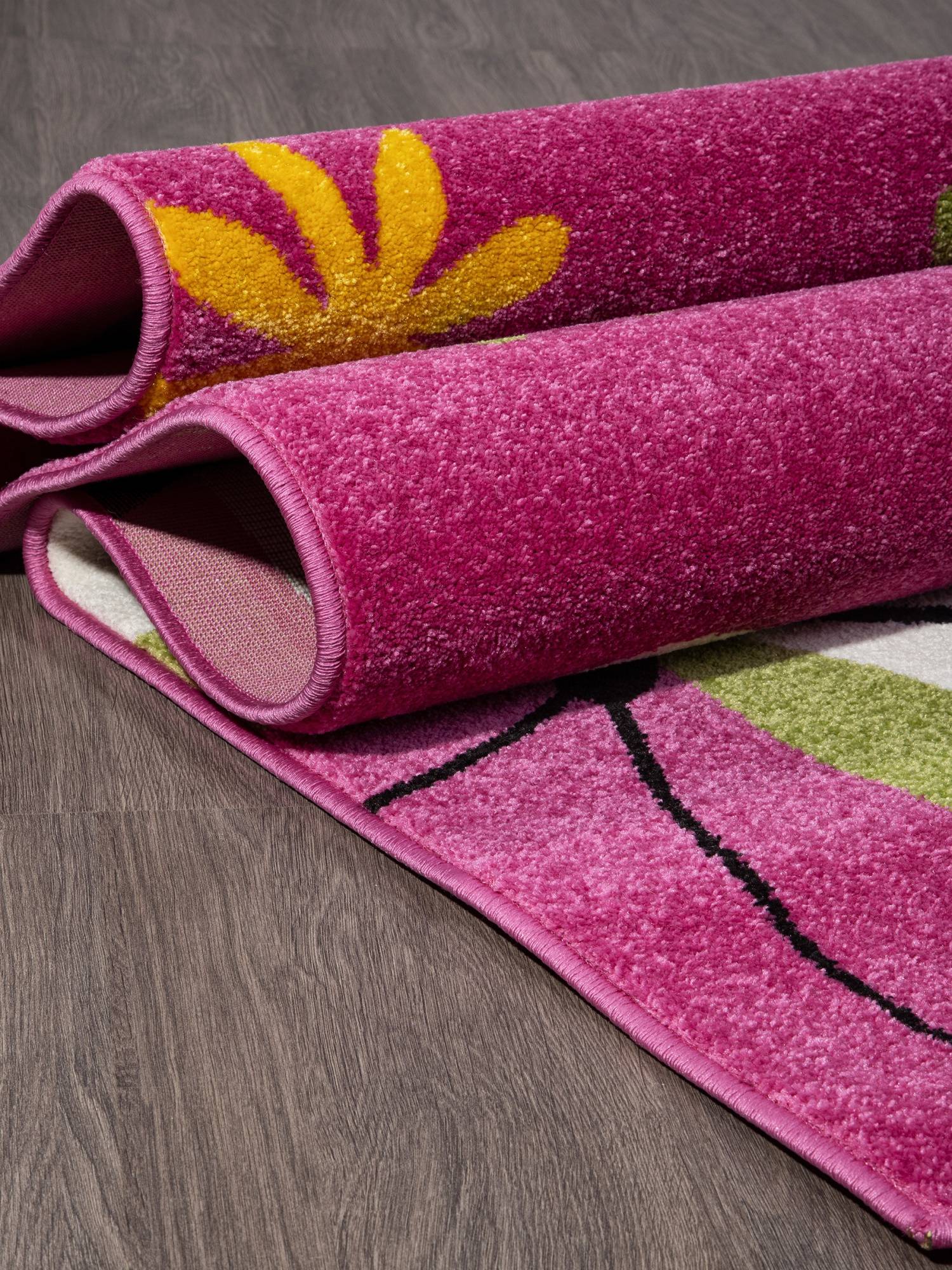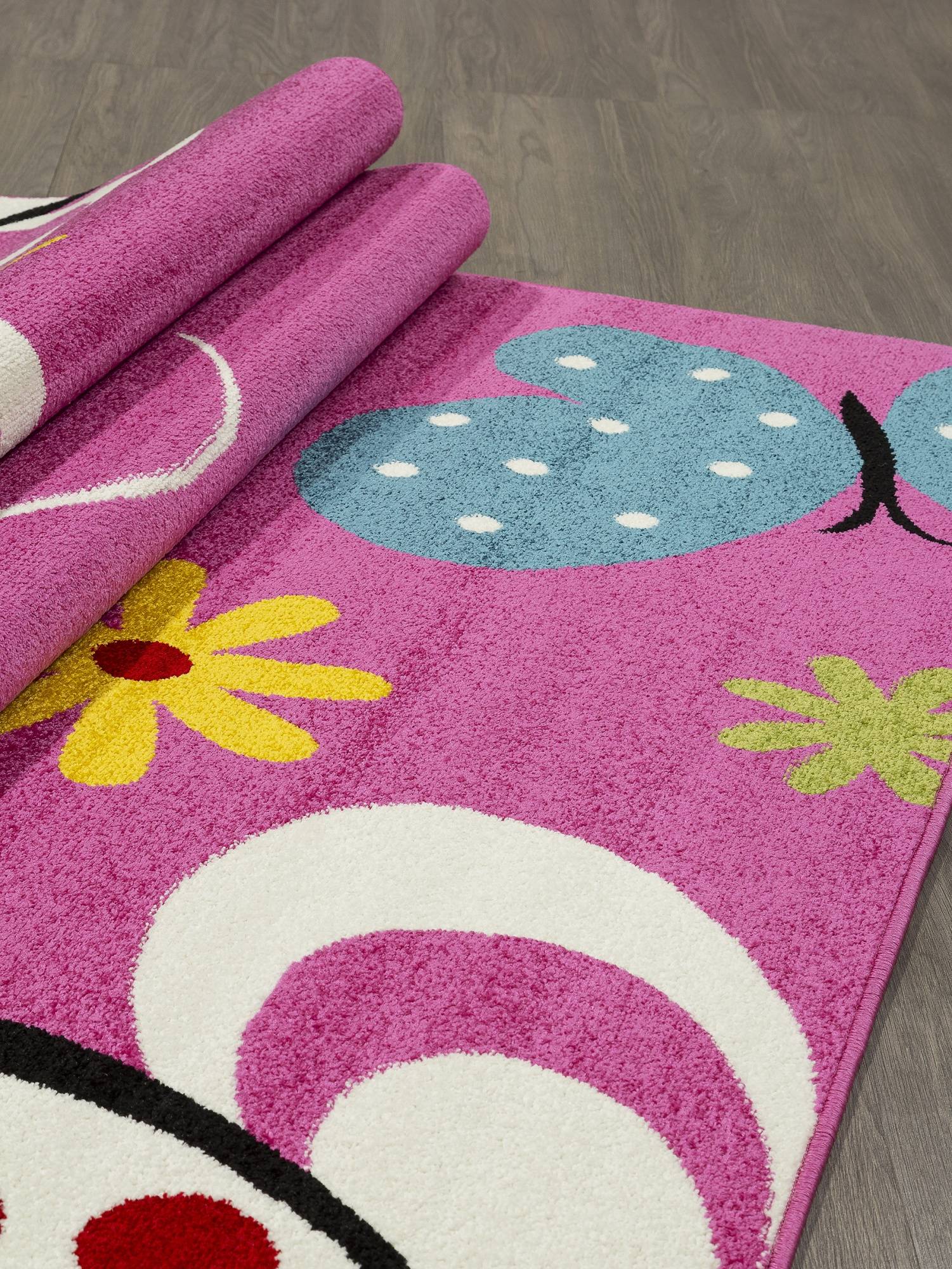 Яркий, разноцветный ковер с цветами и бабочками, отличное решение для детской комнаты. Это ковровое изделие имеет высокое качество изготовления и полную гипоаллергенность.