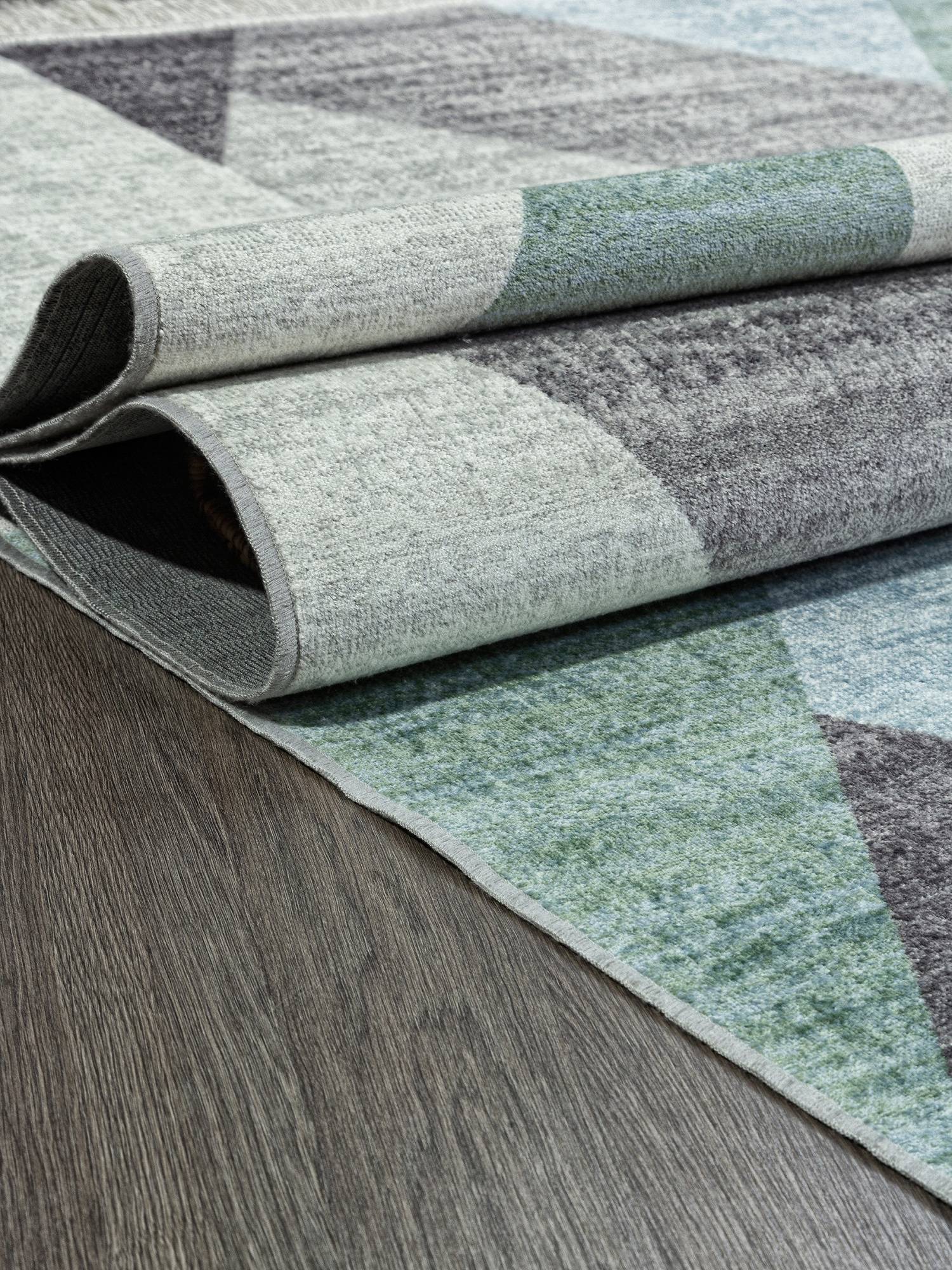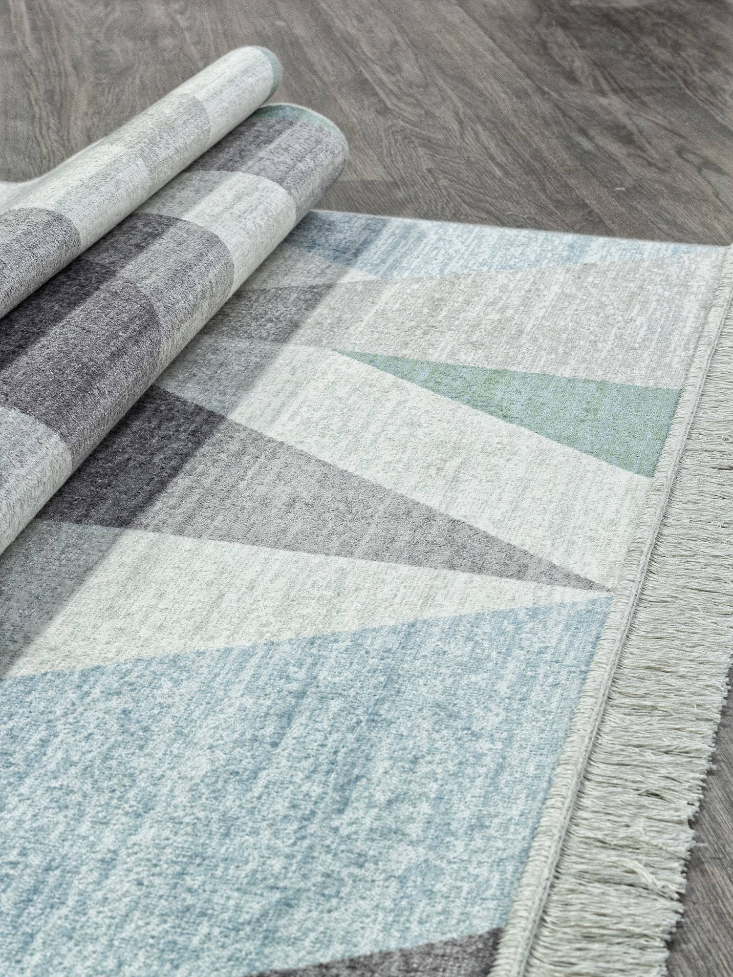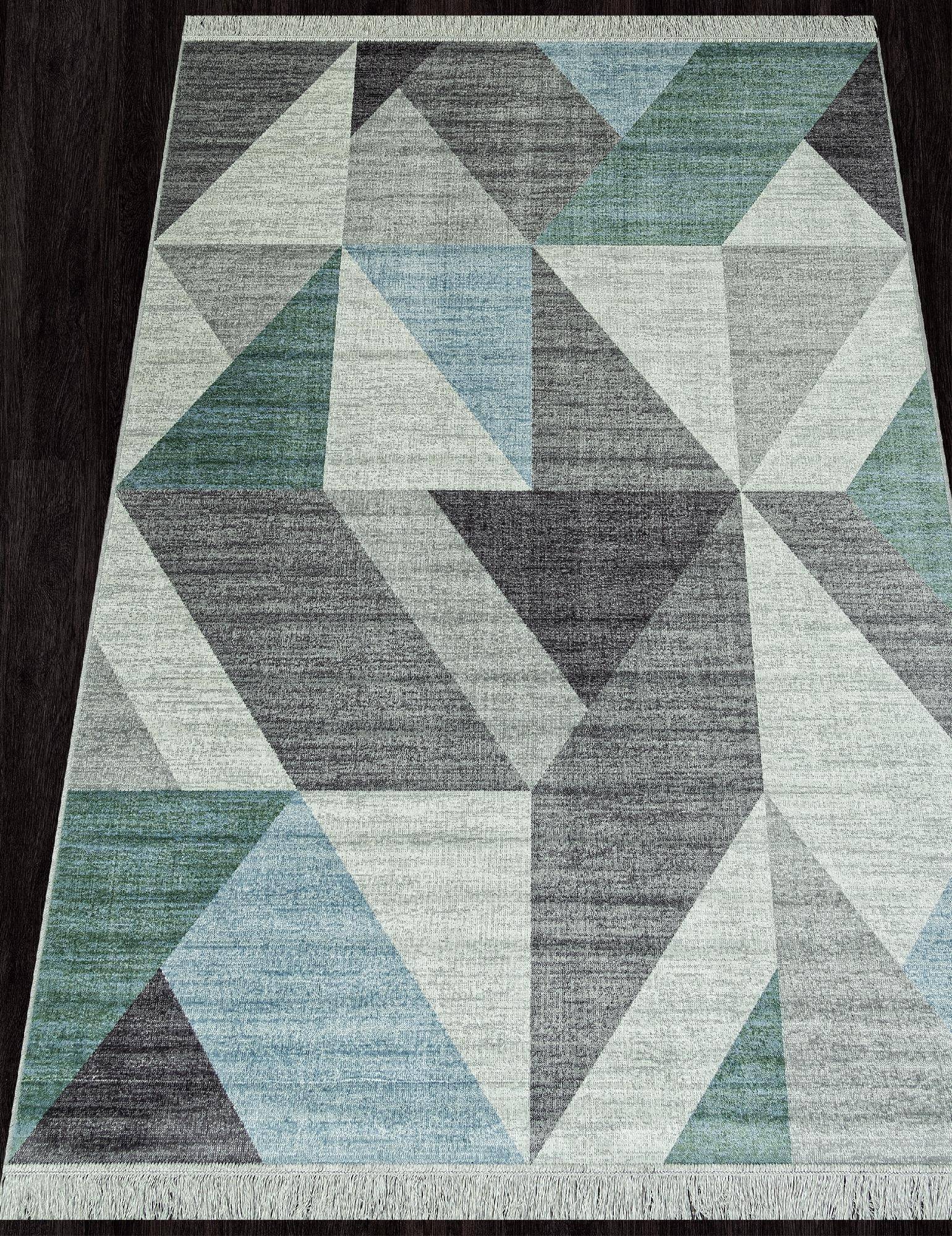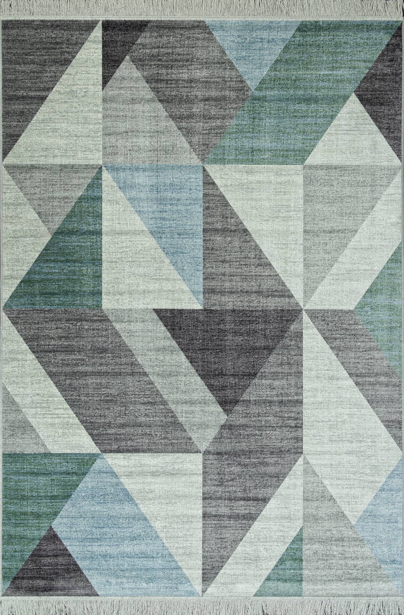 Красивый, современный ковер с геометрическим орнаментом и интересной расцветкой в холодных тонах. Этот ковер подойдет практически под любой современный интерьер.