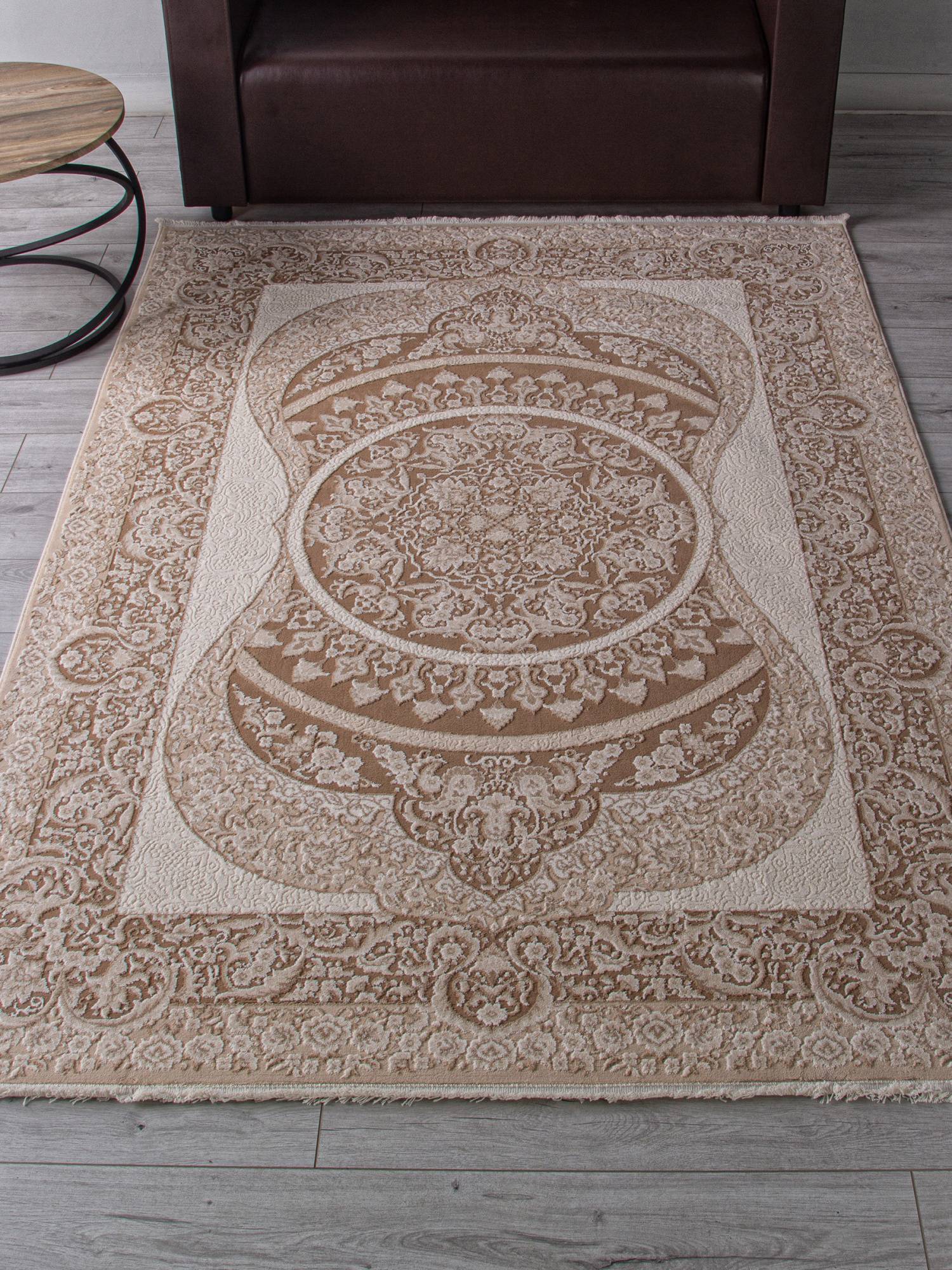Детализированный орнамент, приятный рельефный ворс и нейтральная расцветка в теплых тонах. Этот ковер будет хорошим украшением для интерьера гостиной или зала.