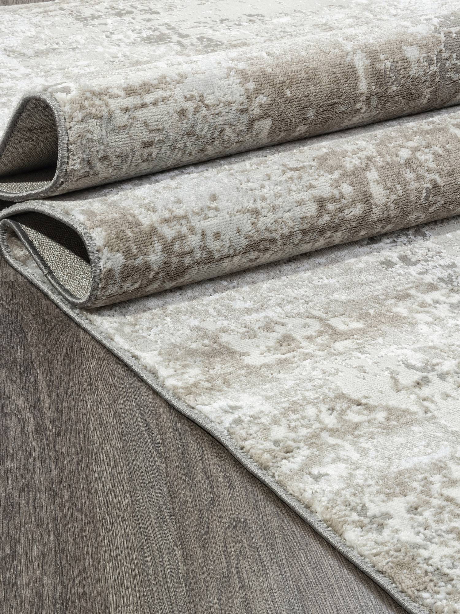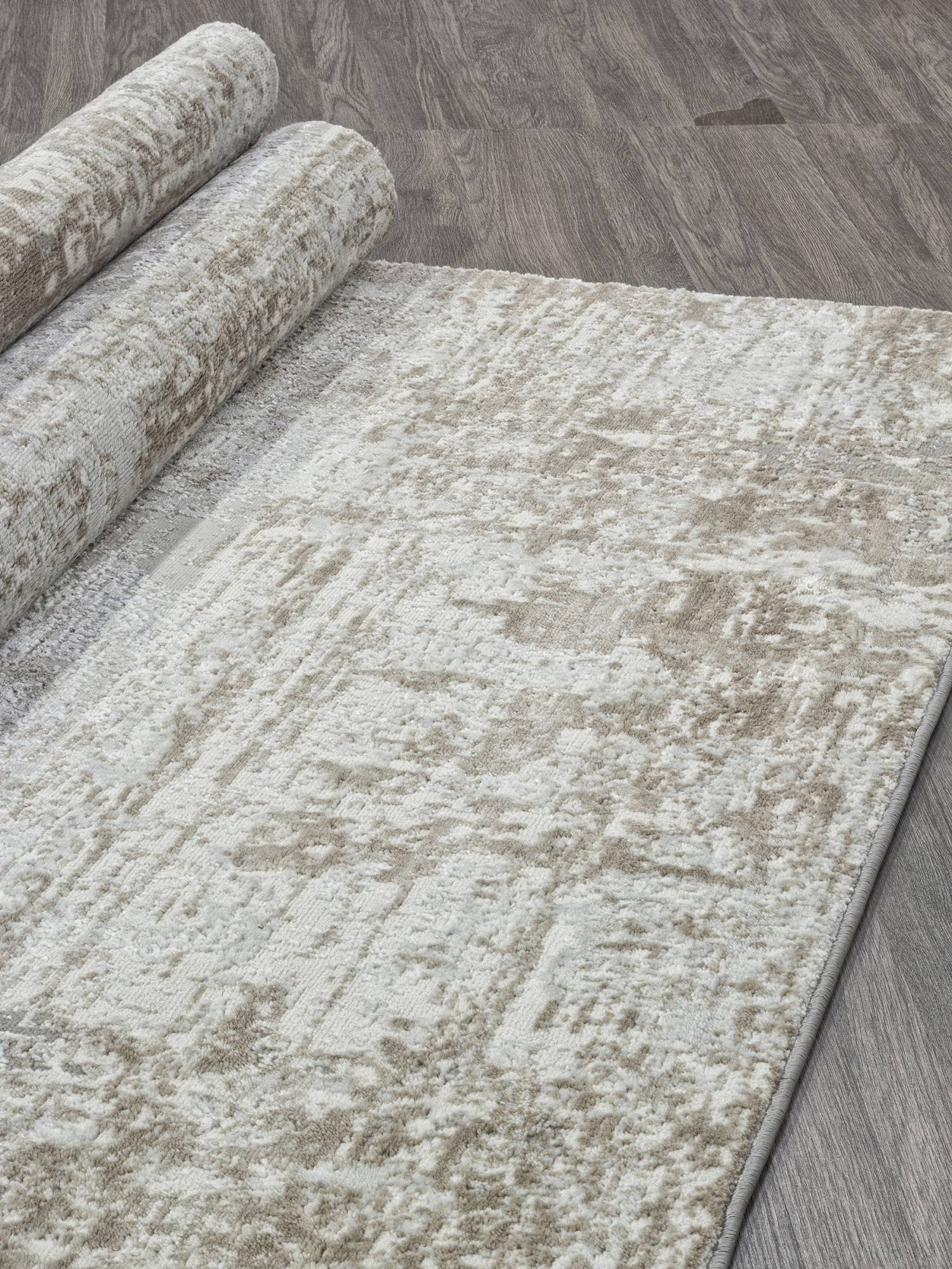 Серо-бежевая расцветка с интересным абстрактным рисунком позволяют этому ковру стать красивым украшением для интерьера вашего дома.