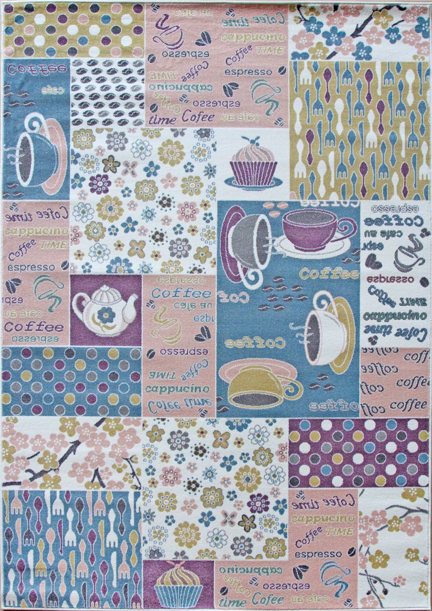 Красивый, яркий, разноцветный ковер из полипропилена в современном стиле. Это ковровое покрытие имеет средний ворс - 10 миллиметров, поэтому подойдет для гостиной или обеденной зоны.
