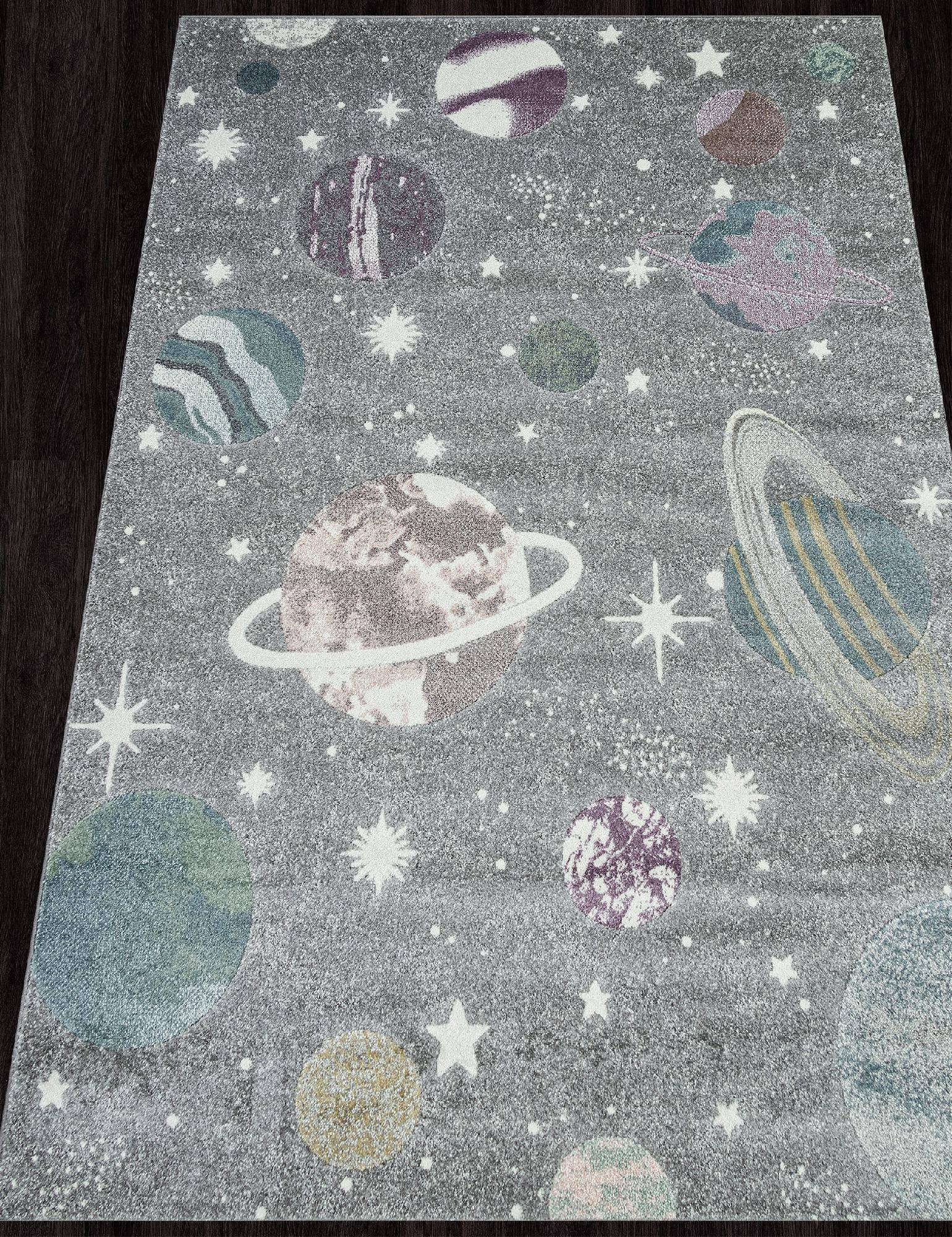 Красивый ковер в темной расцветке с рисунком космоса и планет. отлично подойдет в любую детскую комнату.