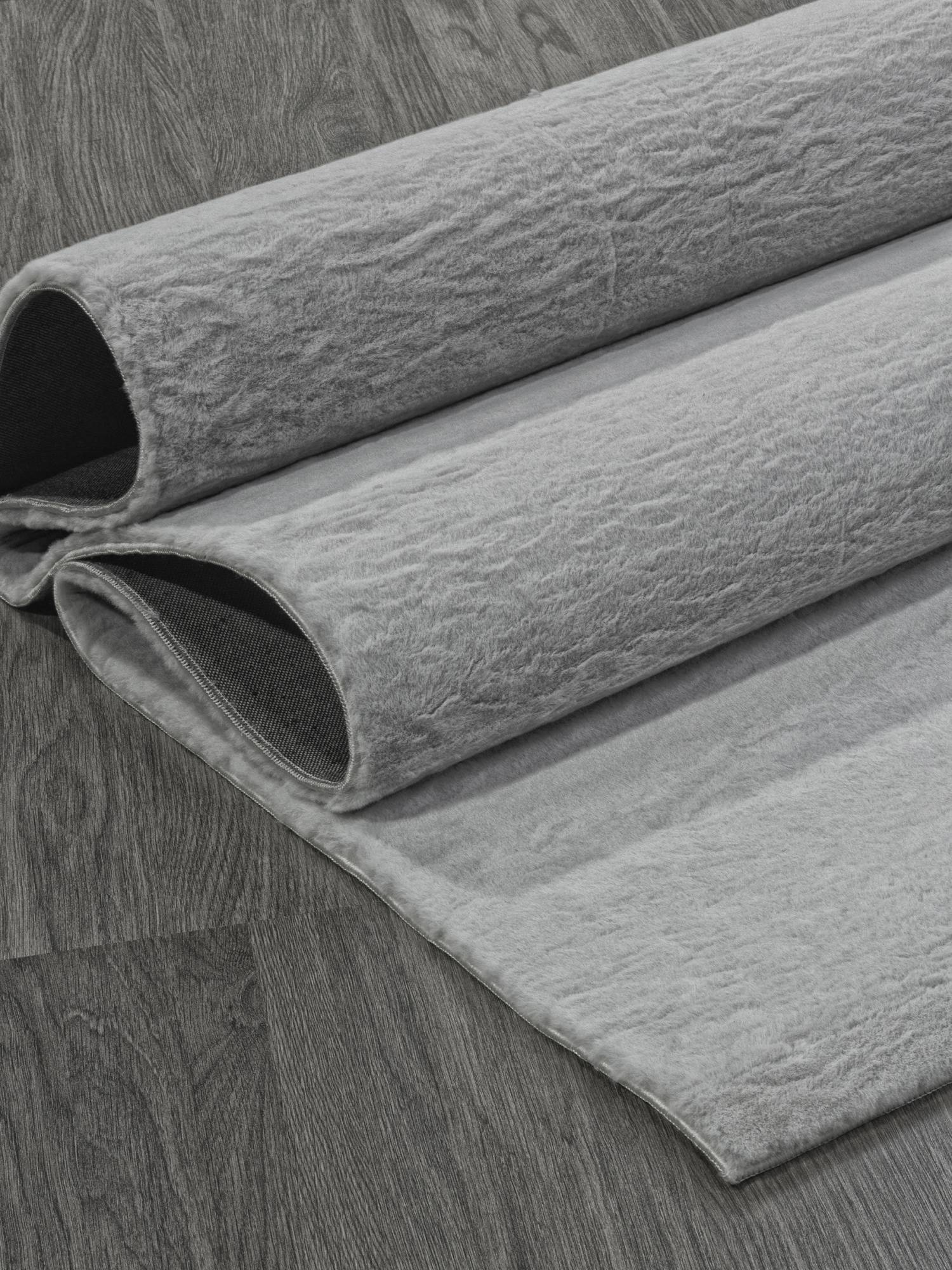 Красивый, однотонный серый ковер из полиэстера. Отлично дополнит современный лаконичный интерьер.