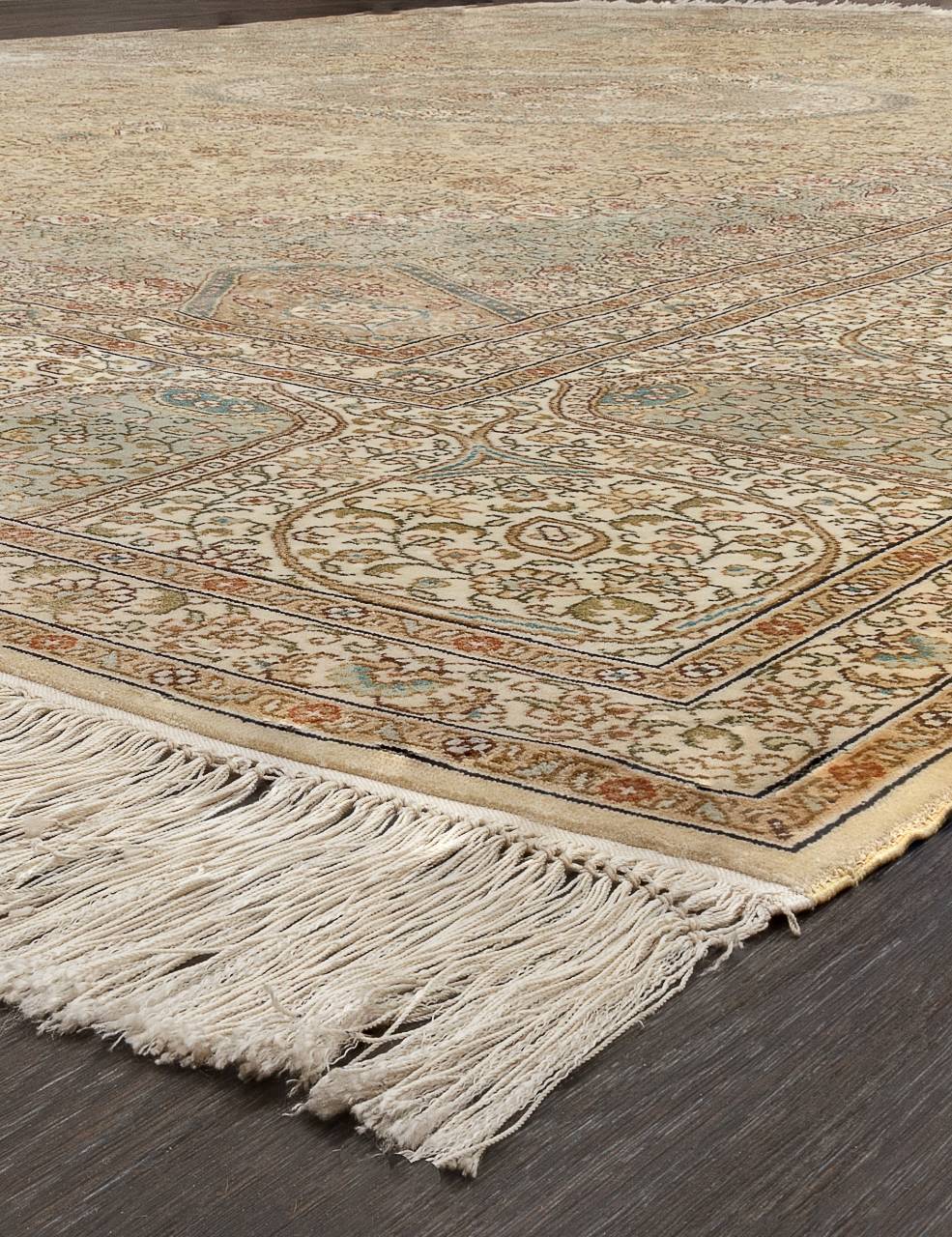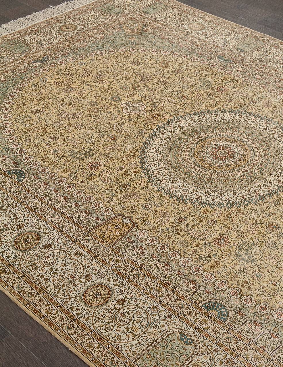 Шелковый квер ручного изготовления в светлых кремовых тонах и орнаментом который можно разглядывать часами. Такое ковровое изделие отлично украсит любой интерьер.