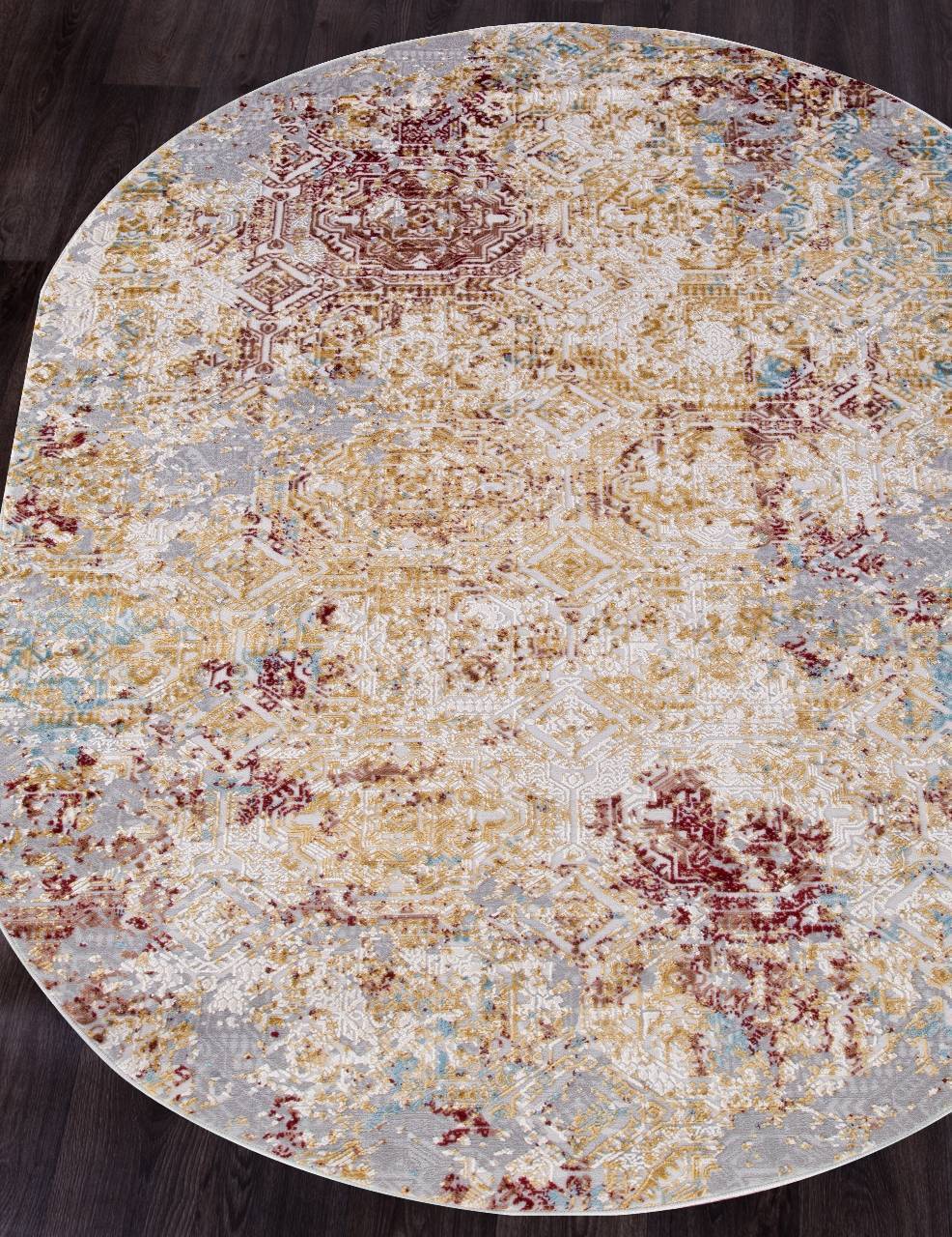 Рельефный орнамент и овальная форма, а также стильная расцветка этого синтетического ковра позволяют ему неплохо вписываться в любой современный интерьер.