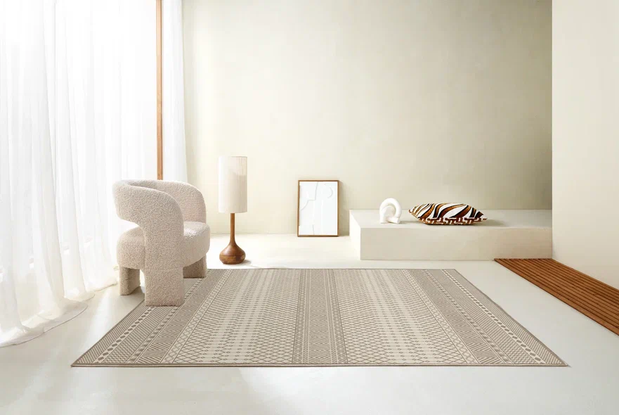 Стильный ковер с геометрическим рисунком станет замечательным дополнением к интерьеру в стиле бохо.