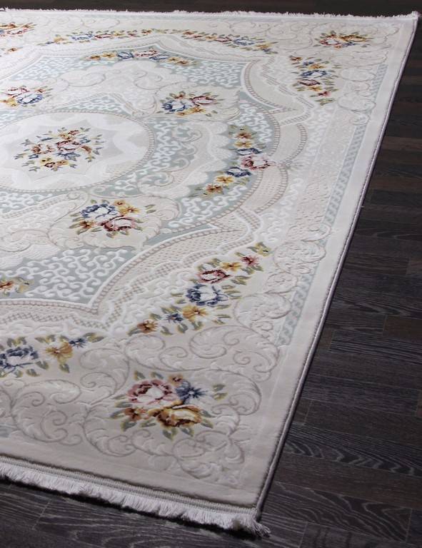 Светлый акриловый ковер с рельефным орнаментом и цветочными элементами. Такой ковер сможет украсить гостиную или зал в любом современном интерьере.