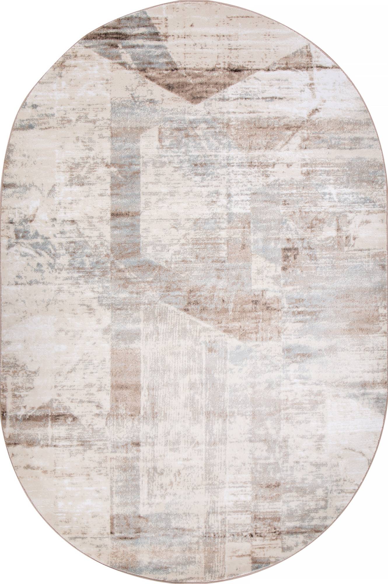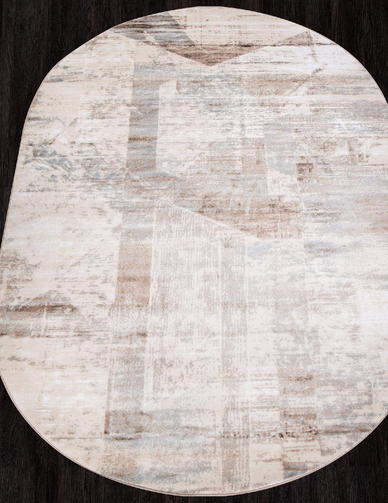 Абстрактный рисунок с геометрическими элементами, овальная форма и светлая расцветка помогает этому ковру быть хорошим украшением для гостиной или зала.