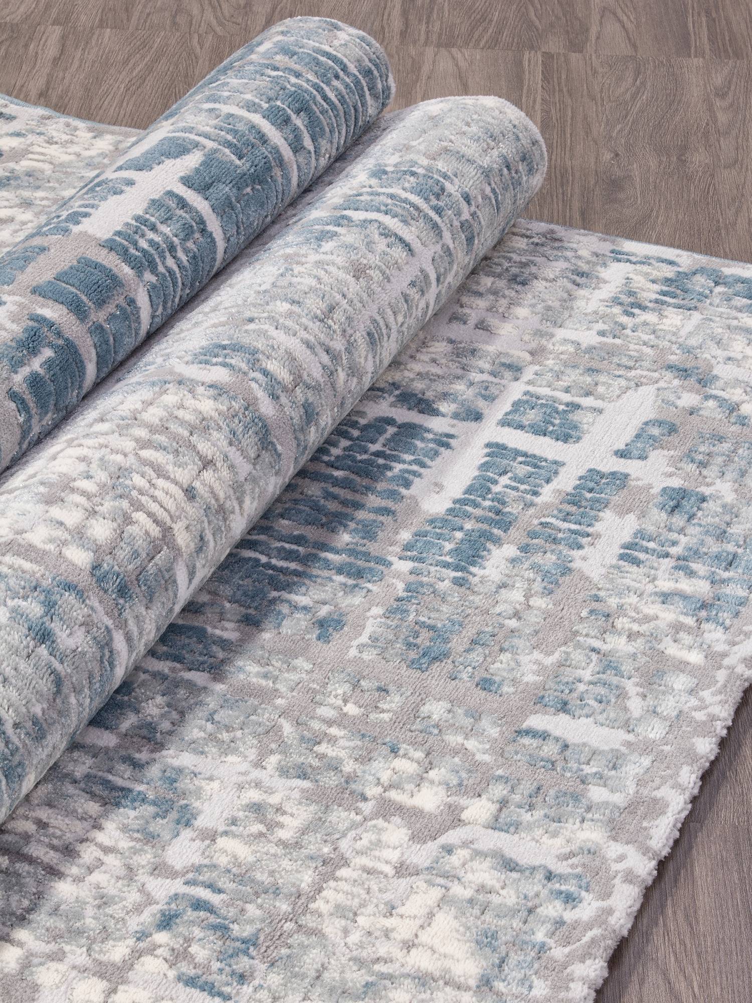 Цветовая палитра в серых и синих тонах, абстрактный рисунок и высокое качество изготовления позволяют этому ковру стать оригинальным дополнением к любому интерьеру.